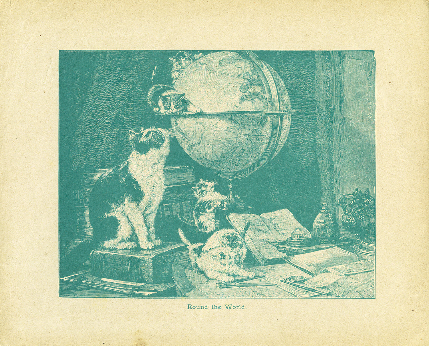 This particular page illustrated a poem by Lady Constance Arbuthnot entitled Around the world, which talks about kitten playing on a professor's desk and climbing to the top of the world on the globe under the watchful eye of the mother. Look at their little faces. Aren't they cute?