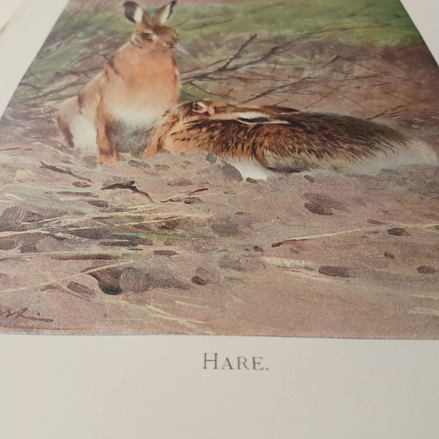 This little vintage print is in very good condition, with a slight yellowing of the paper at the edges. It shows a pair of hares in a field. One hair is sitting upright, with its ears pointed and the other one is lying on the ground and looks like it hasn't shed its long thick winter fur yet. The printing techniques of the time gives them a very soft aspect.