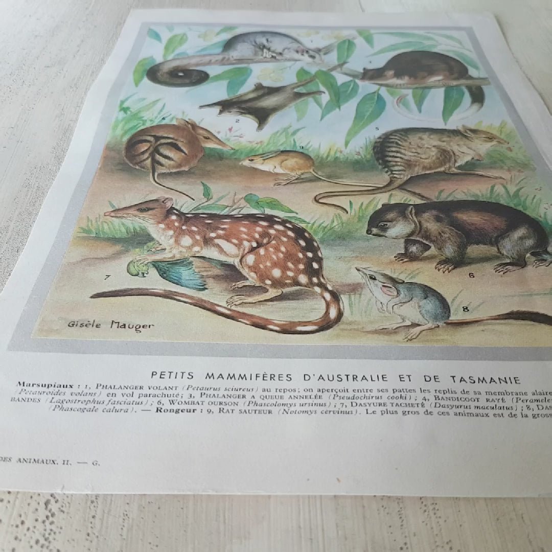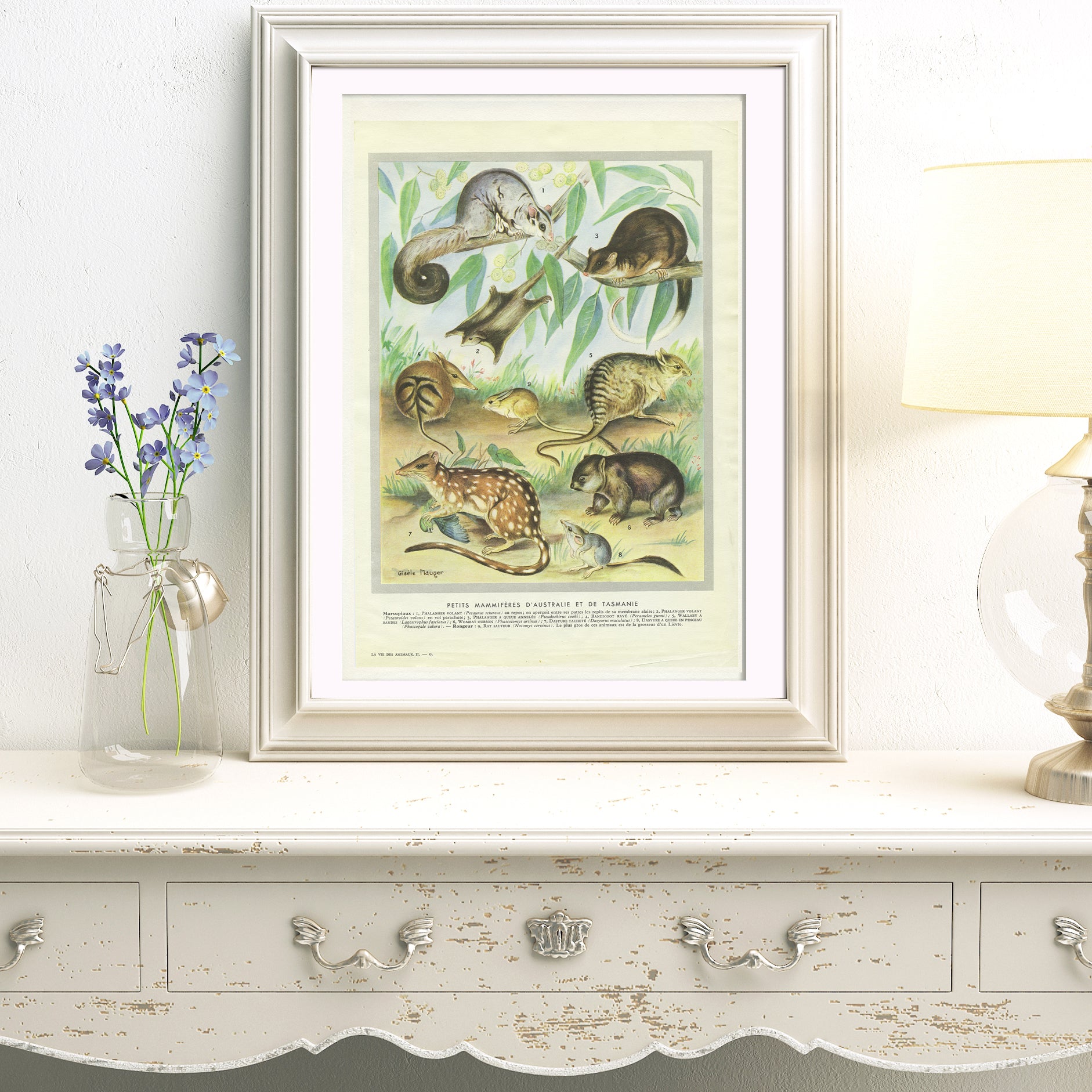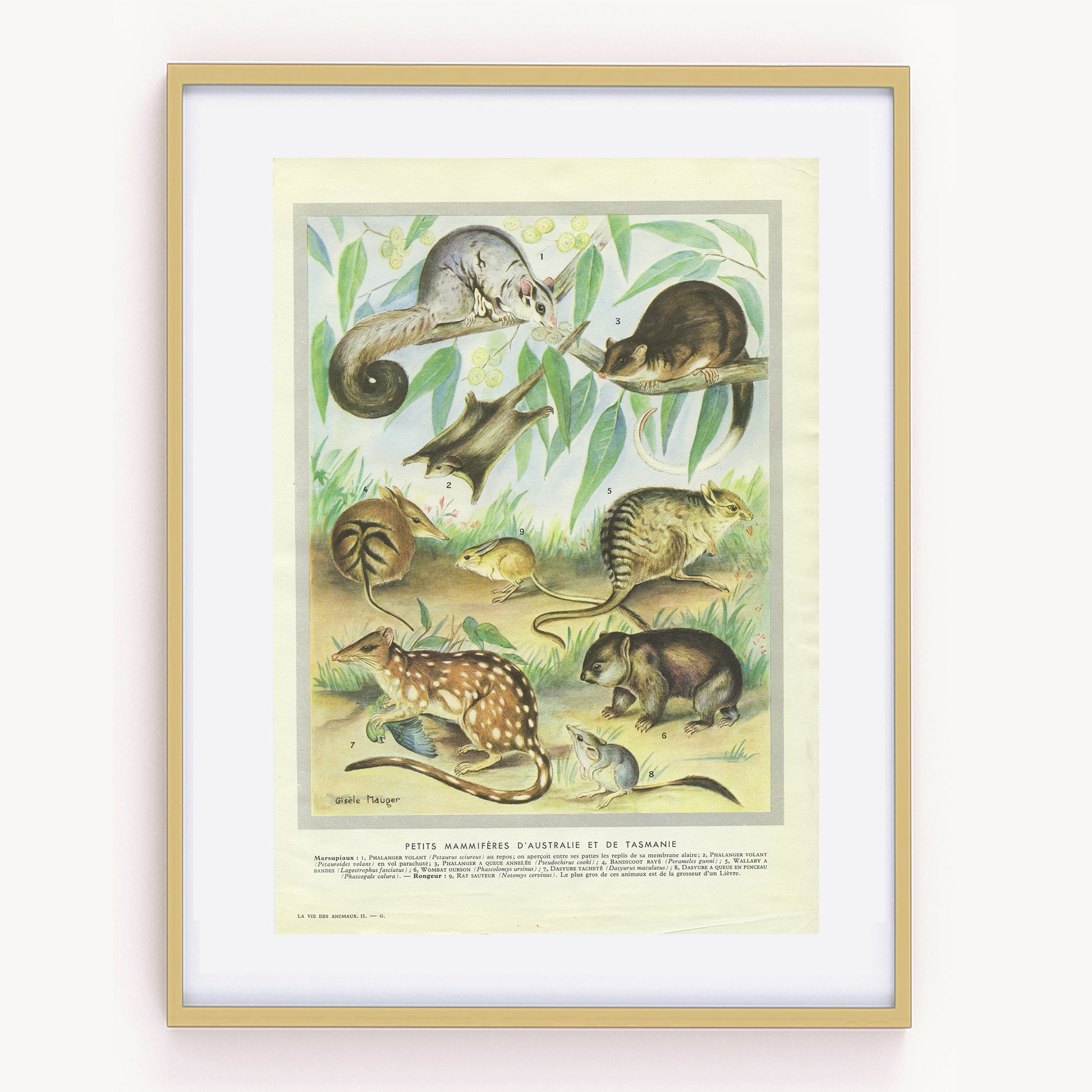 This beautiful authentic vintage animal print features a selection of small marsupials and rodents from Australia and Tasmania, identified by their French names at the bottom of the page. Among them are the Phalanger, Bandycoot, Wallaby, Wombat and the fawn hopping mouse.