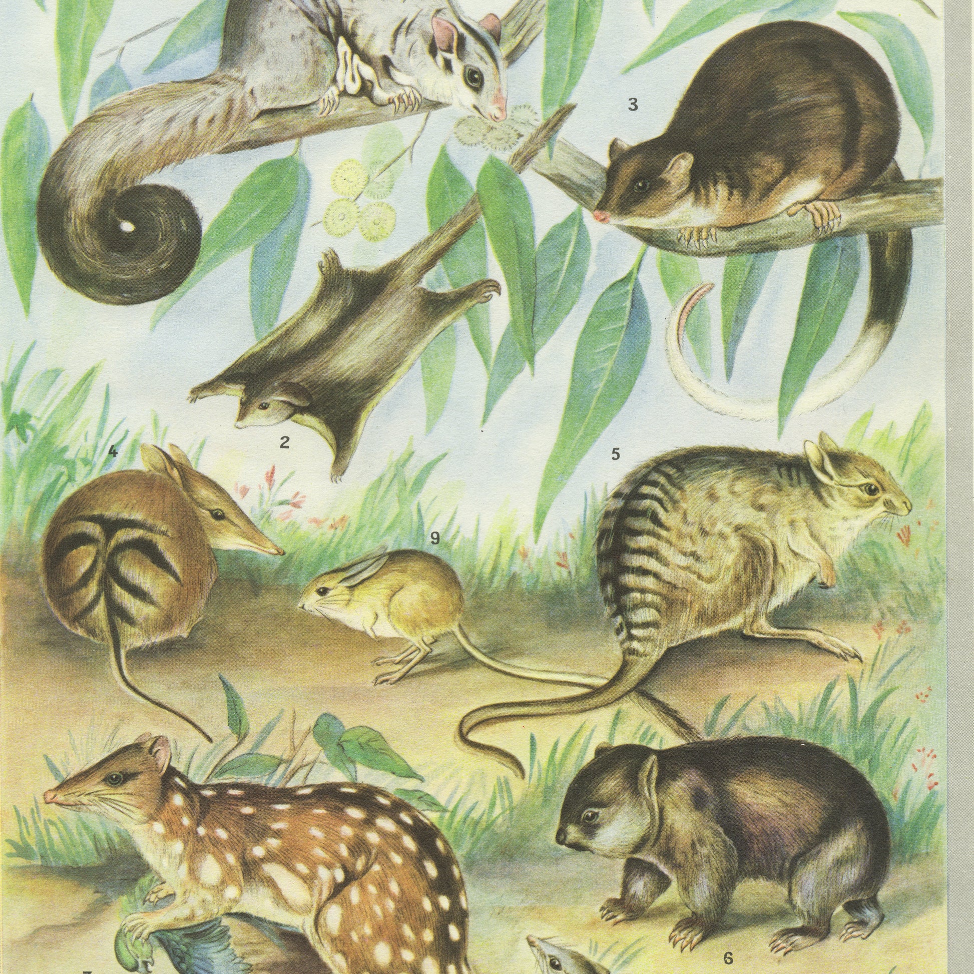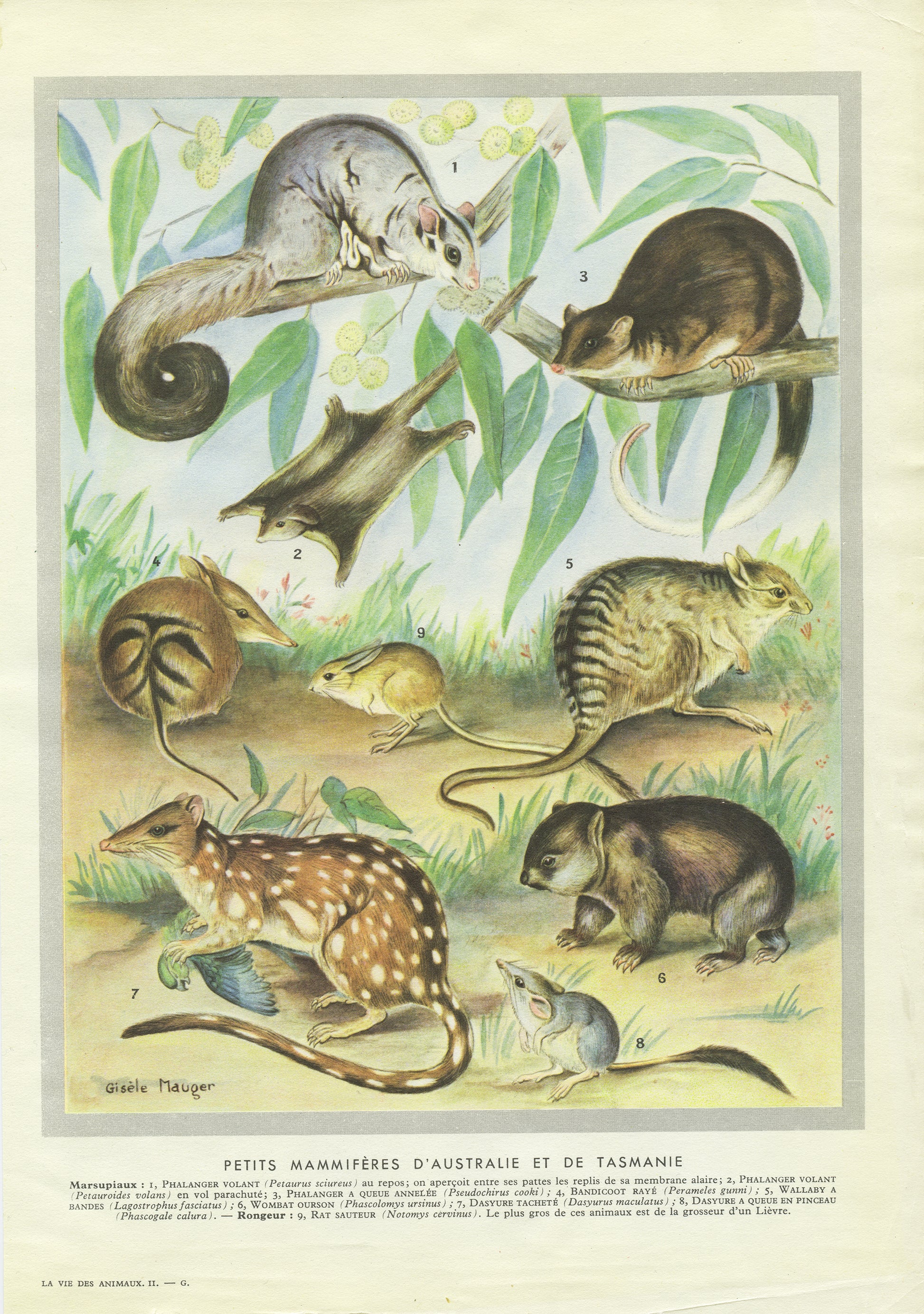 French vintage animal illustration depicting small mammals from Australia and Tasmania.