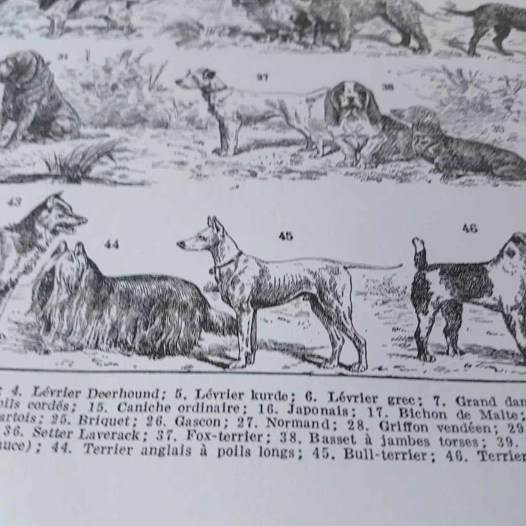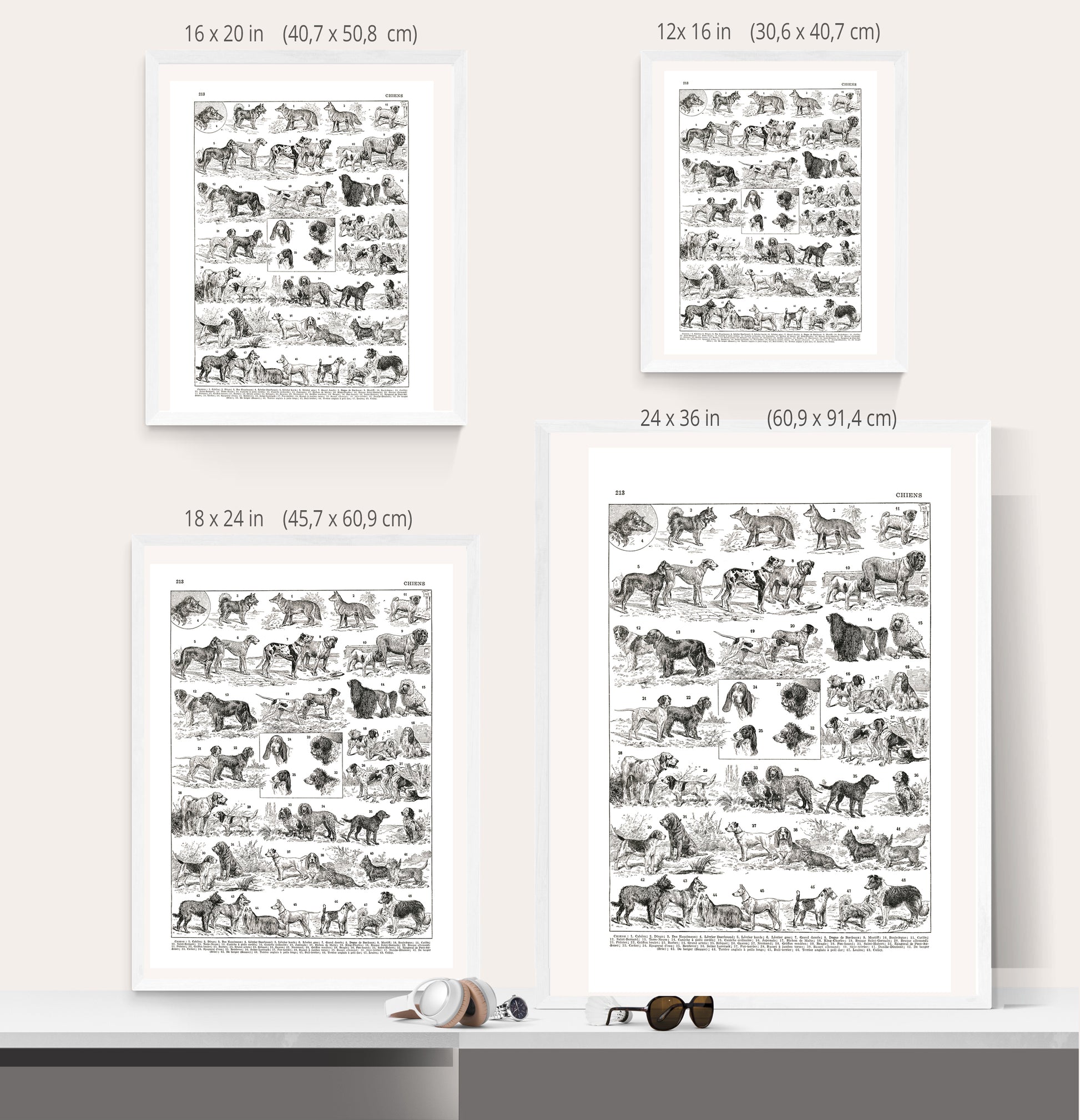 - Large dog breed chart art print created from a 1936 French dictionary plate.