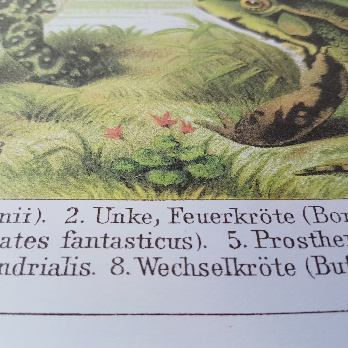 Among the species shown are Peron's tree frog (Hyla Peronii), the European fire-bellied toad (Bombinator igenus), the African reed frog (hyperolius), the red-headed poison frog (dendrobates fantasticus), the Japanese common toad (Bufo formosus), the tiger-leg monkey frog(phyllomedusa hypochondrialis), the Eurasian Palearctic green toad or the edible frog (Rana esculenta). The legend is in German.