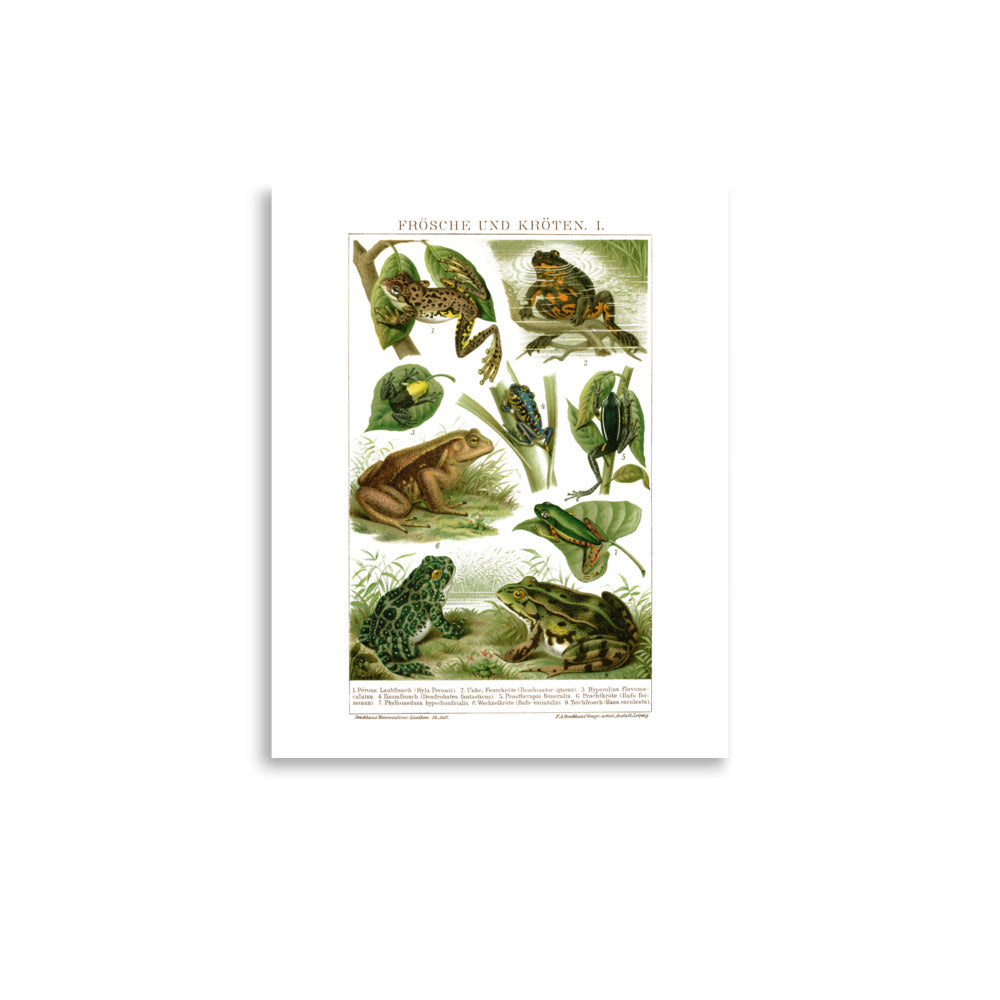 Fascinating antique amphibians poster, created based on a 19th century German Brockhaus dictionary. This fascinating page shows brightly colored illustrations of exotic frogs and toads.