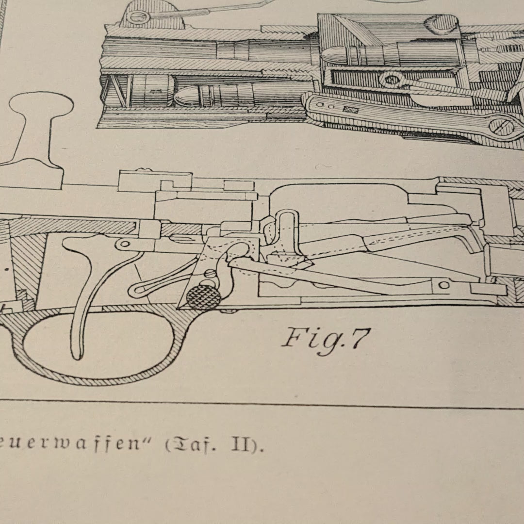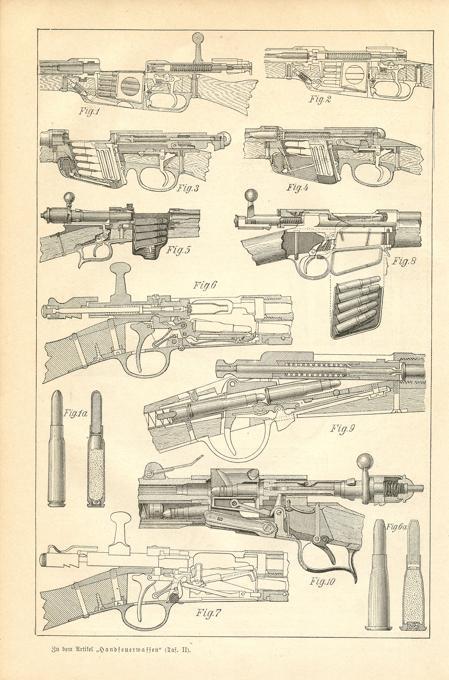 This vintage engraving is in German and shows technical drawing on both sides, showing the mechanisms and bullet design for a selection of the most common firearms in Germany at that period.