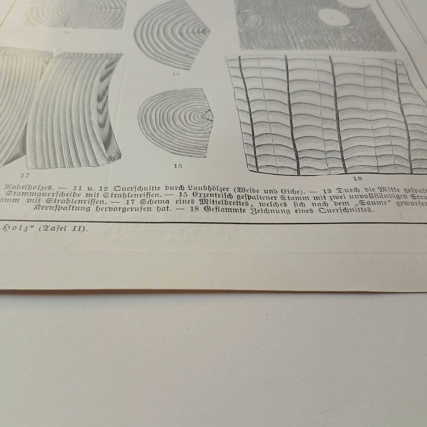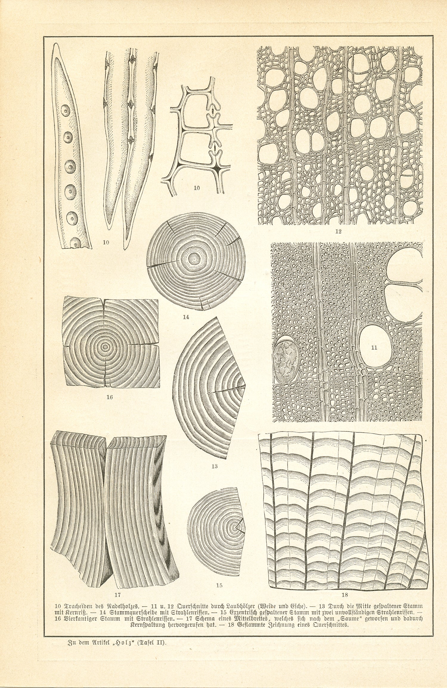This vintage engraving is in German and shows intricately detailed botanical drawings on both sides explaining the structure of tree trunks and bark, from the concentric rings to the microscopic structure of the wood. And isn't that gothic font wonderful?