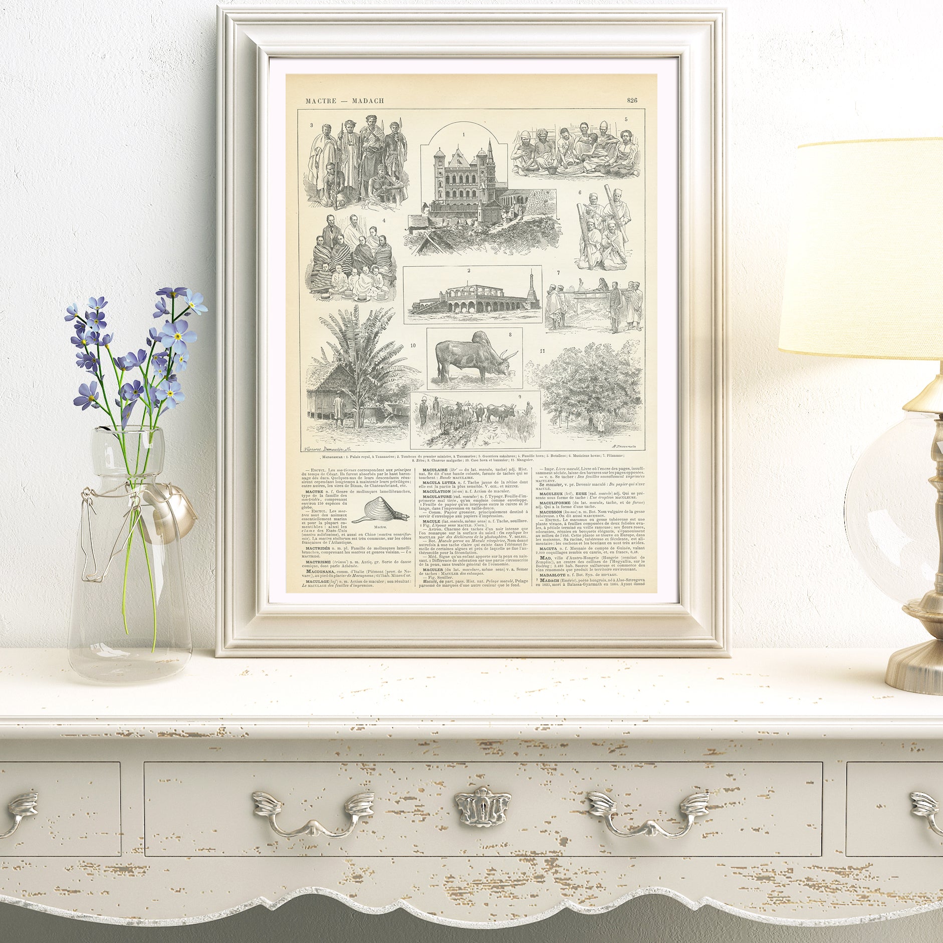Cette carte vintage représente les frontières telles qu'elle étaient à la fin du 19ème siècle. Le verso est imprimé de divers autres articles du dictionnaire et de scènes typiques de Madagascar à l'époque : habitants en costumes traditionnels, architecture, agriculture (manguier) et animaux (zébu).