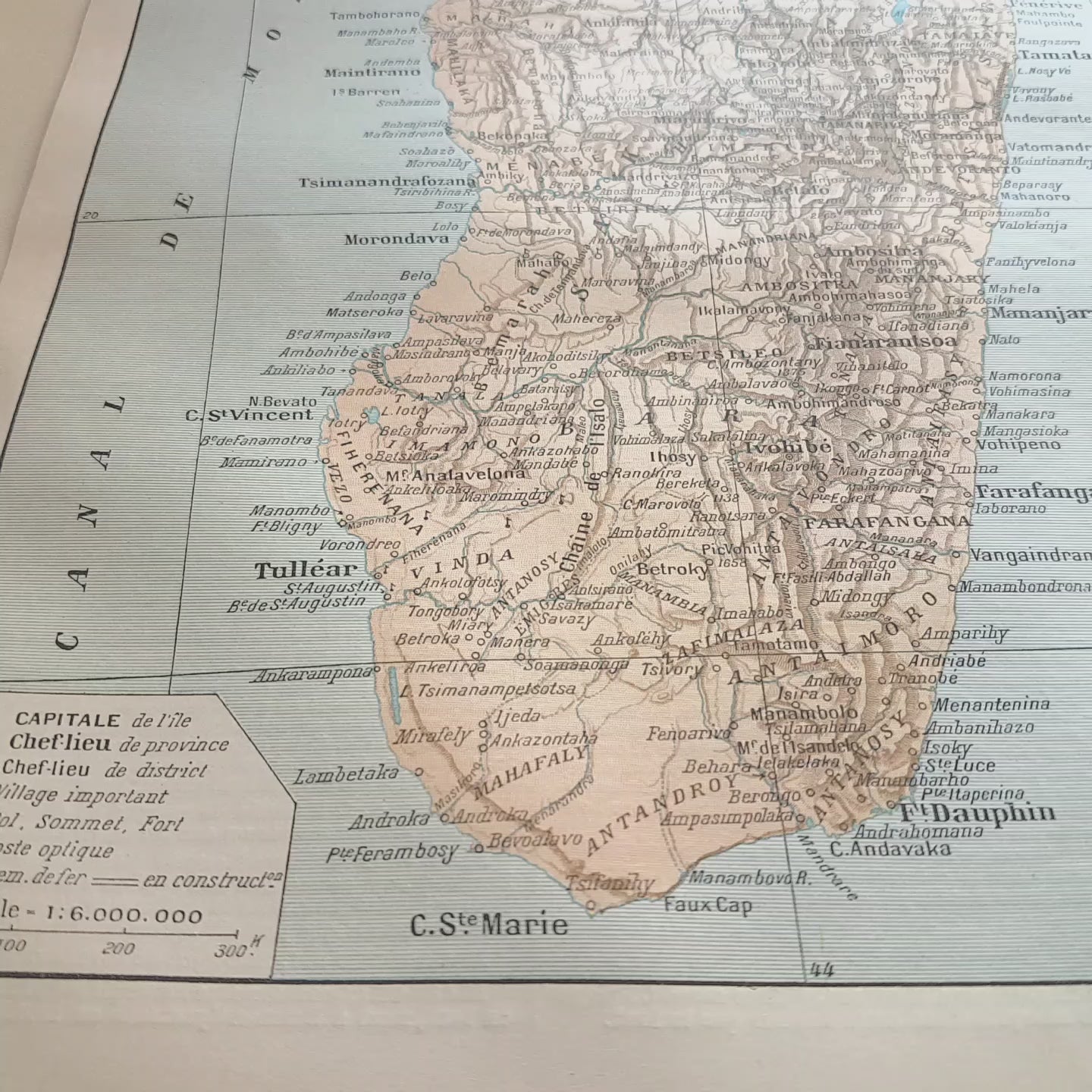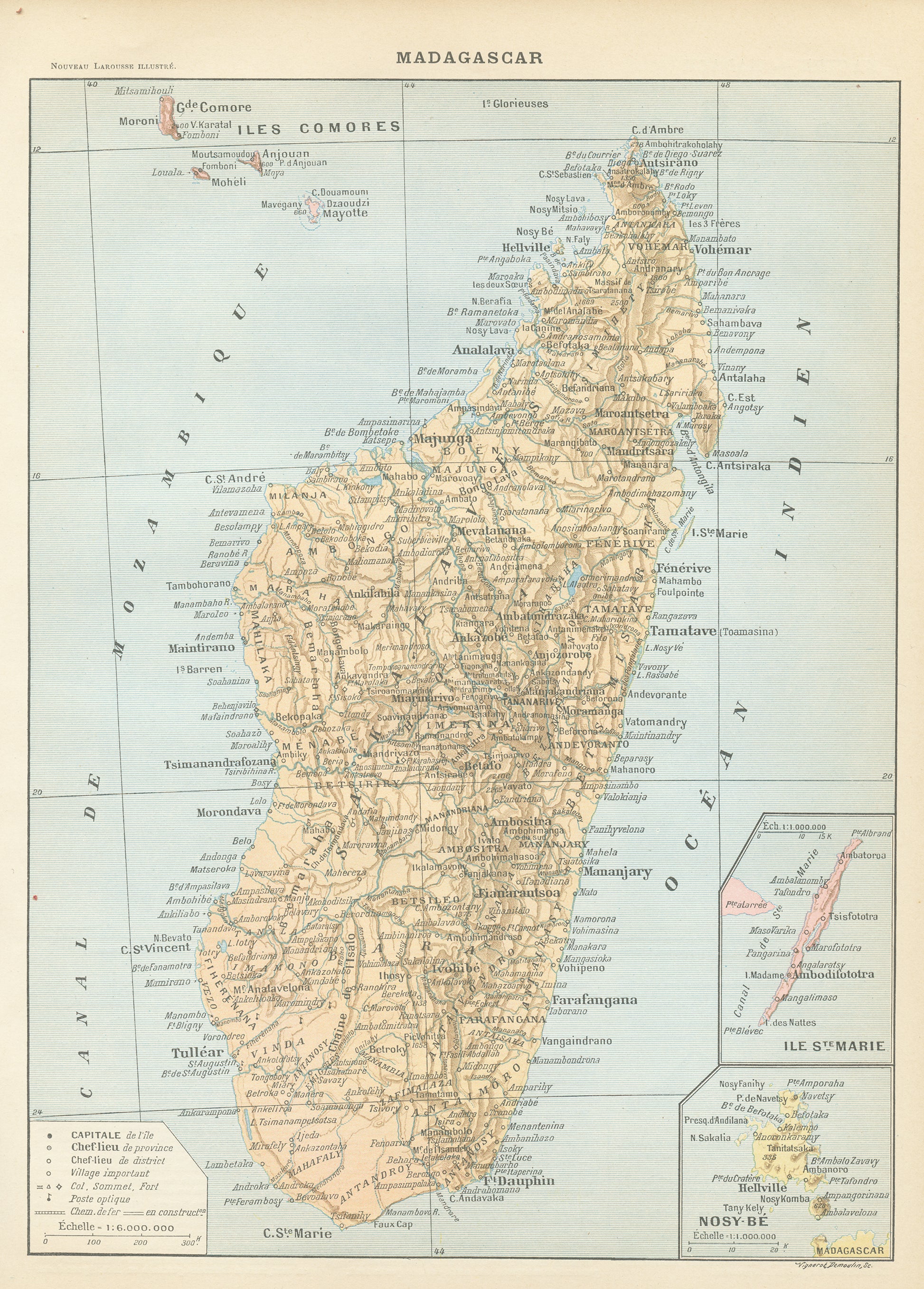 Voici une carte ancienne de Madagascar en couleurs, extraite d'un volume du dictionnaire Larousse Pour tous de 1897 endommagé.