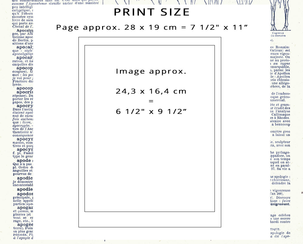 AUTHENTICITE : Il s'agit de planches extraites d'un volume de 1938 endommagé. Le papier est légèrement jauni, en particulier sur les bords mais l'image elle-même est en très bon état. Il s'agit de pages de dictionnaire très fines, avec 1 encoche.
