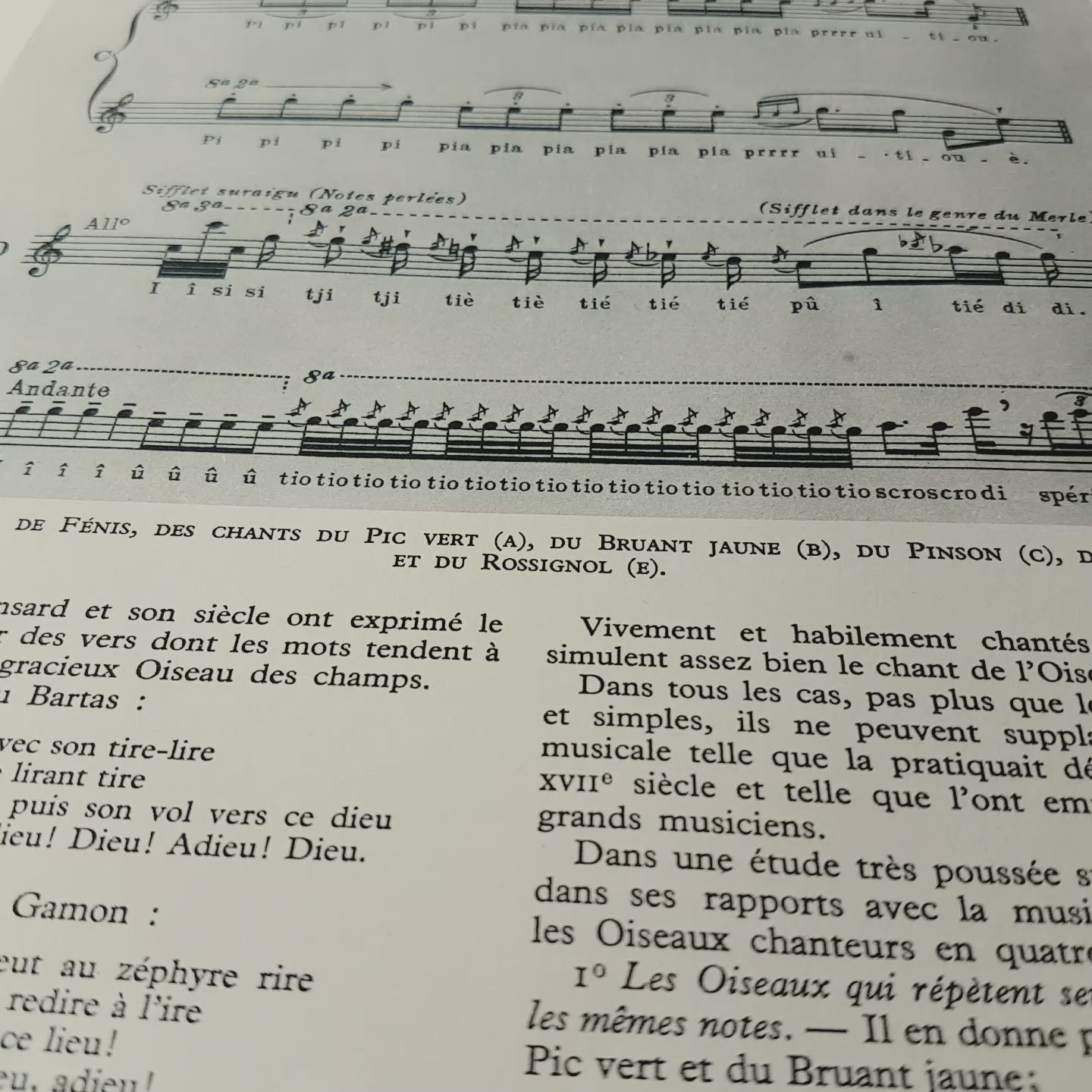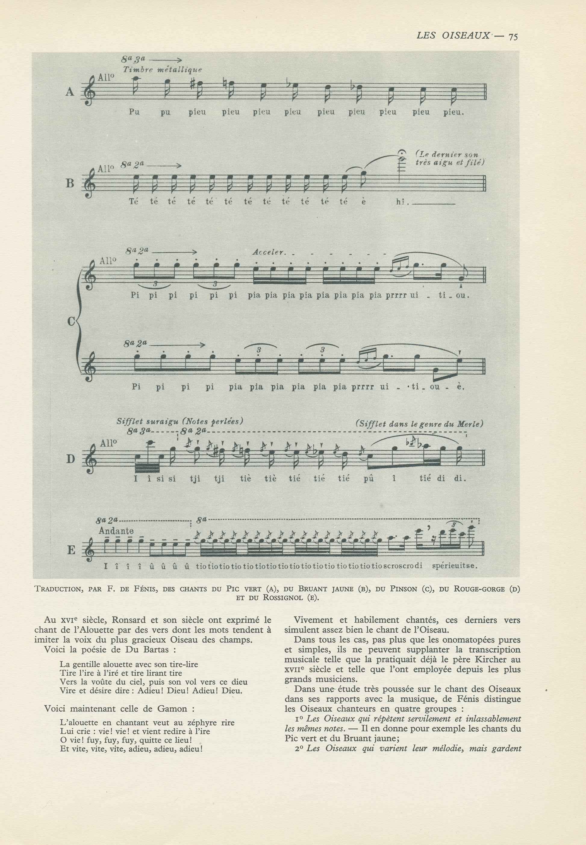 On y voit des traductions par F. de Fénis du chant du pic vert, du bruant jaune, du pinson, du rouge-gorge et du rossignol.
