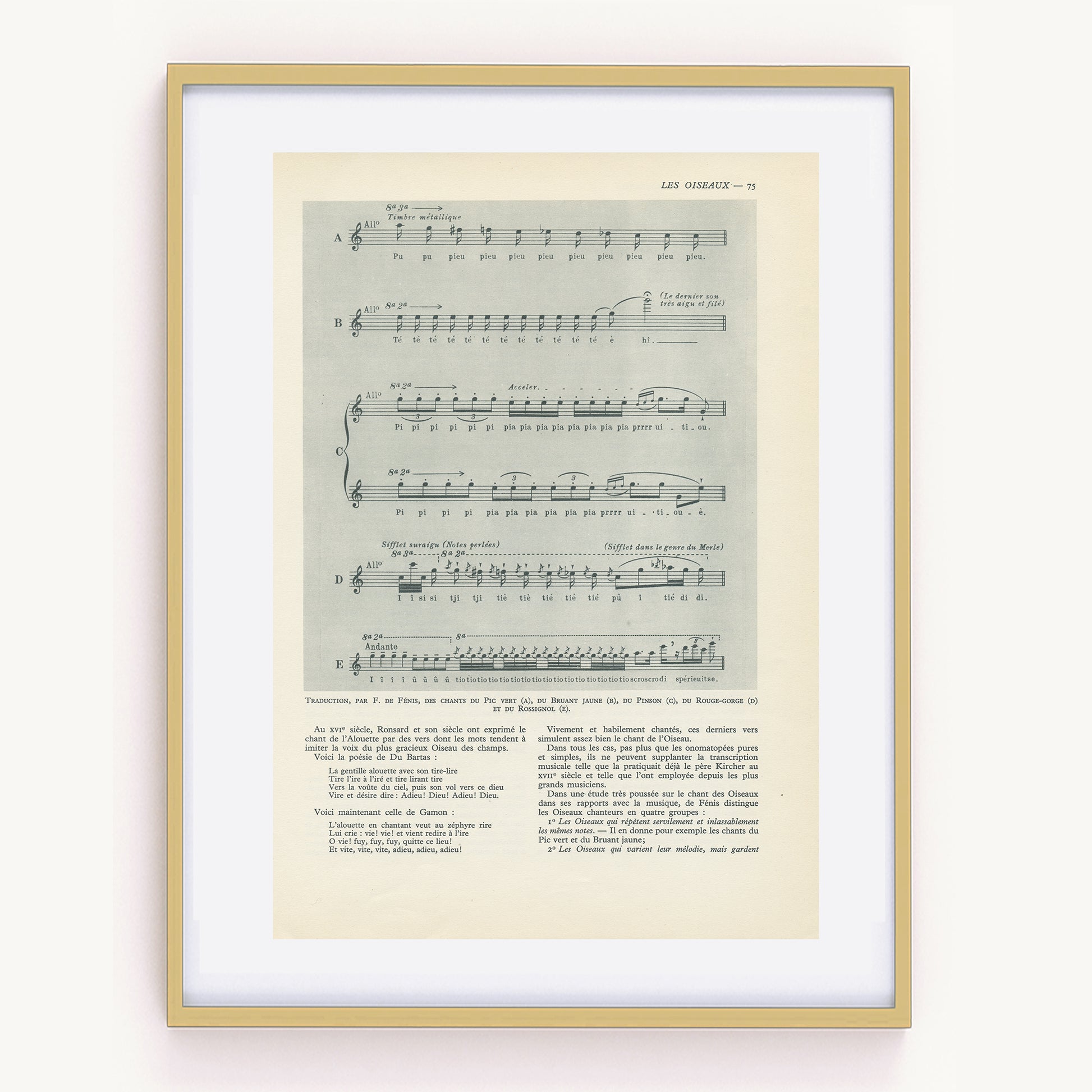 Fascinante petite affiche de 1949 représentant une transcription musicale de chants d'oiseau . Elle est extraite d'un livre intitulé "La vie des animaux" de 1949.