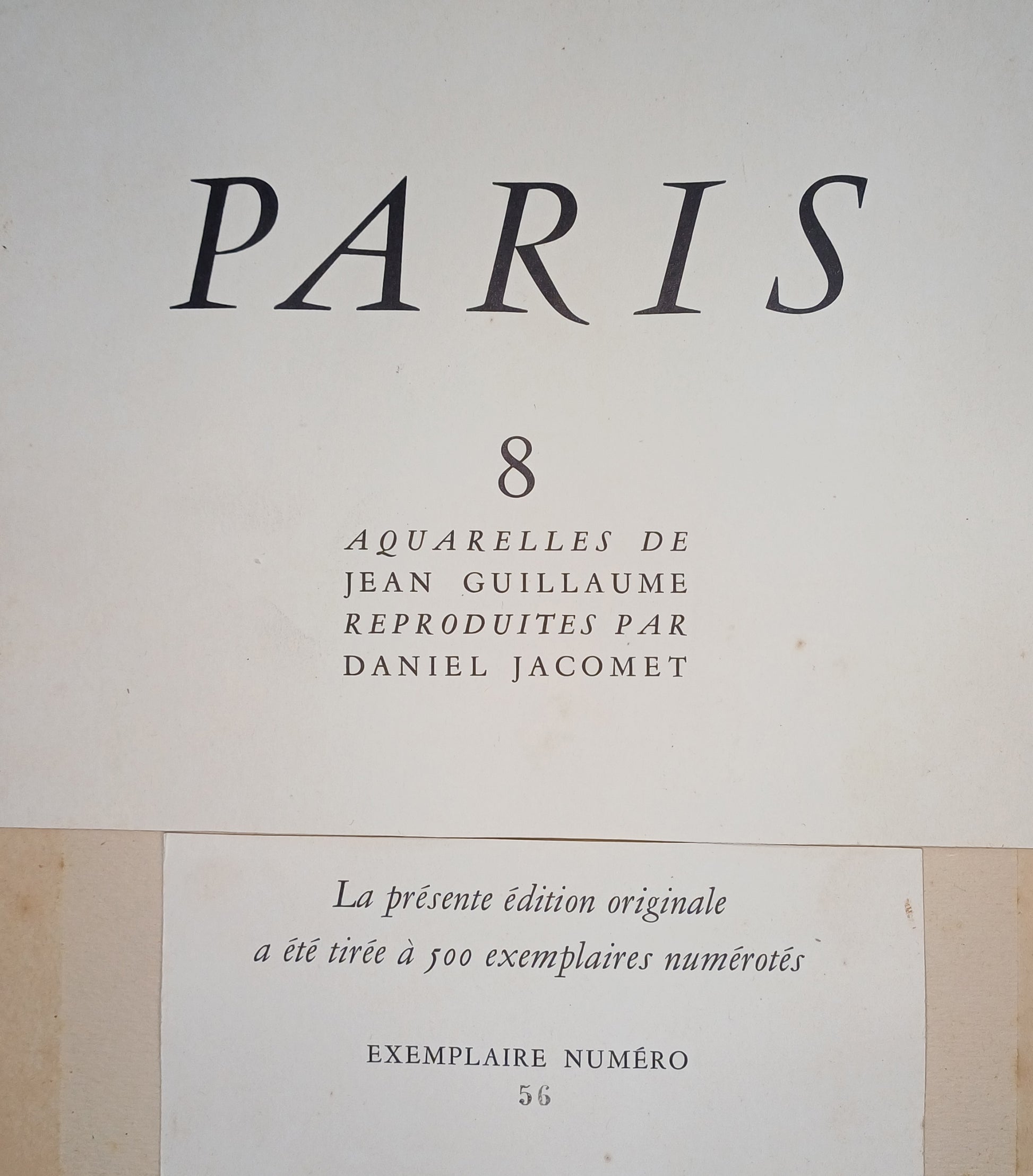 RARE ! Voici la première page d'un recueil de 8 gravures intitulé "Aquarelles de Jean Guillaume reproduites par Daniel Jacomet", imprimé en 1951 en série limitée. Nous avons là l'exemplaire numéroté n°56.