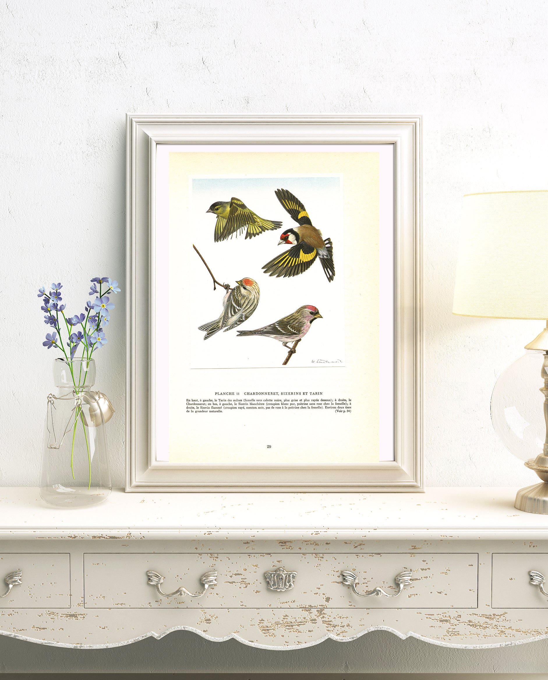 ● Illustration vintage de passereaux montrant 4 espèces : le Tarin des Aulnes, le Chardonneret, le Sizerin blanchâtre et le Sizerin flammé. Cette ravissante image d'oiseau vintage est extraite d'un livre sur les Oiseaux Nicheurs d'Europe de 1961, illustré par Walter Linsenmaier.