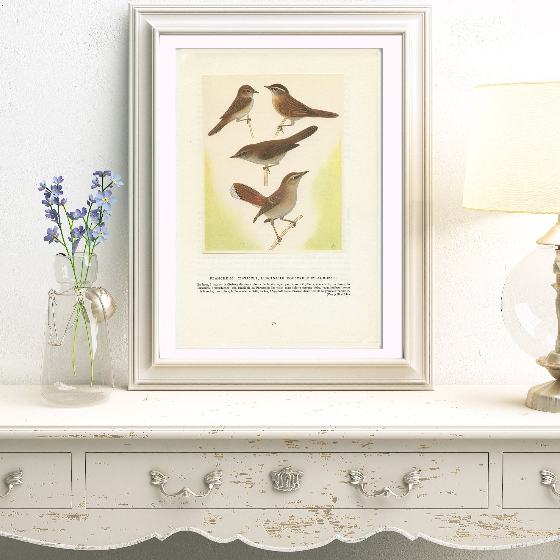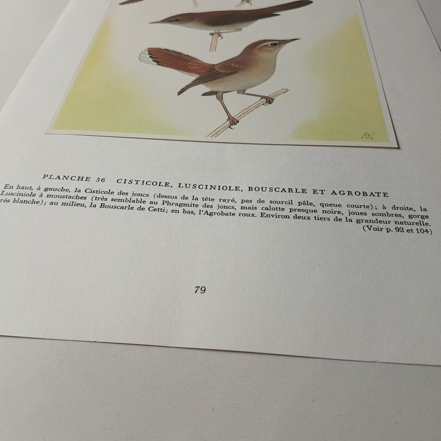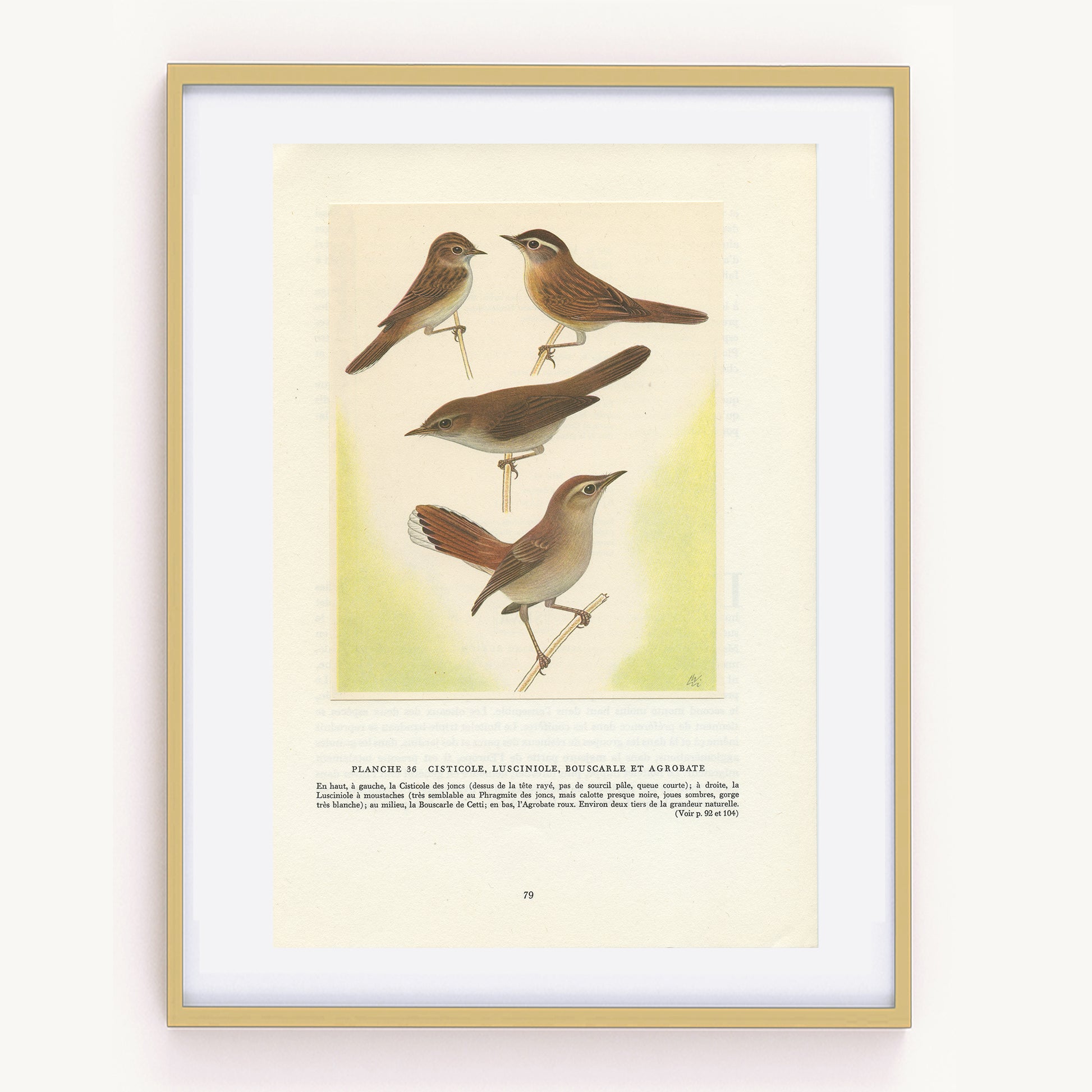 1961 Illustration de cisticole, lusciniole, agrobate et bouscarle vintage.
