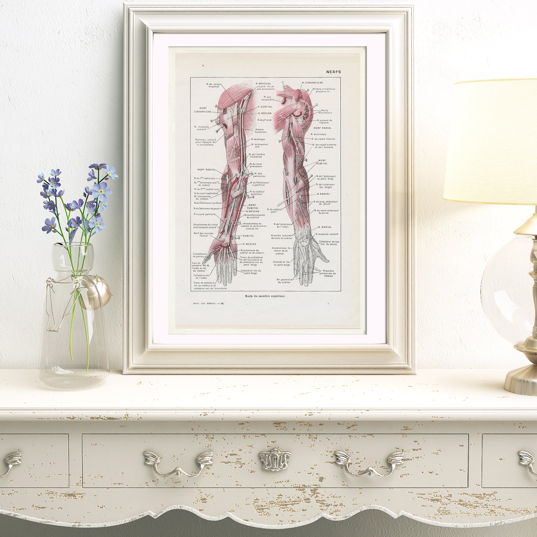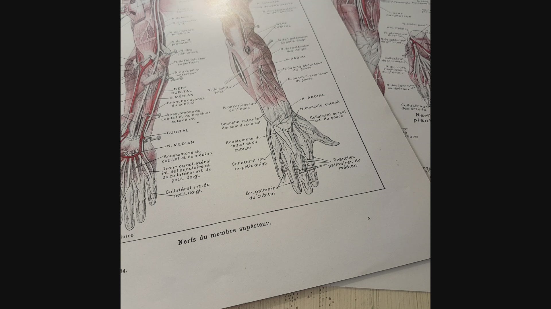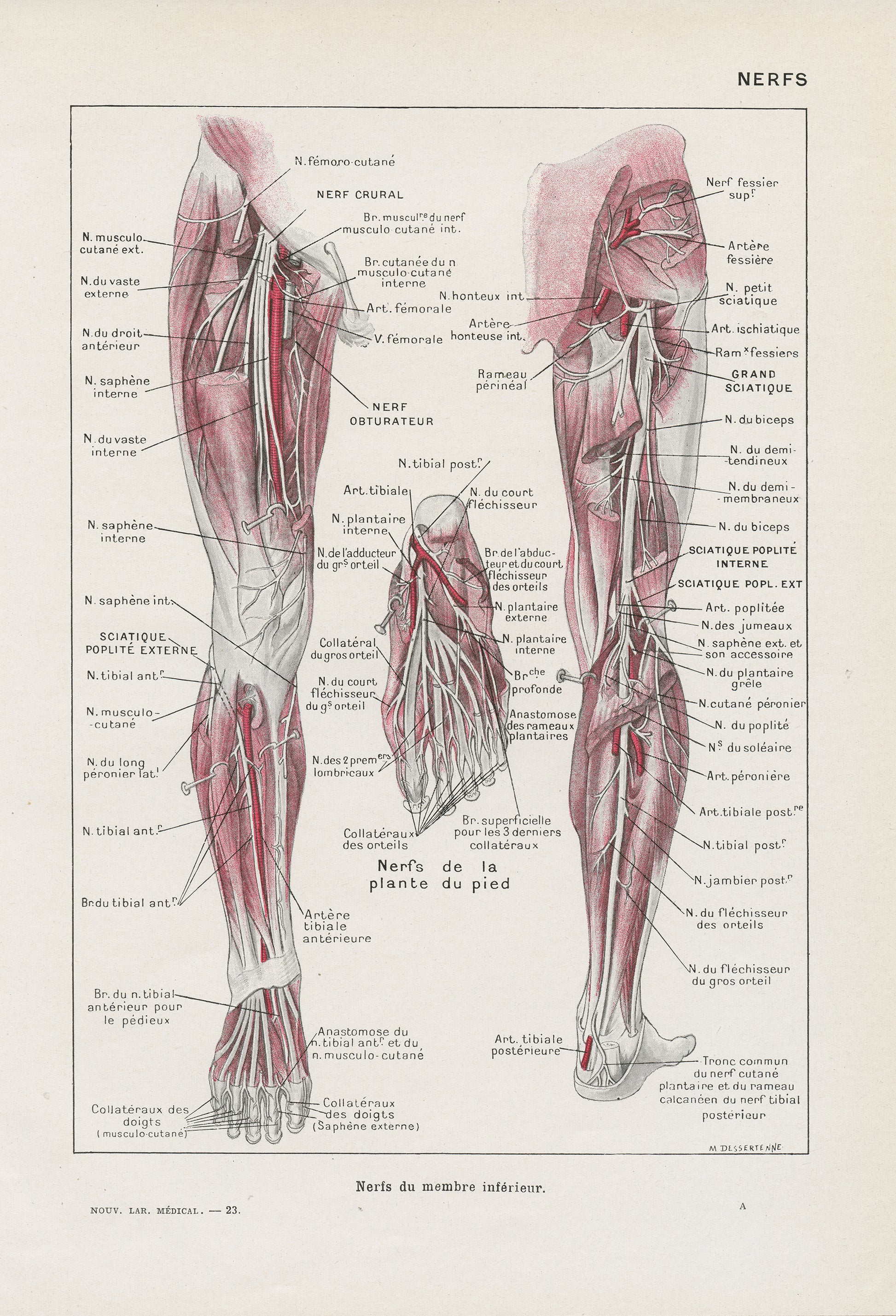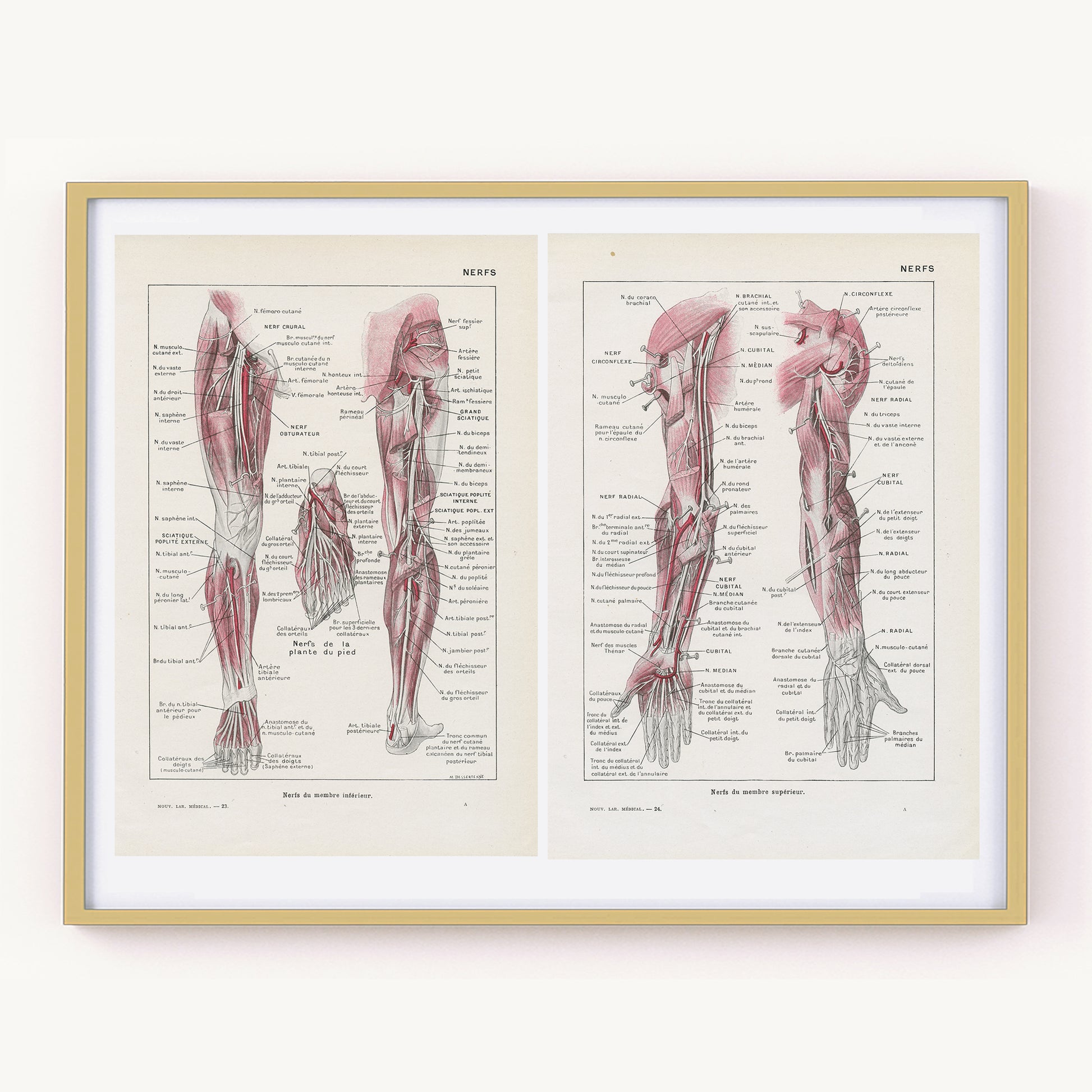 Ces pages montrent les réseaux de nerfs, l'une dans les membres supérieurs, l'autre dans les membres inférieurs. Chaque partie de l'organe est identifiés par son nom en français directement sur les diagrammes.