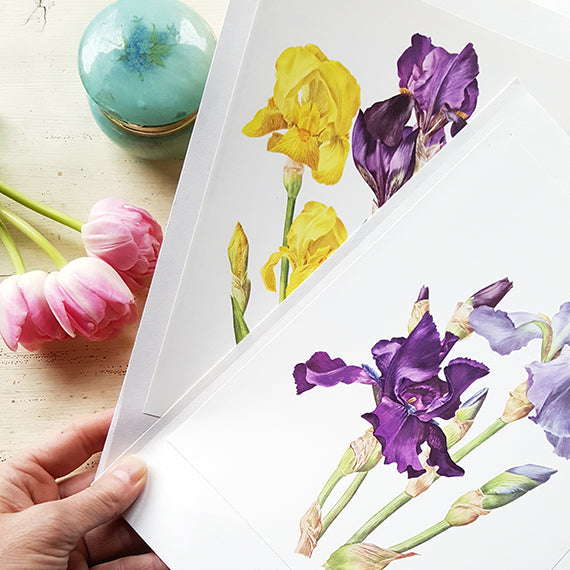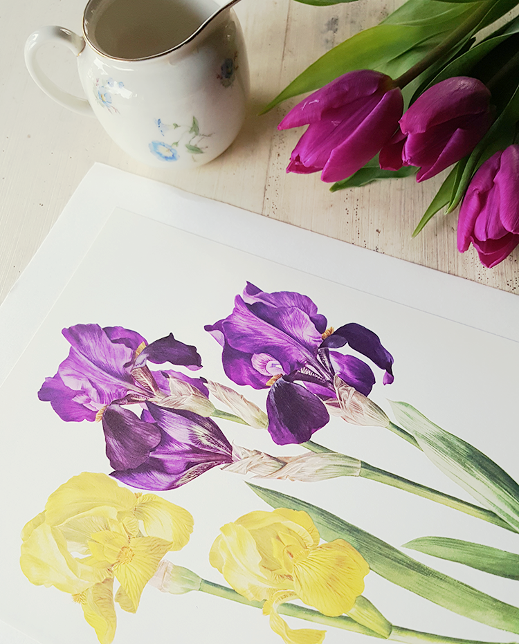 Ravissante illustration de fleurs vintage représentant deux variétés d'iris, l'une violette, l'autre jaune. Cette reproduction vintage d'art botanique vient d'un livre suisse qui n'est plus édité "Les plus belles fleurs de nos jardins", publié en 1964. et illustré par Anne-Marie Trechslin, peintre suisse reconnue internationalement pour ses aquarelles de fleurs et d'oiseaux. Ne sentez-vous pas le velours des pétales ? Illustrations parfaites pour encadrement, pour un décor floral. Un cadeau parfait pour un fleuriste ou un jardinier !