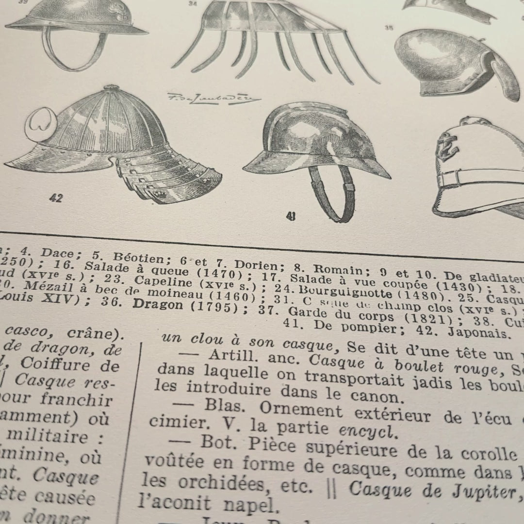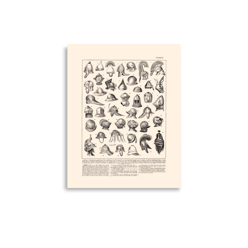 This helmet print shows all kinds of helmets, from the roman crested helmet to the winged helmet to the cavalry helmet with a horse tail. The helmets represented here are identified in French underneath the image.