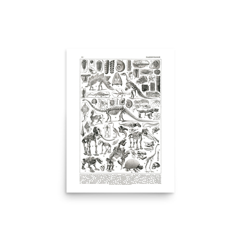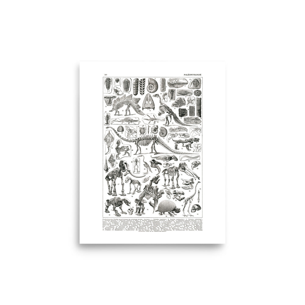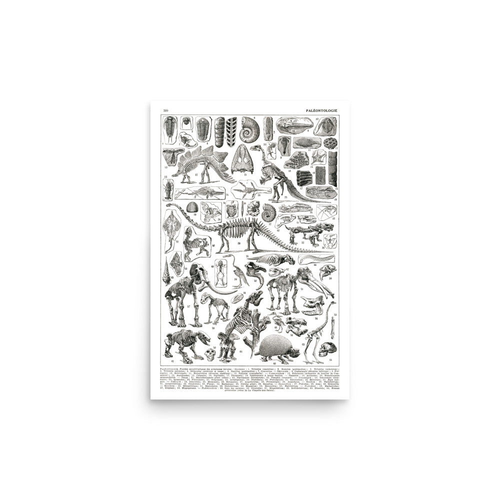 This is a large format reprint of a lovely antique French dictionary plate showing a large variety of skeletons, which illustrated the "Paléontologie" article of that dictionary (paleontology in French).