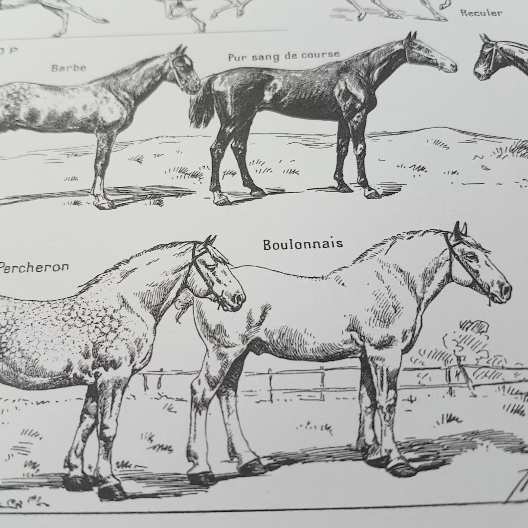 This is a high-quality contemporary reproduction of an antique 1948 dictionary plate, which illustrated the "Cheval" article (Horse in French). Basic horsine anatomy, teeth variations with age, common defects and identification of major breeds are some of the topics of this lovely poster. Each drawing is identified in French.