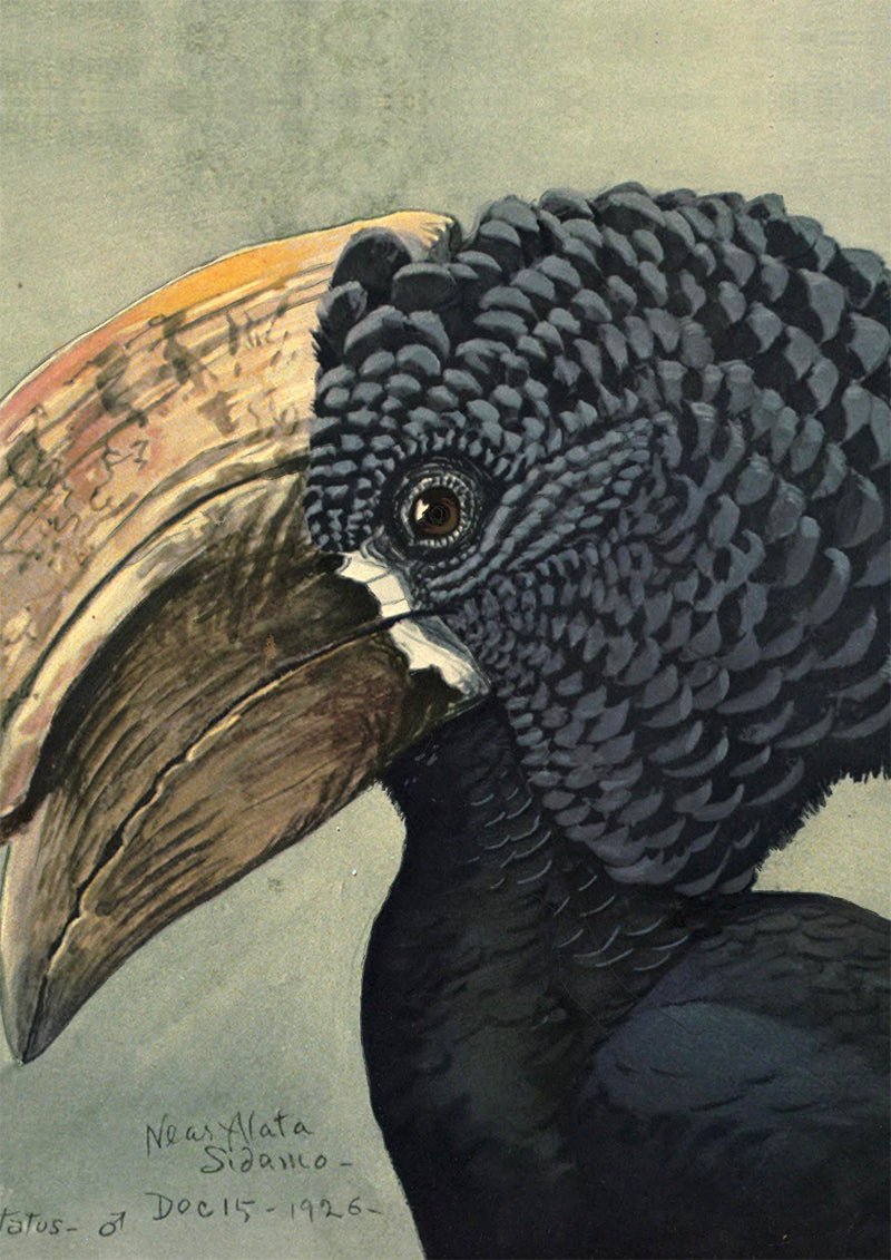 The illustration shows the head of the Crested Hornbill in profile, along with the author's annotations (Near Alata Sidamo - Bycanistes cristatus - Male - Dec 15 1926)