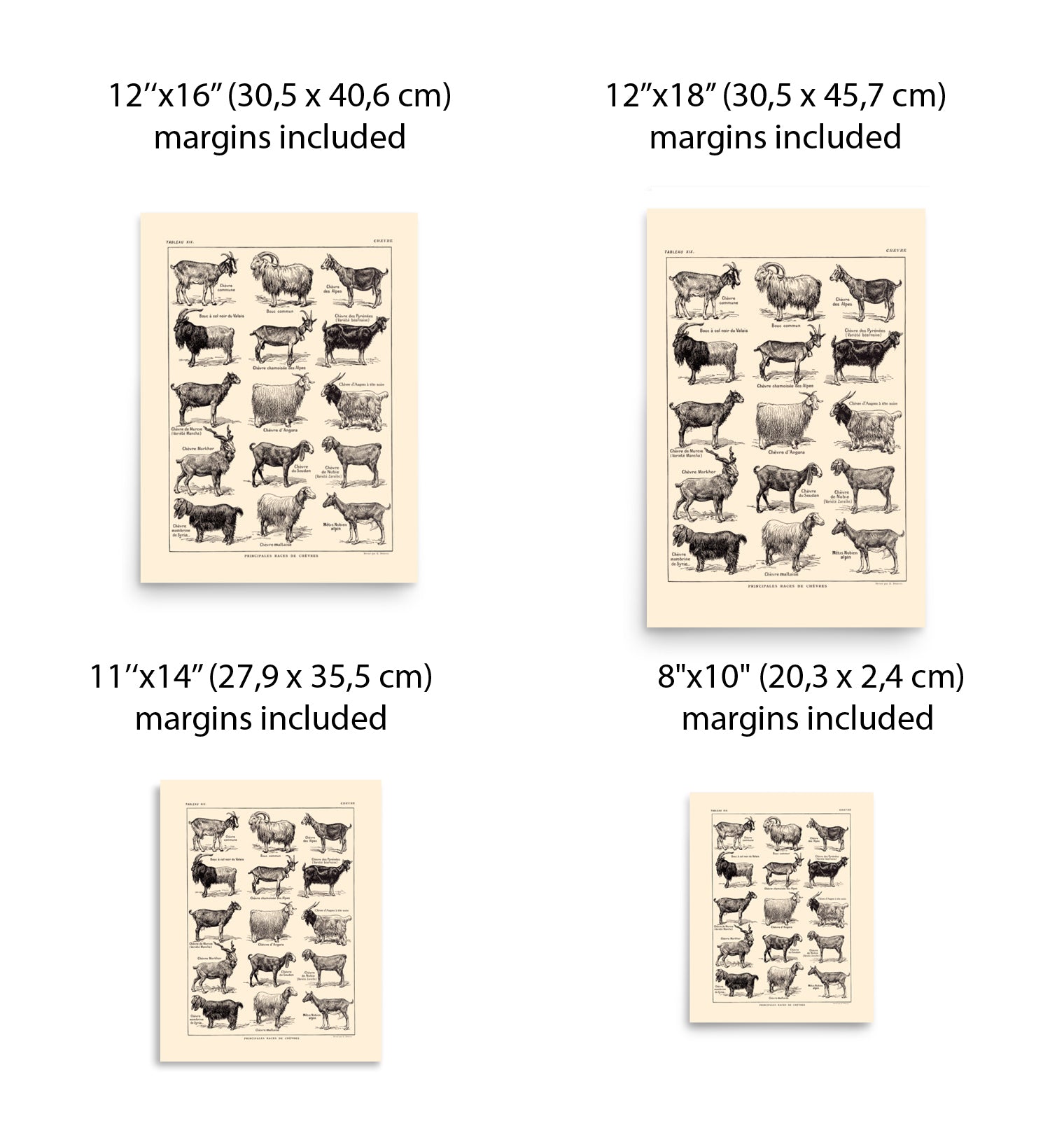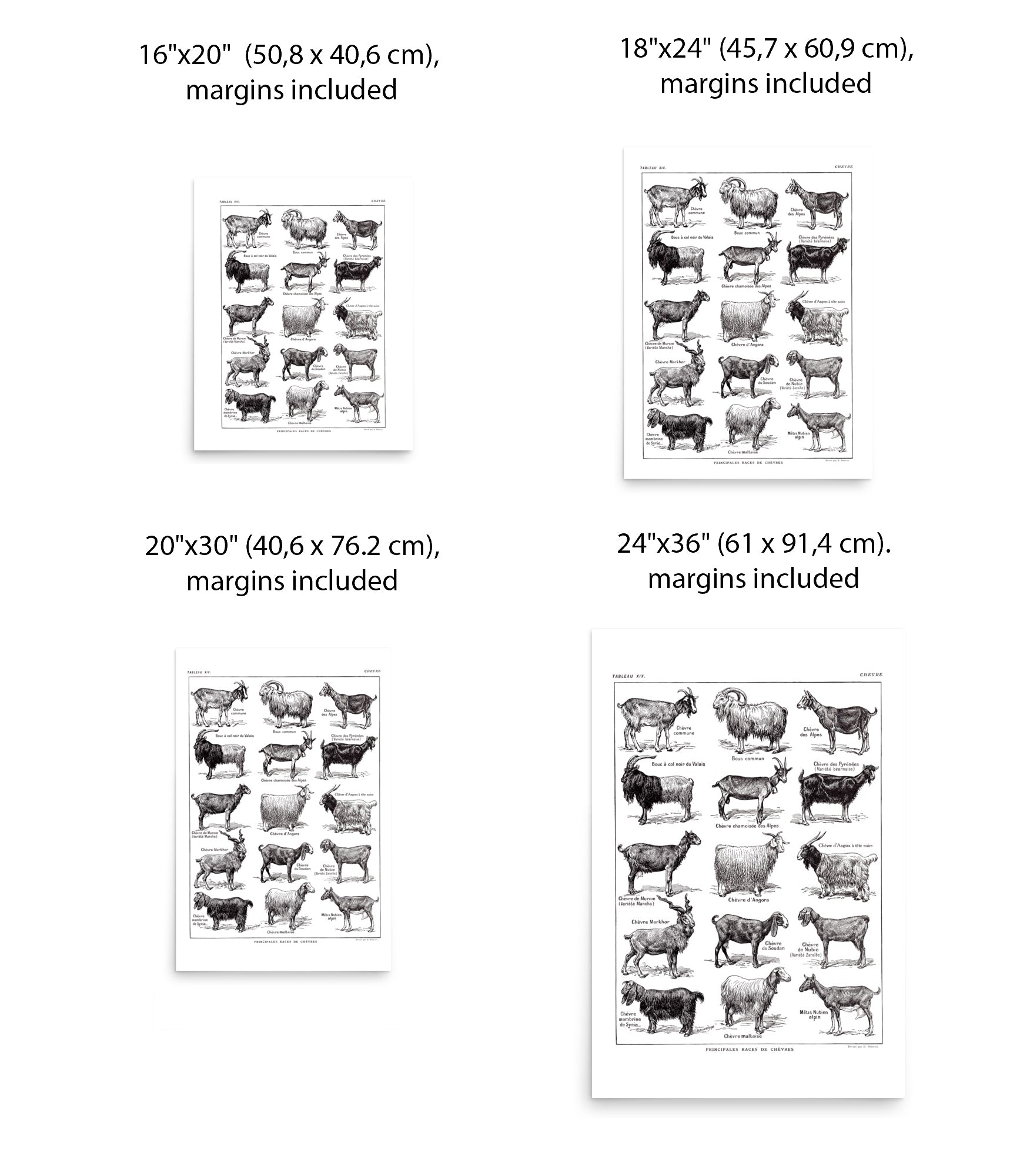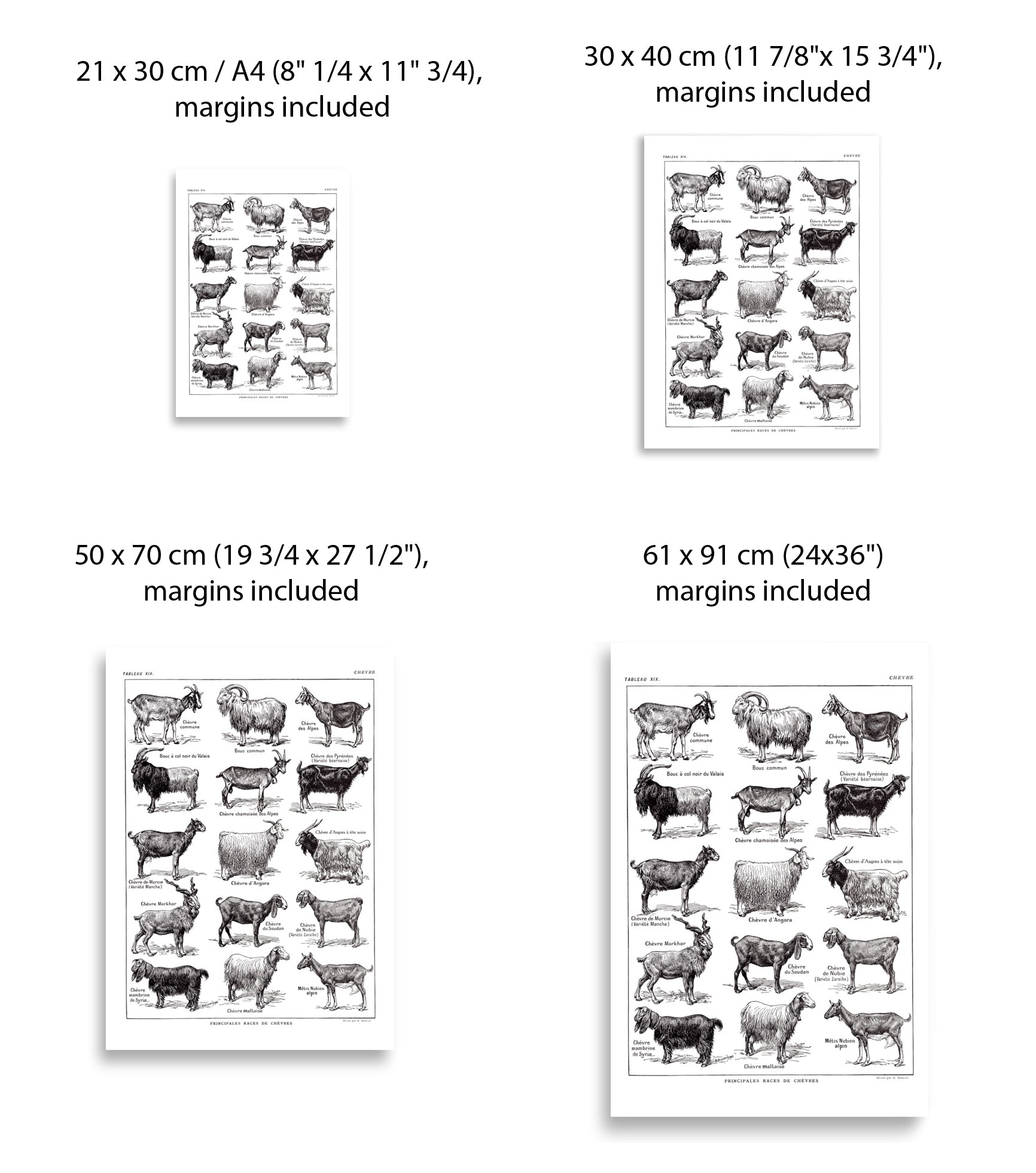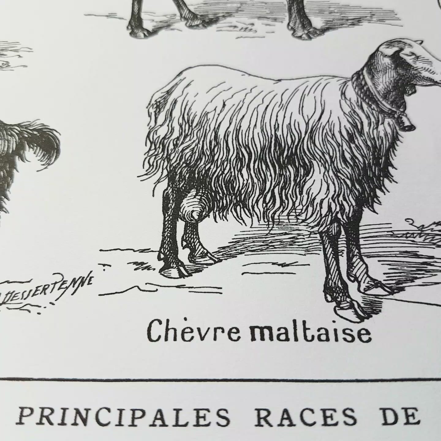 Large poster showing a large variety of goat's races. This poster was inspired by a 1921 French farming dictionnary and shows the races common at the time. Maltese, black Valais ram, Nubian, Sudanese or Angora are among the races shown here.