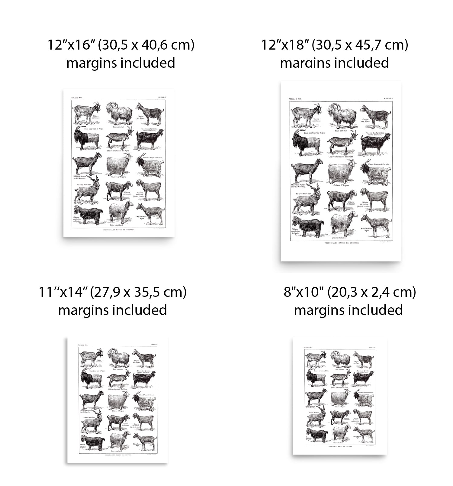 - Imperial sizes: 8"x10" (20,3 x 25,4 cm), 11"x14" (27,9 x 35,5 cm), 12"x16" (30,5 x 40,6 cm), 12"x18" (30,5 x 45,7 cm), 16"x20" (50,8 x 40,6 cm), 18"x24" (45,7 x 60,9 cm), 20"x30" (40,6 x 76.2 cm), 24"x36" (61 x 91,4 cm).