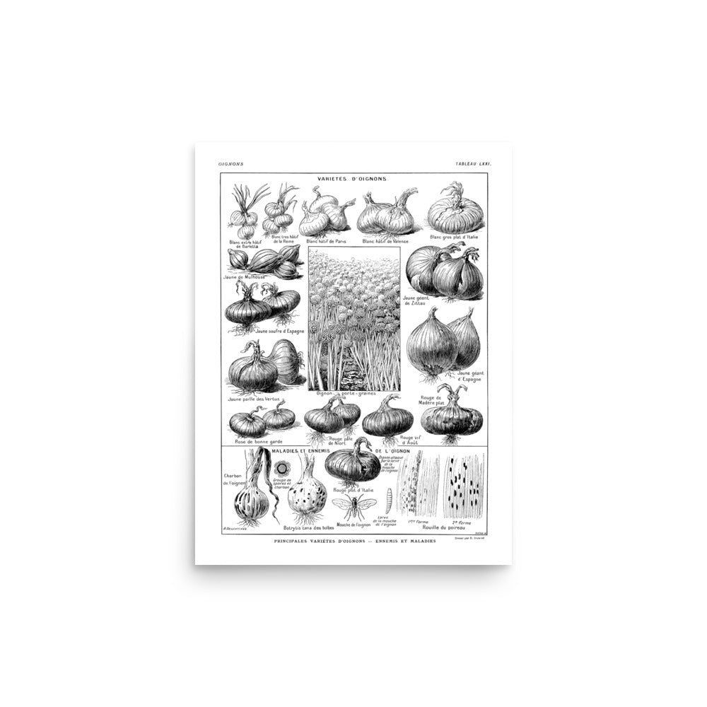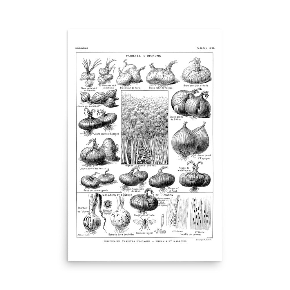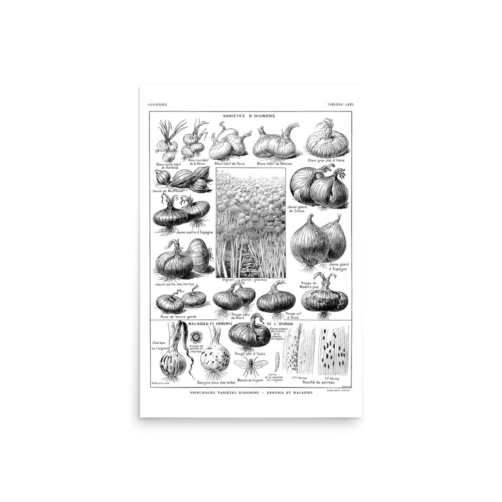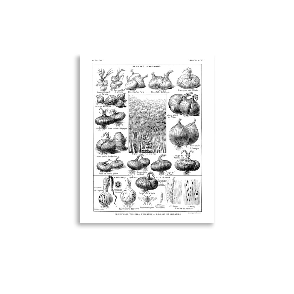 Grande affiche noire et blanche représentant une planche botanique d'oignons. Cette planche est inspirée d'un dictionnaire Larousse Agricole publié en 1921.