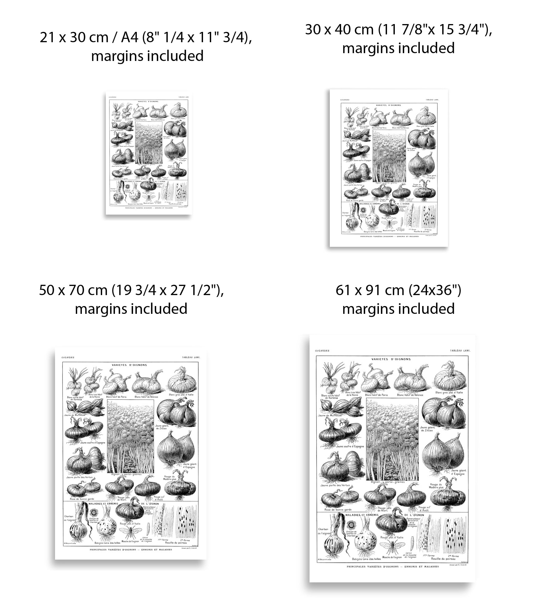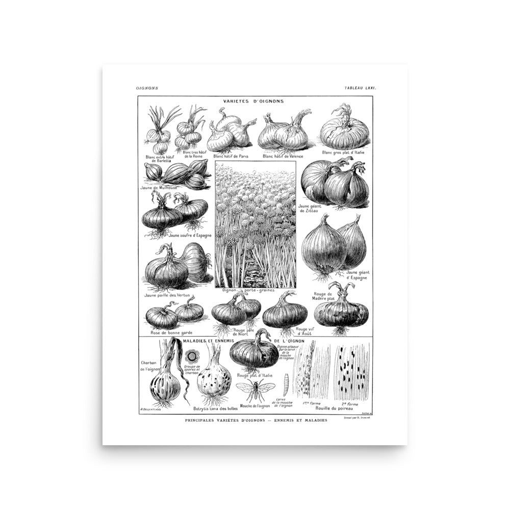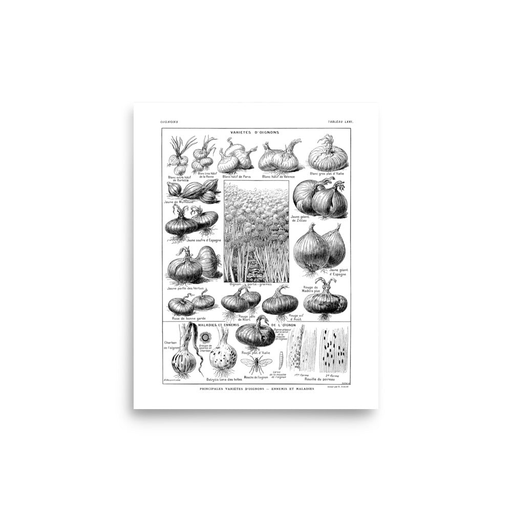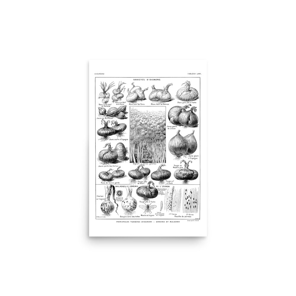 Grande affiche noire et blanche représentant une planche botanique d'oignons. Cette planche est inspirée d'un dictionnaire Larousse Agricole publié en 1921.
