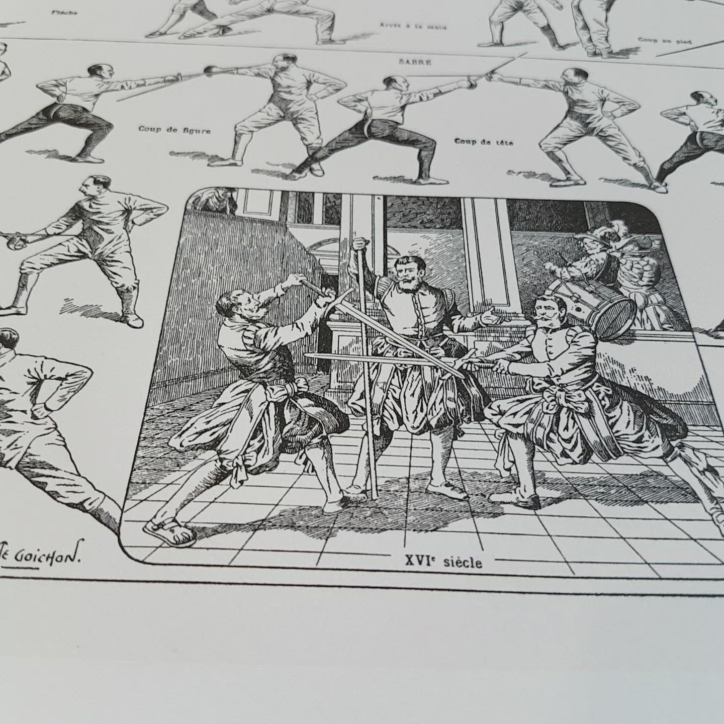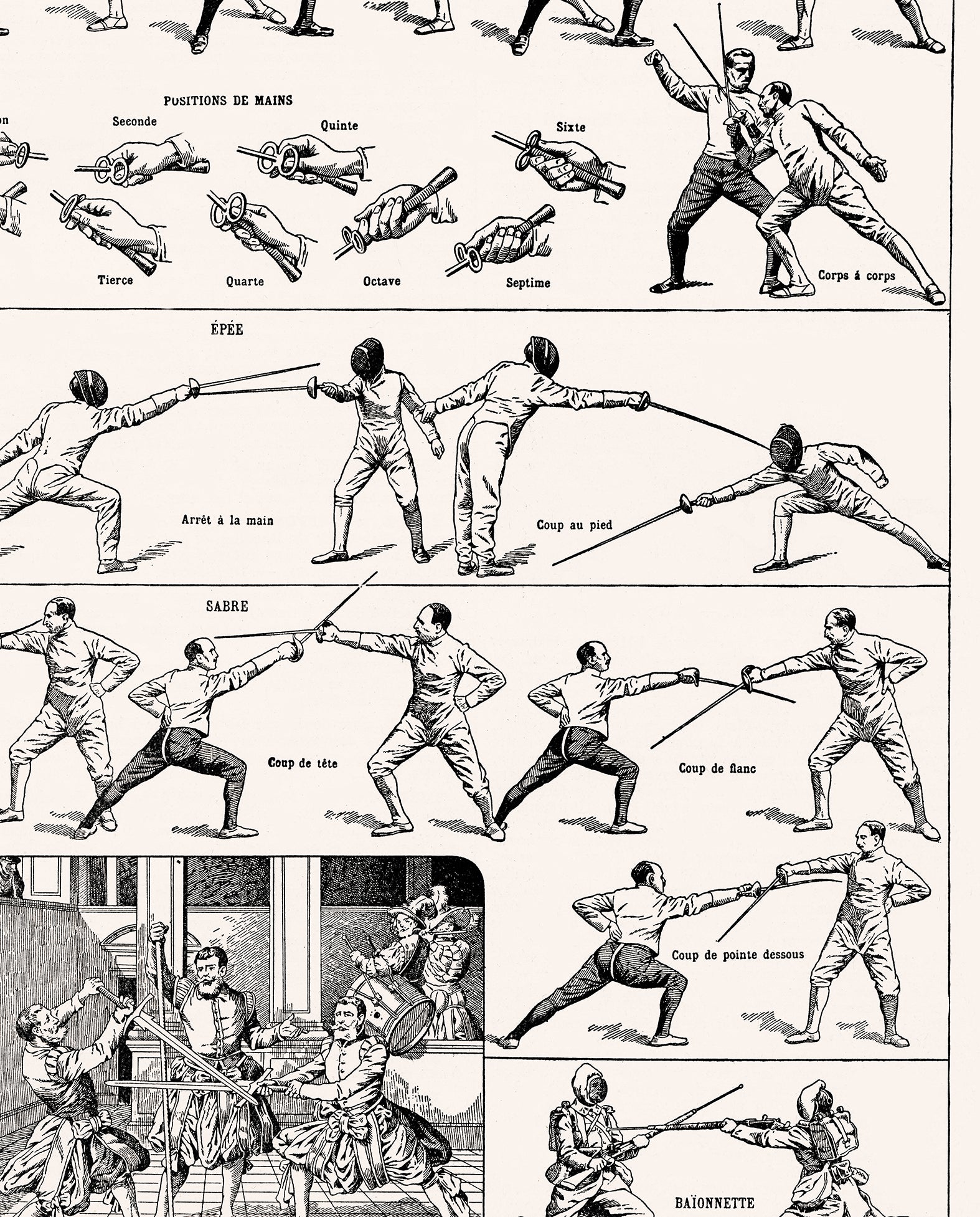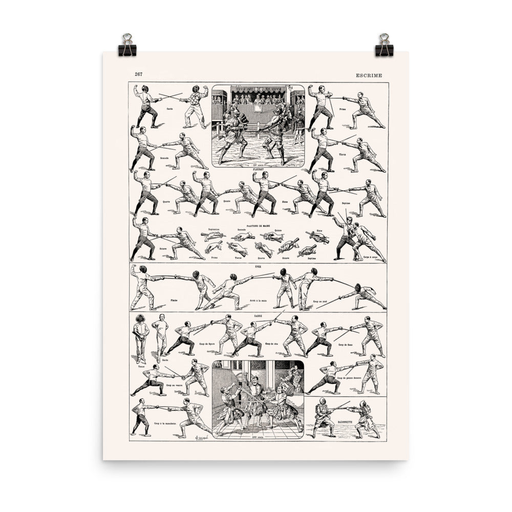 Cette très belle illustration grand format d'escrime été créée à partir d'un original de 1936, extrait d'un dictionnaire Larousse Universel de cette année-là, scanné à haute résolution. Chaque dessin, qui capture parfaitement l'esprit et les détails de se sport, est identifiée par une courte description en français au bas de l'image.