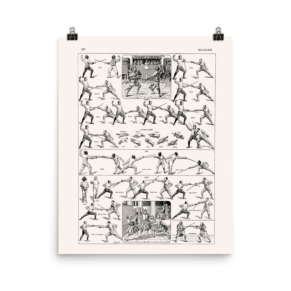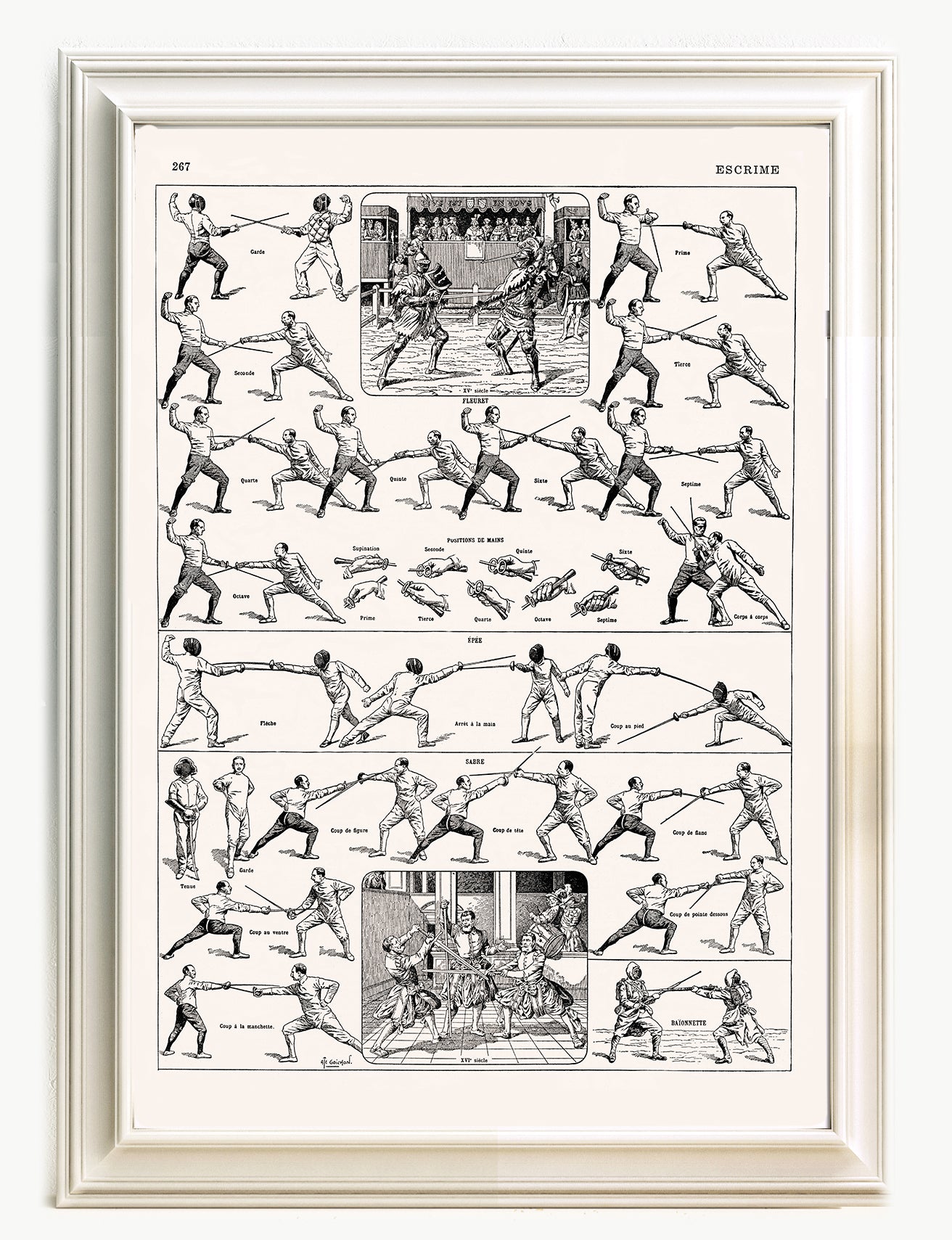 ● Elegant poster d'escrime rétro grand ou moyen format, créé à partir d'une planche de dictionnaire de 1936, sur fond beige lin, pour ajouter une touche vintage élégante à votre décoration sportive. Fleuret et épée n'auront plus de secrets pour vous !
