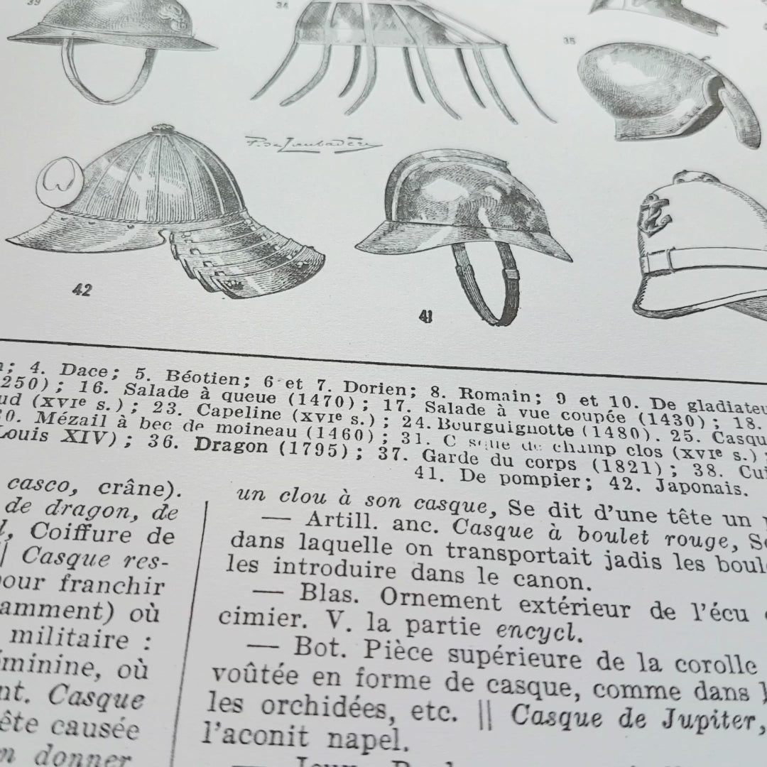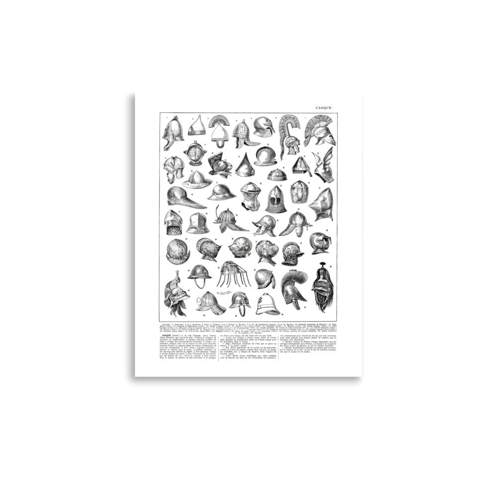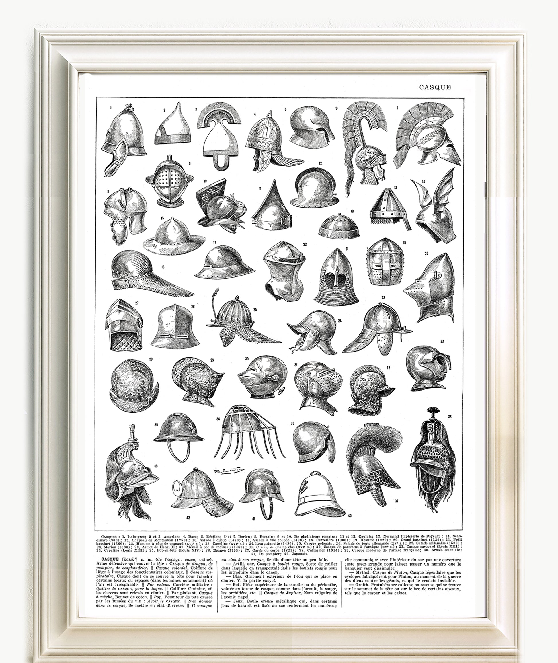 This helmet print shows all kinds of helmets, from the roman crested helmet to the winged helmet to the cavalry helmet with a horse tail. The helmets represented here are identified in French underneath the image.