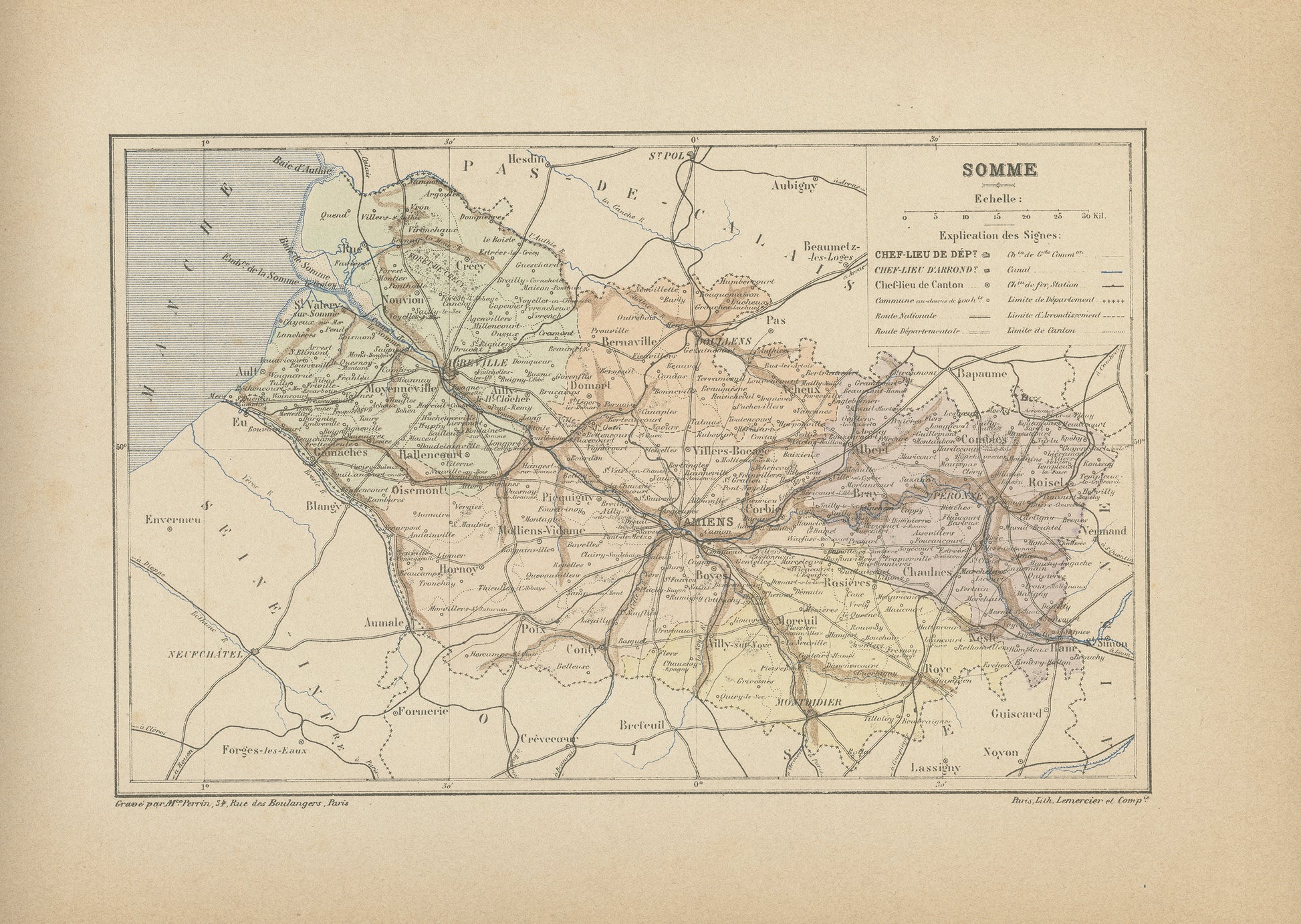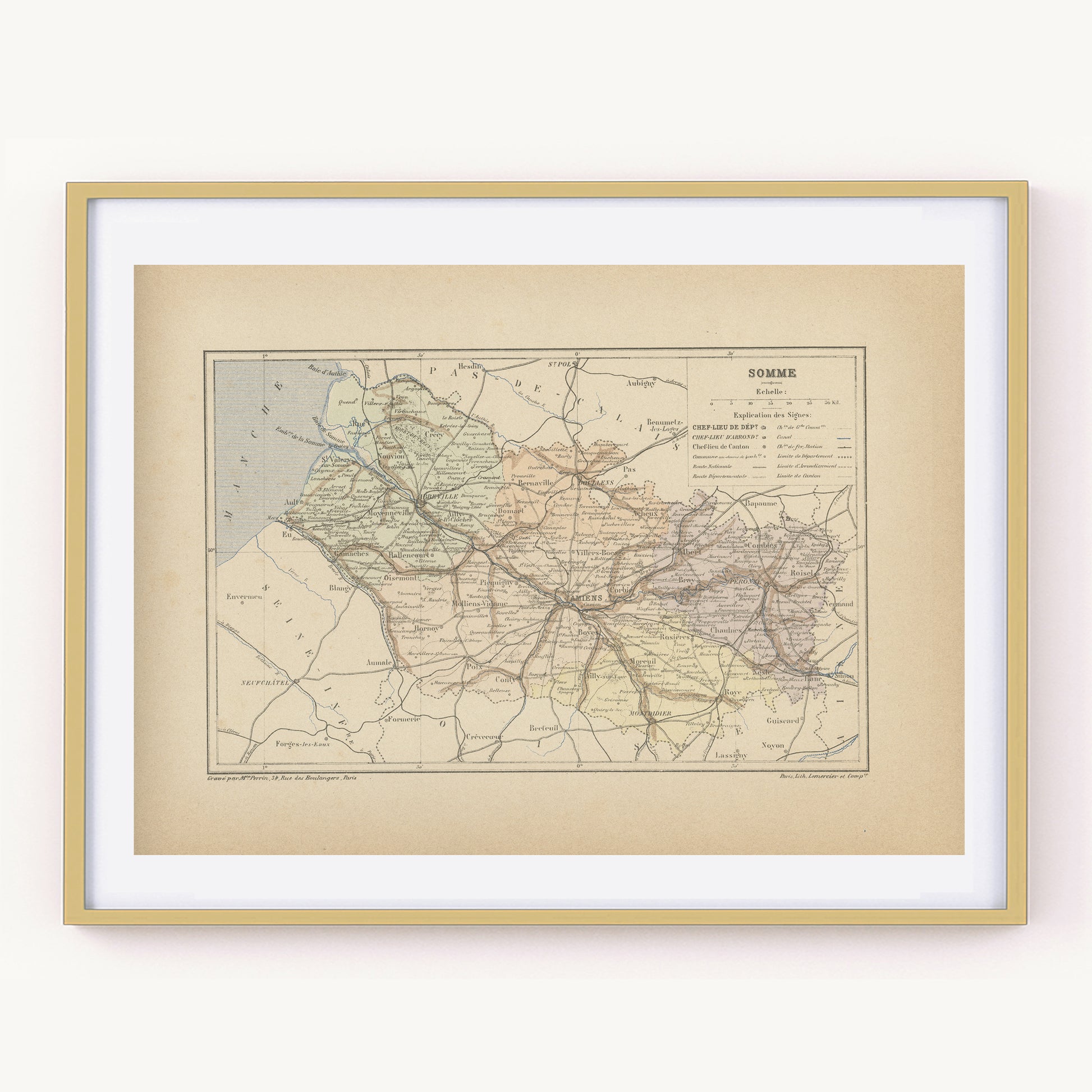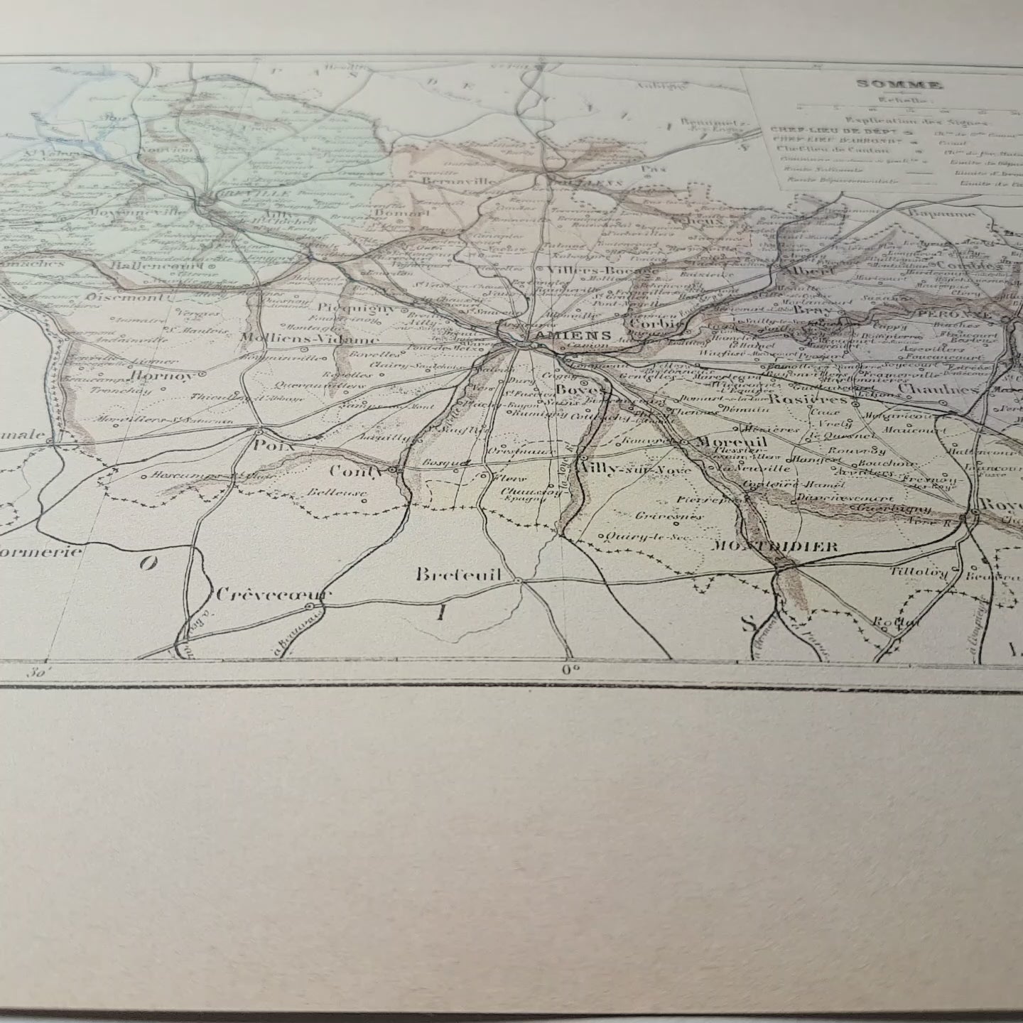 Gorgeous little engraving showing a delicately colorized map of a French department: the Somme department. Do you know where it is situated? As you may know, France is divided in 101 department. This one is in the North of France, centered around the delta lf the Somme river, which gives it its name. The capital is the town of Amiens.