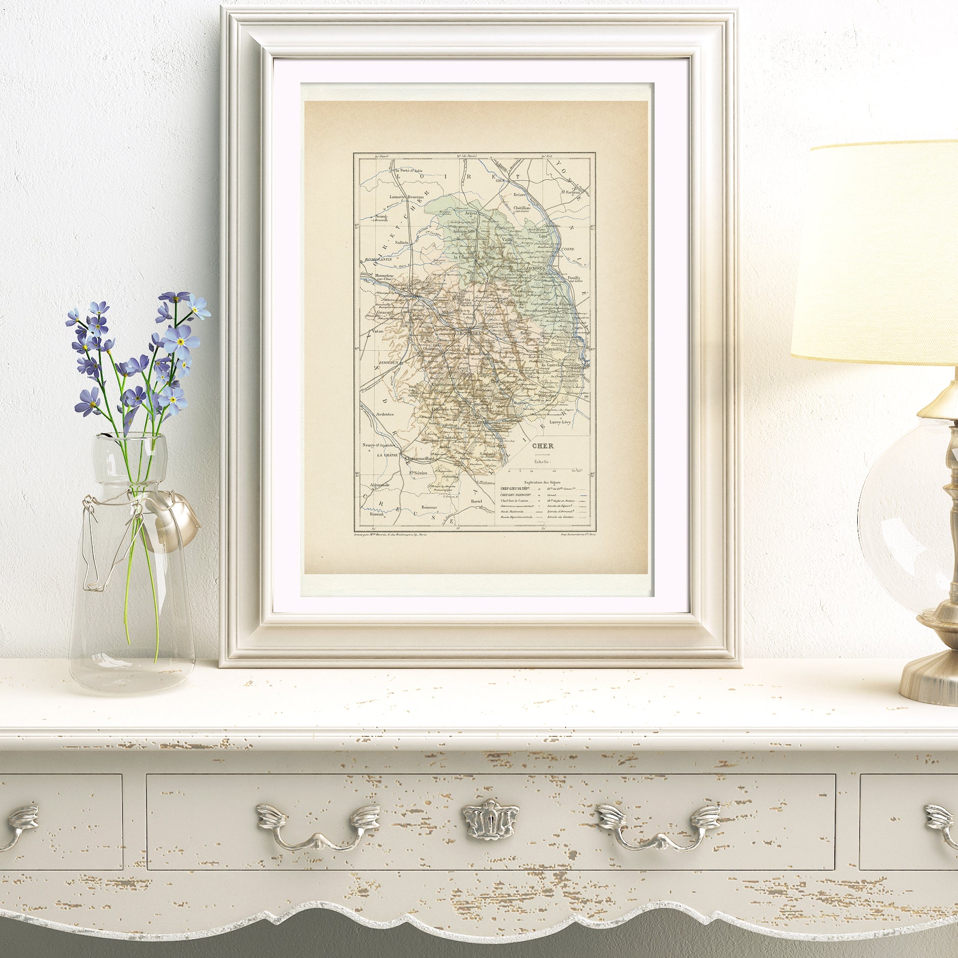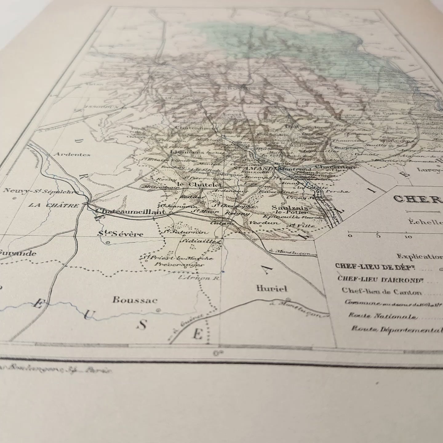 Gorgeous little engraving showing a delicately colorized map of a French department: the Cher department. Do you know where it is situated? As you may know, France is divided in 101 department. This one is in the East of France, in Burgundy (Bourgogne), an area renowned for its wines. The capital city is the beautiful town of Bourges.