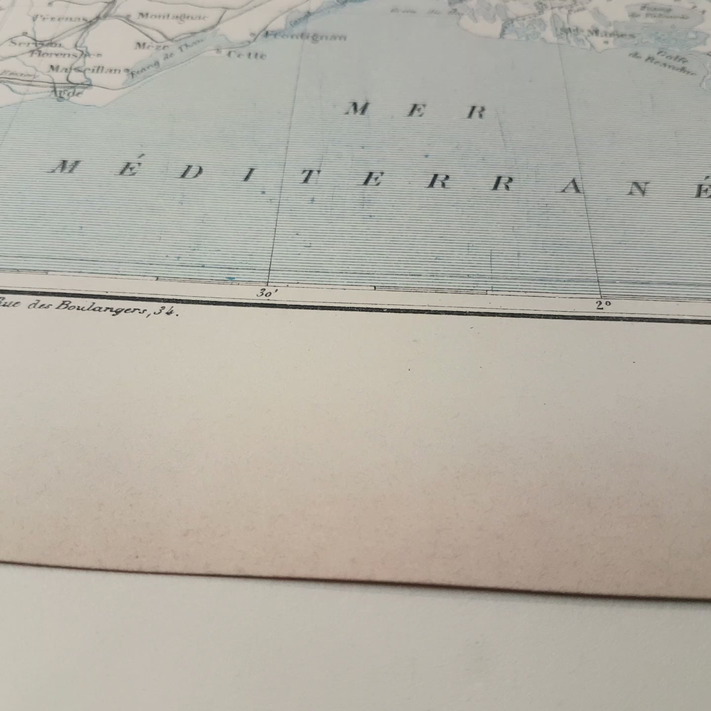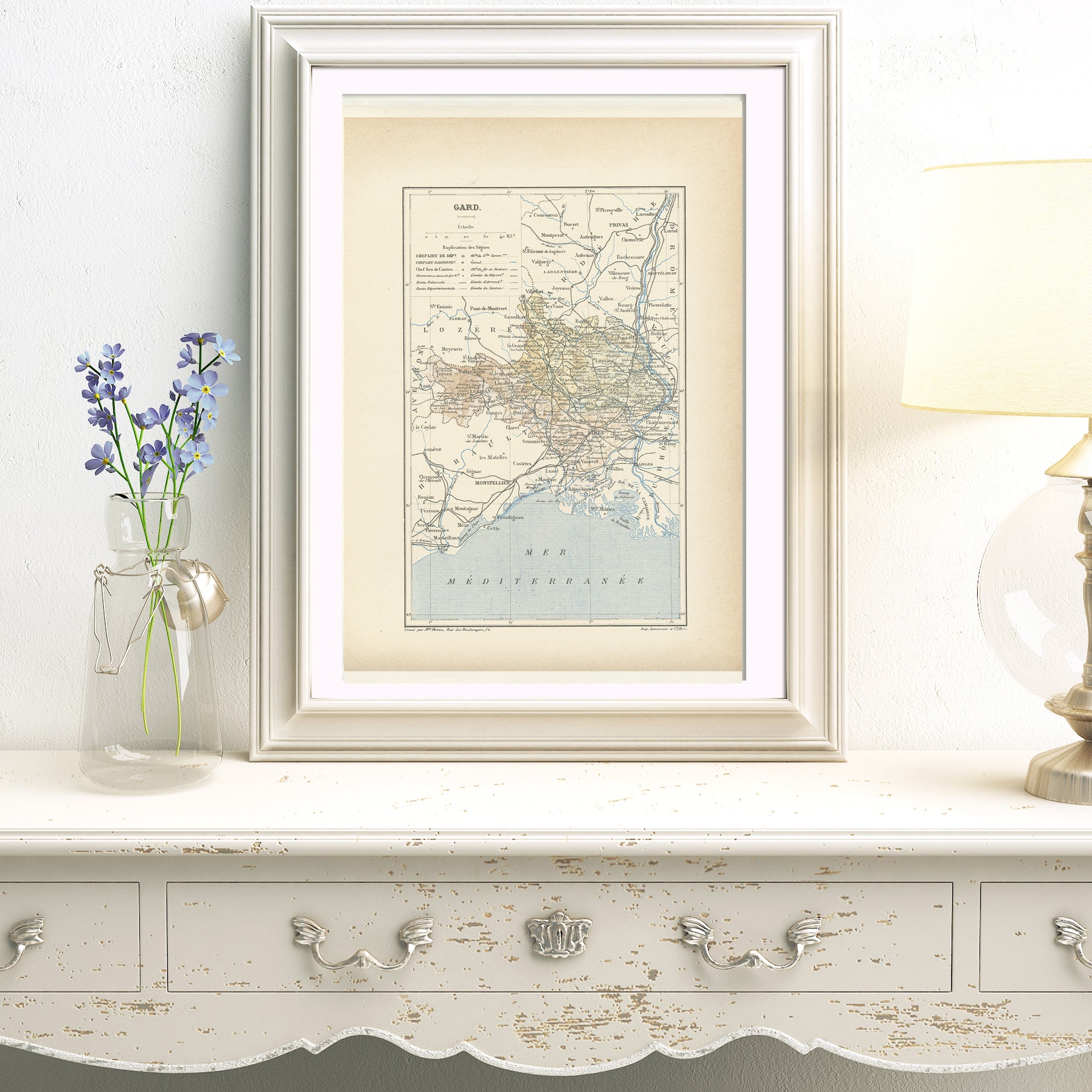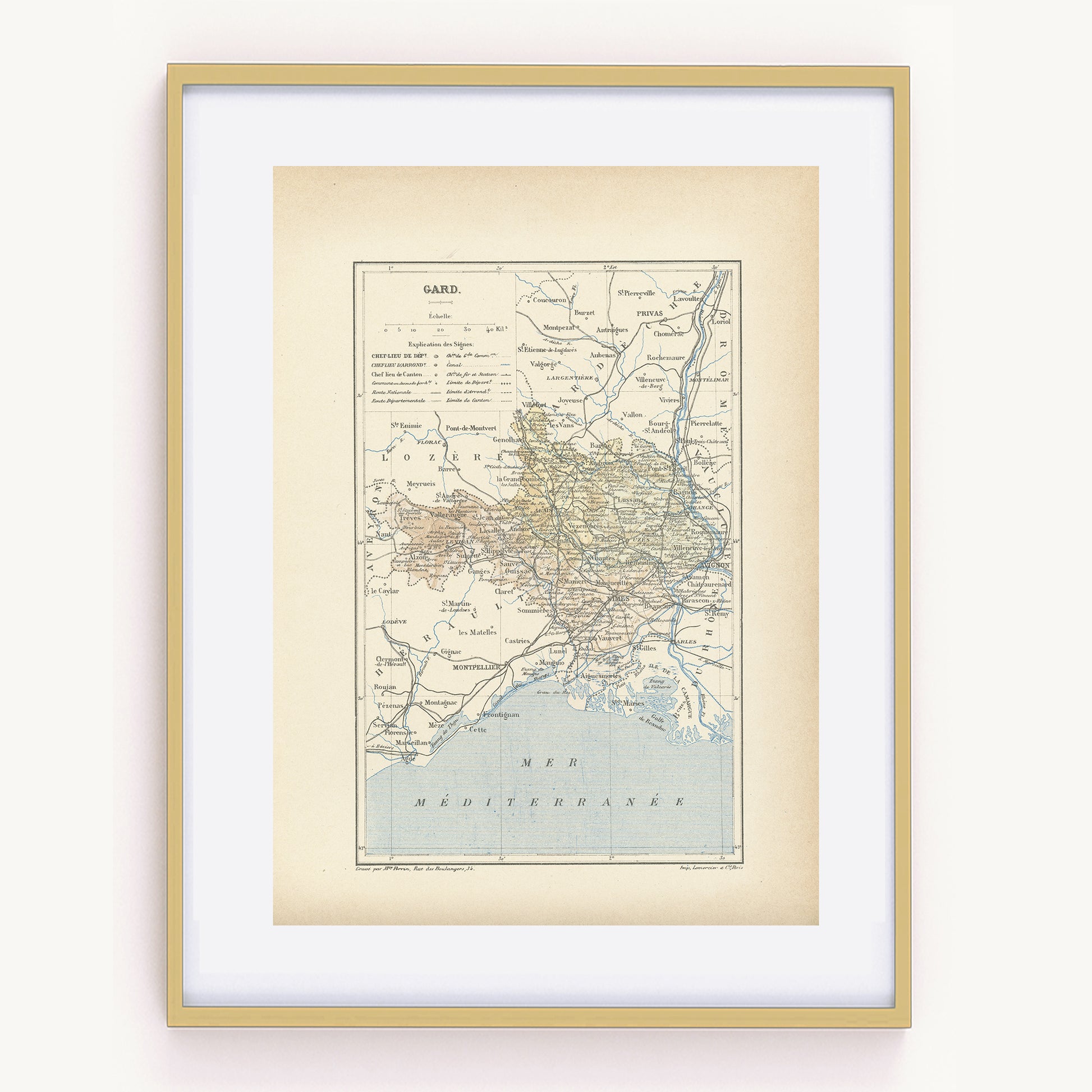Gorgeous little 19th century engraving from a French geography dictionary showing a delicately colorized map of a French department: the Gard department. Do you know where it is situated? As you may know, France is divided in 101 department. This one is in the South West. Its prefecture (main administrative center) is the city of Nîmes, which is famous for its antique arenas. It is also famous for the Pont du Gard, a large Roman aqueduct.