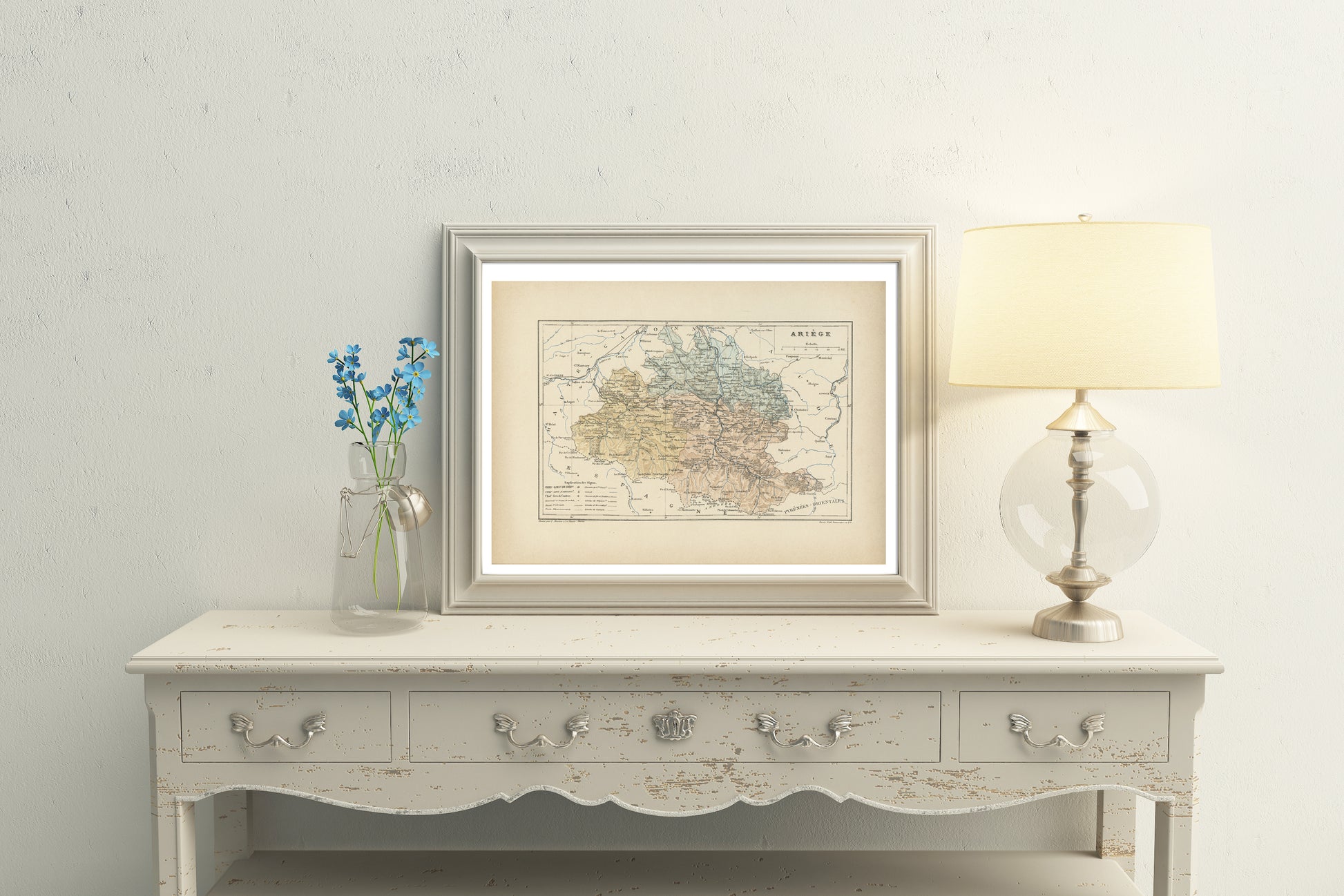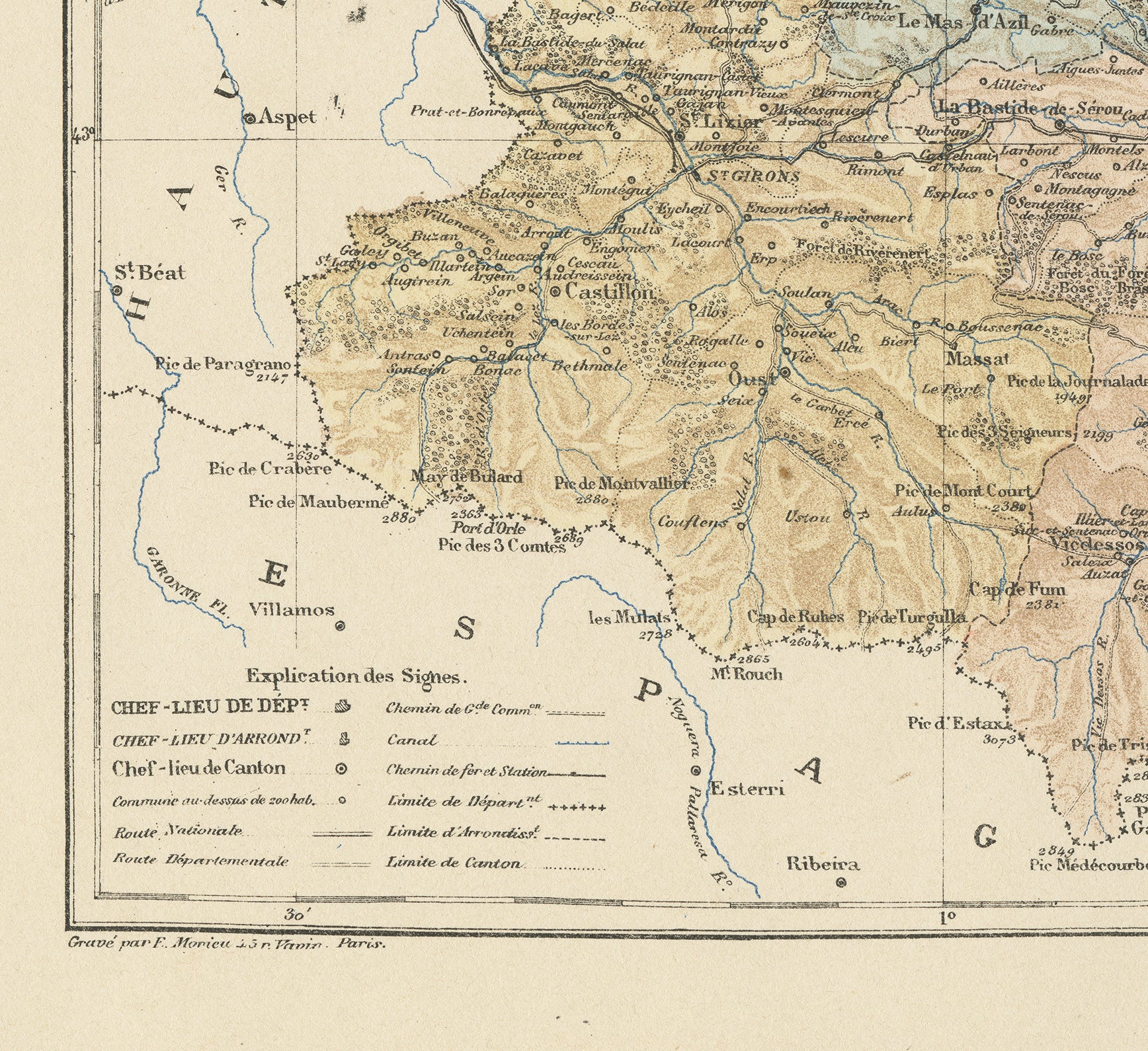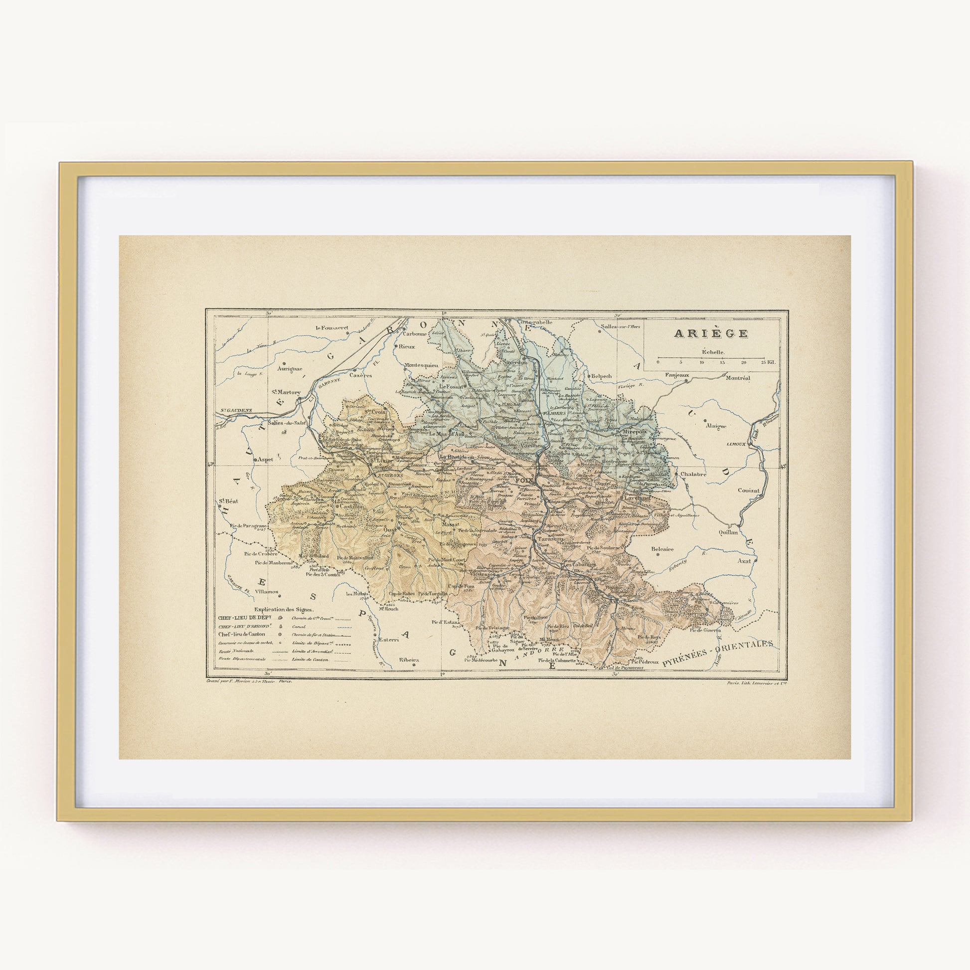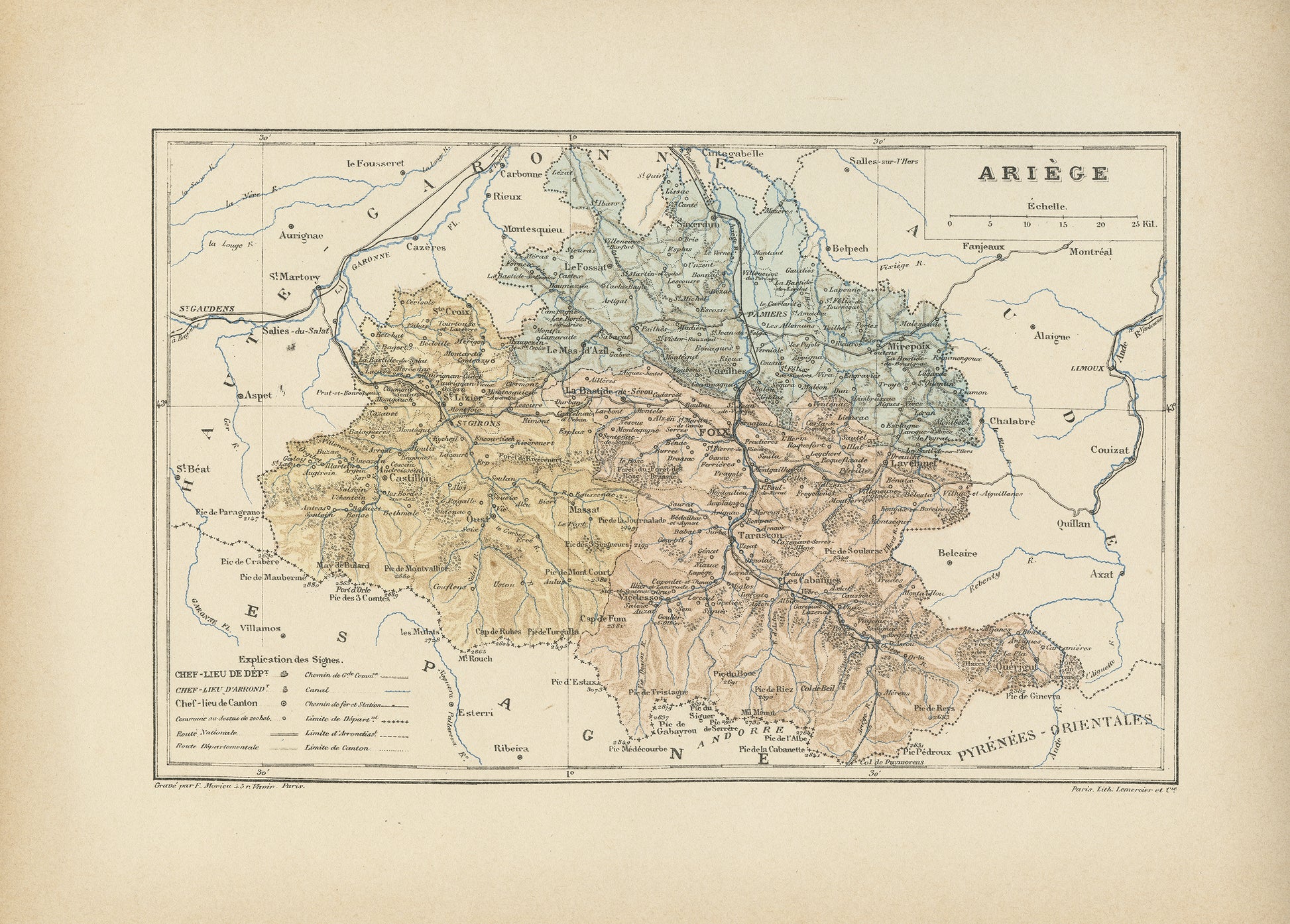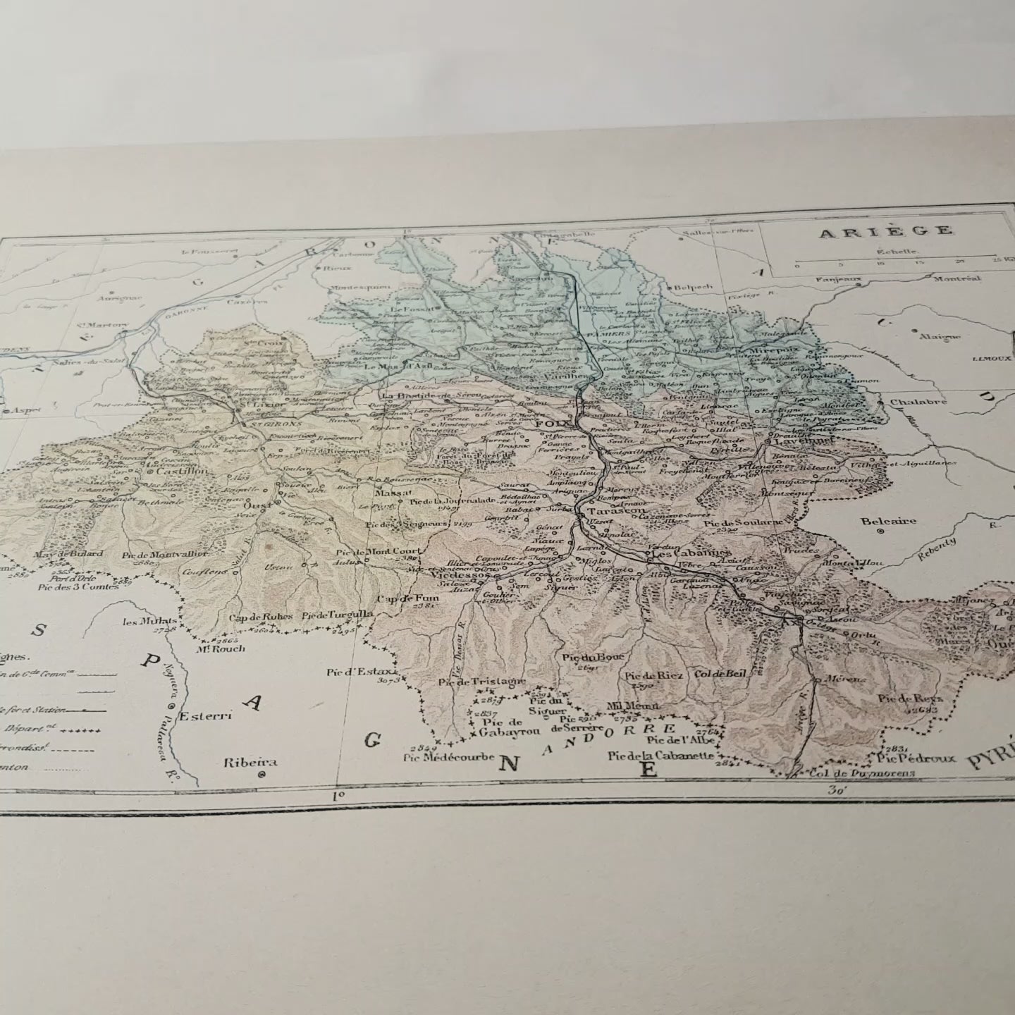Gorgeous little engraving showing a delicately colorized map of a French department: the Ariège département. Do you know where it is situated? As you may know, France is divided in 101 department. This one is in the Southwest of France, in the Pyrenees mountains, close to the Spanish border. The capital is the town of Foix. It includes the town of Tarascon, well known through literature.