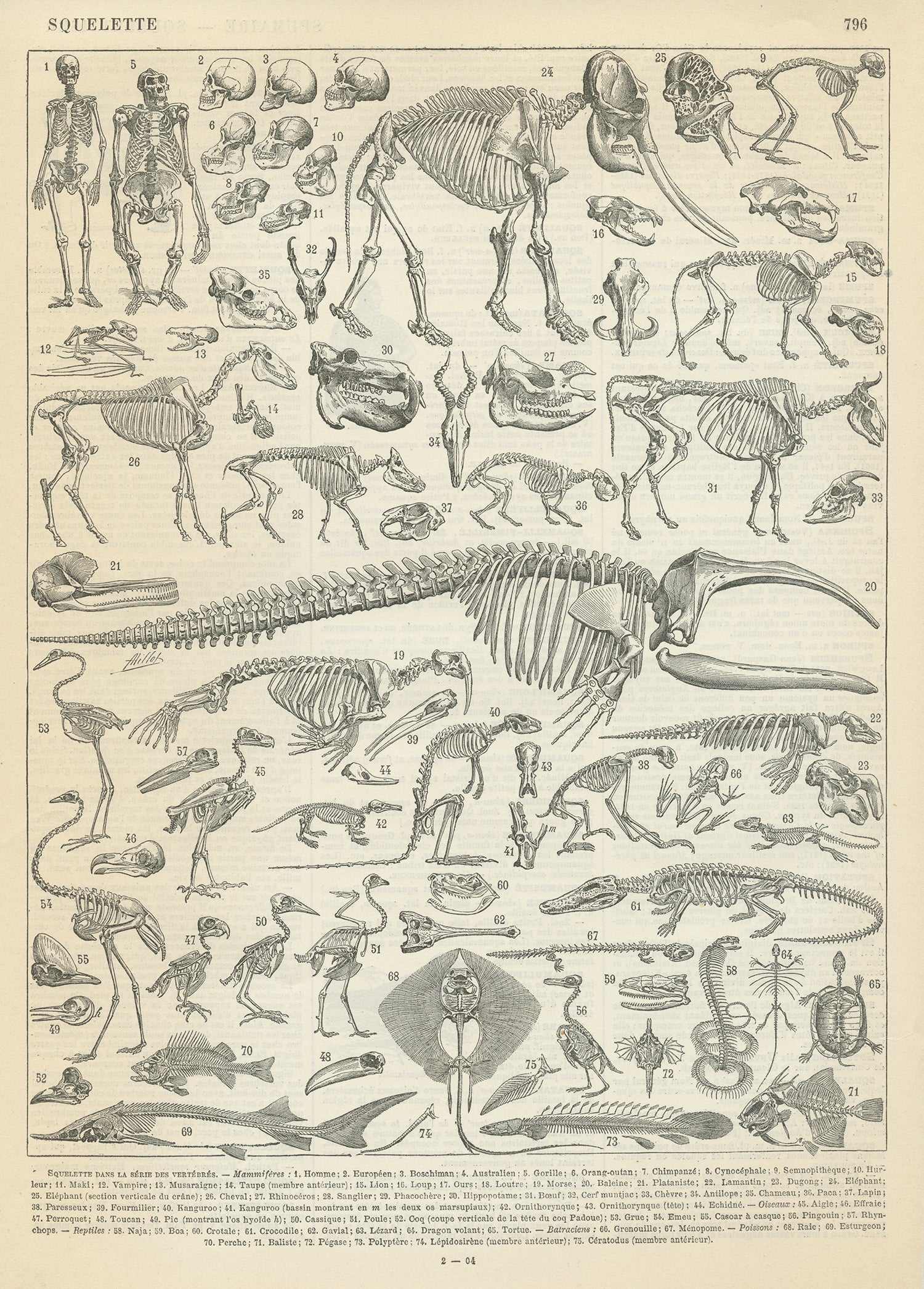 Very interesting 1897 antique French biology print, showing a large variety of skeletons, from the human to the whale. This beautiful anatomy plate comes from a 1897 Larousse French dictionary, where it illustrated the "Squelette" article, which means skeleton in French.
