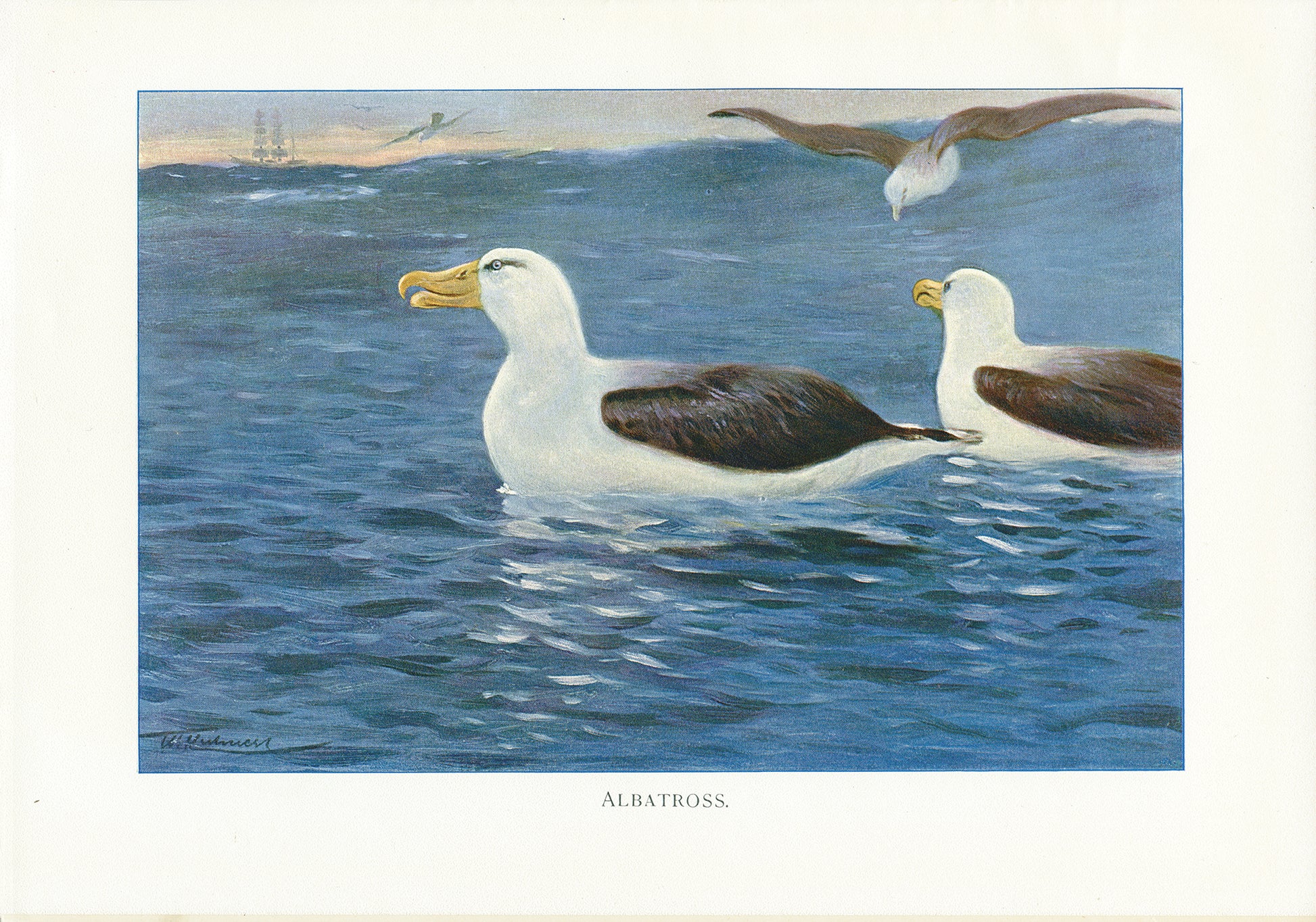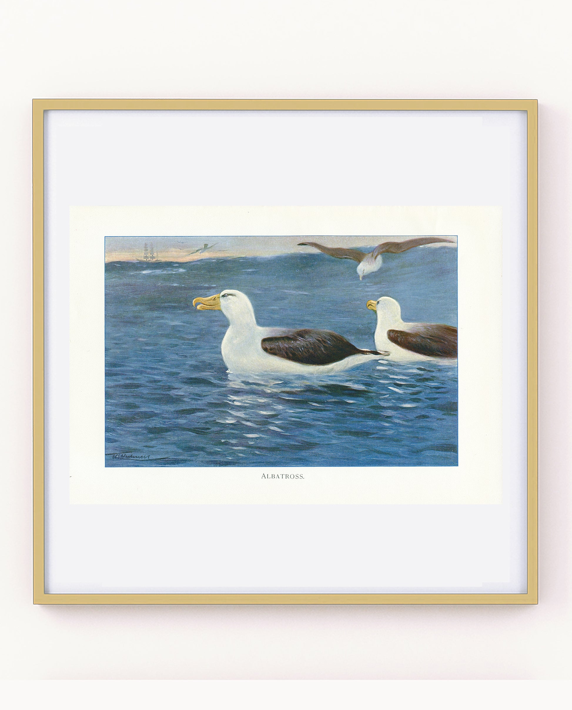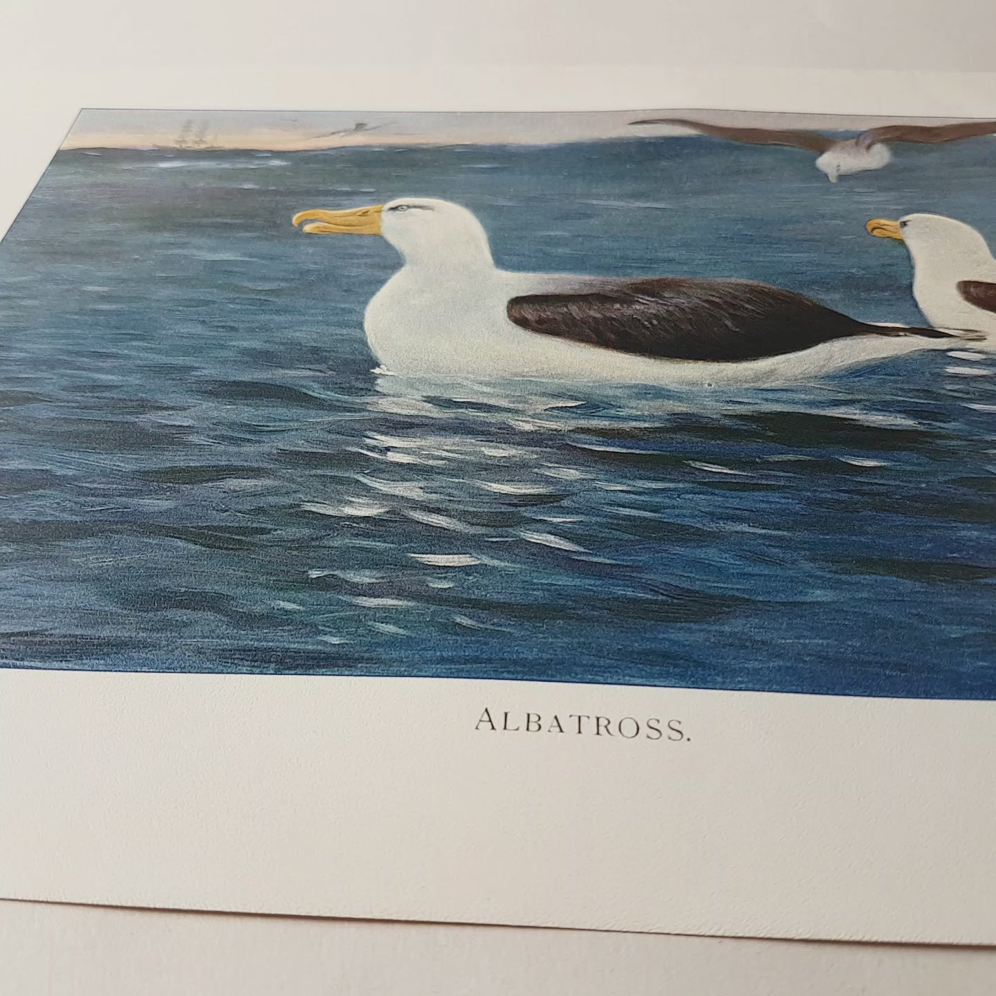 Beautiful antique Albatross bird print from a 1916 natural history book entitled "Wildlife of the world" by Richard Lydekker. This vintage print is in very good condition, with a slight yellowing of the paper at the edges. It shows 2 Albatrosses on the water and a couple of flying ones, together with the silhouette of a lovely tall ship in the distance.