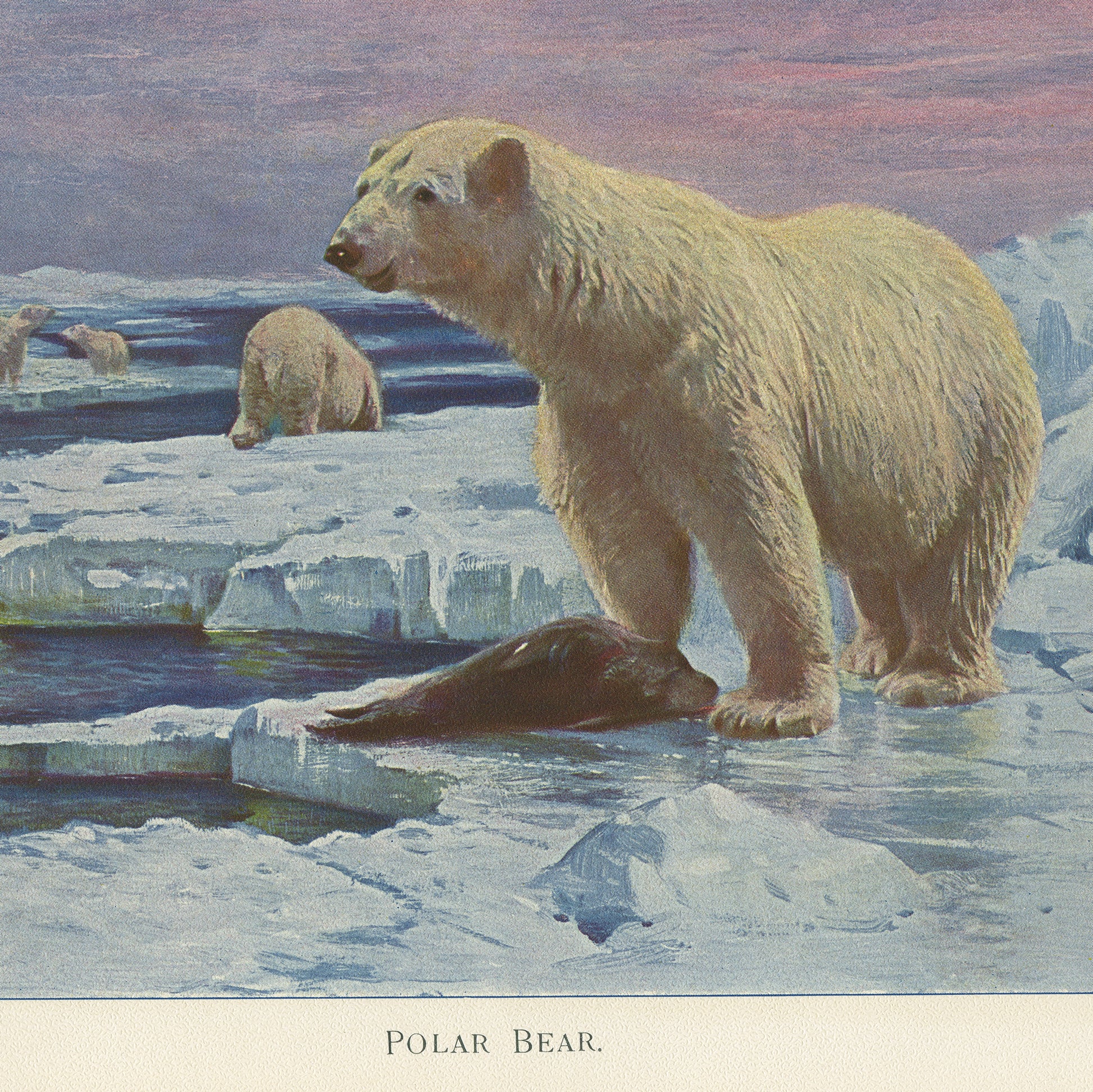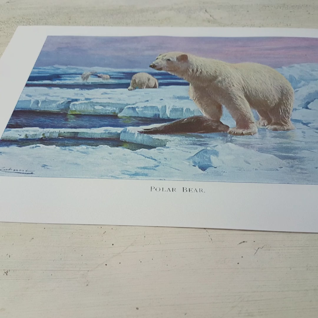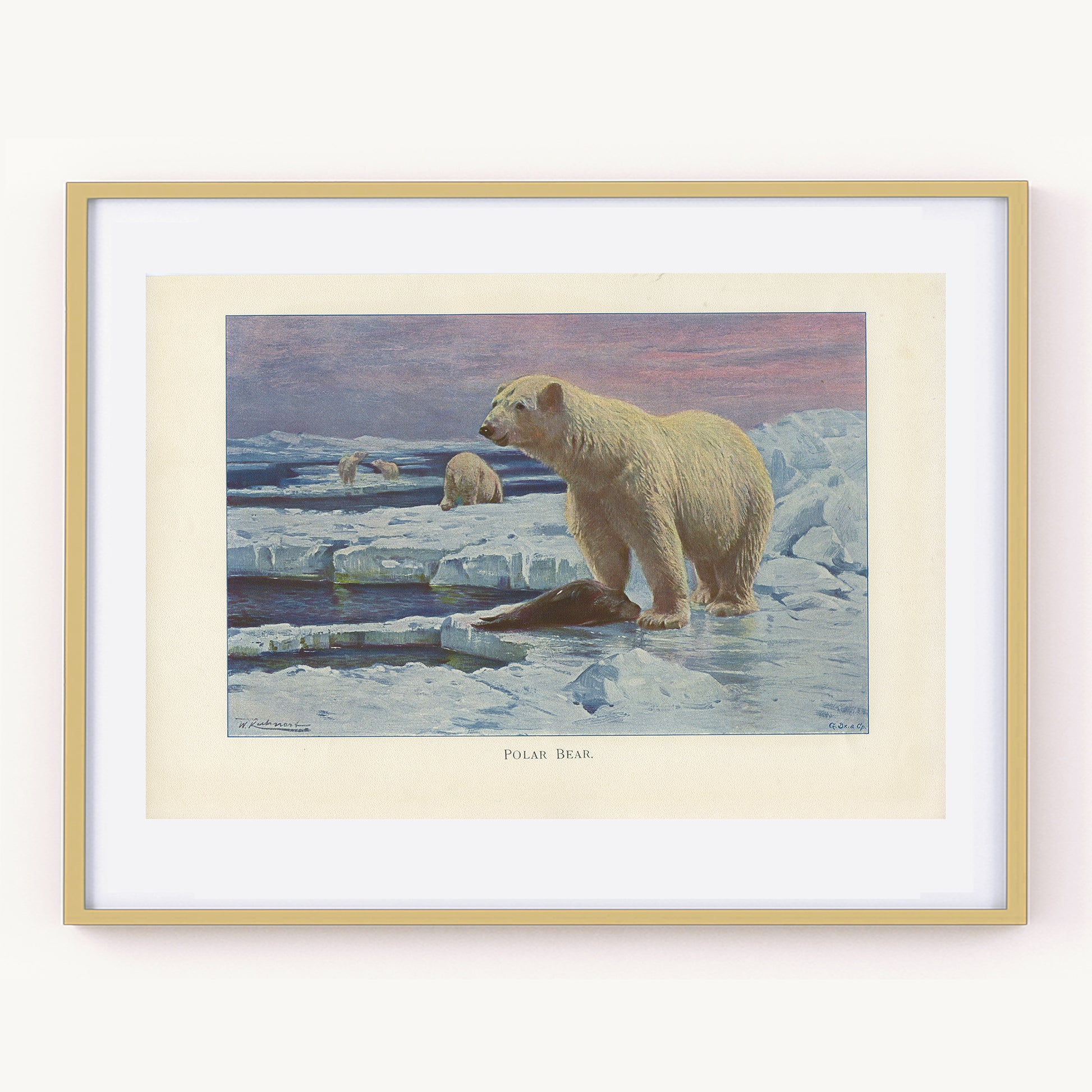 This little vintage print is a chromolithograph and is in very good condition, with a slight yellowing of the paper at the edges. It shows a bunch of white polar bears hunting on the ice.