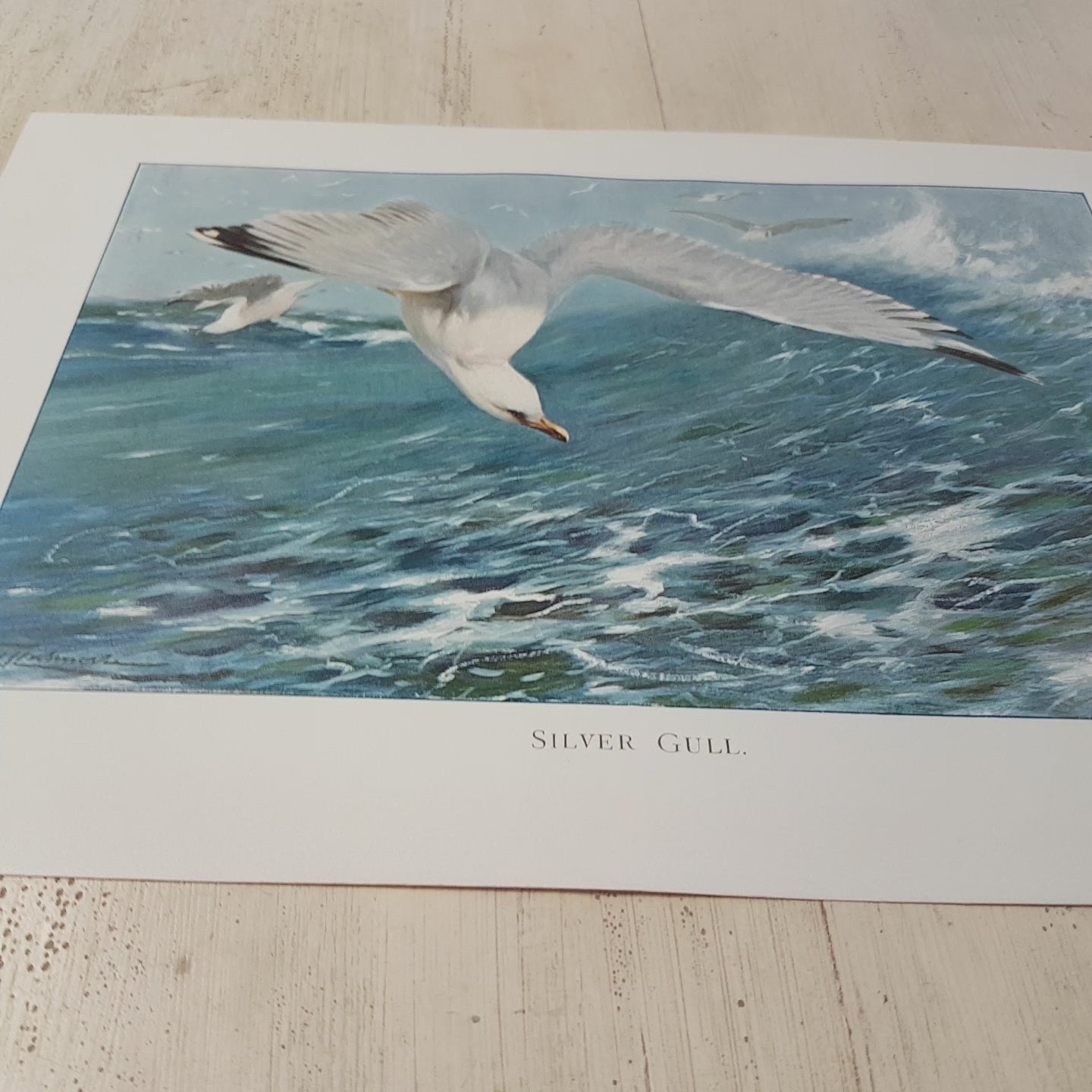 This little vintage print is a chromolithograph and is in very good condition, with a slight yellowing of the paper at the edges. It shows a beautiful Silver Gull flying low over the waves. Silver gulls are the most common gulls of Australia.