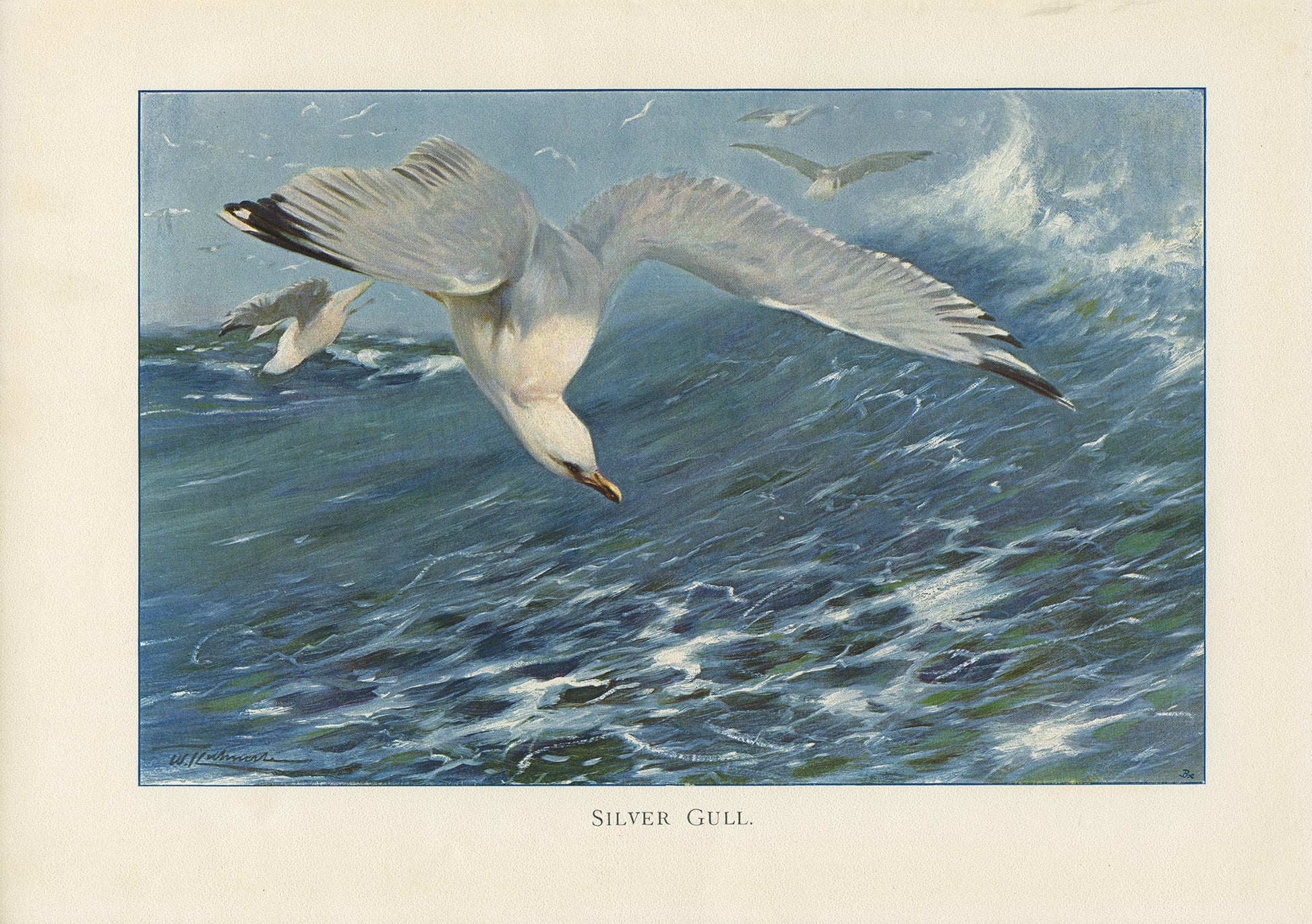 Beautiful antique Silver Gull print from a 1916 natural history book entitled "Wildlife of the world", written by naturalist Richard Lydekker and illustrated by A. Weczerzick and W. Kuhnert.
