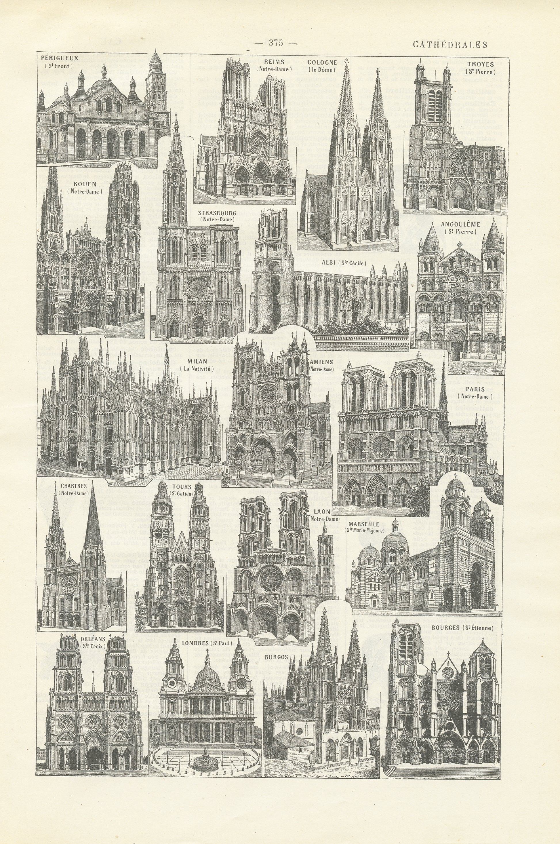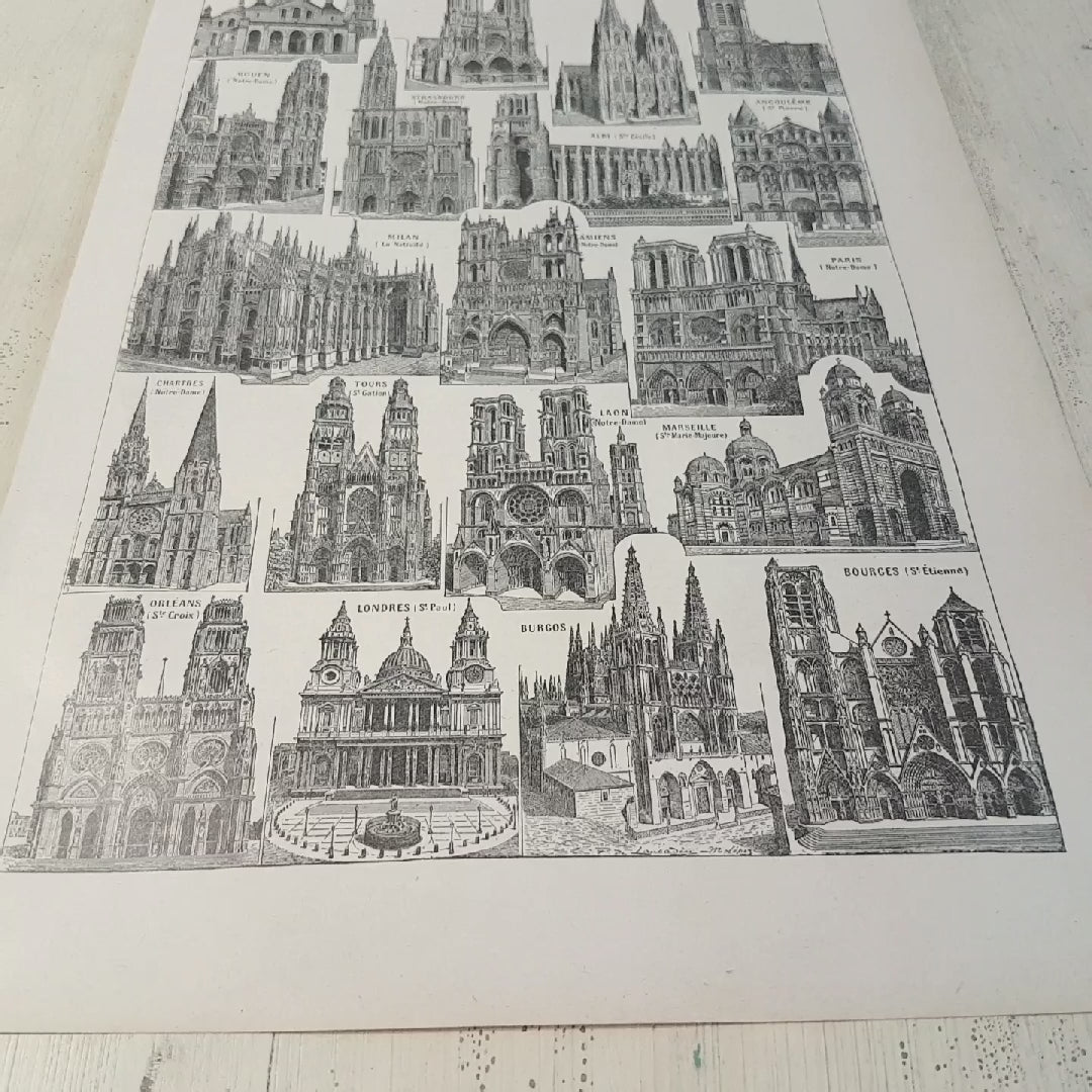 Lovely 1922 vintage French dictionary page showing all the major French cathedrals, along with those from London, Burgos, Milan and Cologne. This churches vintage print was taken from a French Larousse dictionary. The reverse is printed with various dictionary articles.