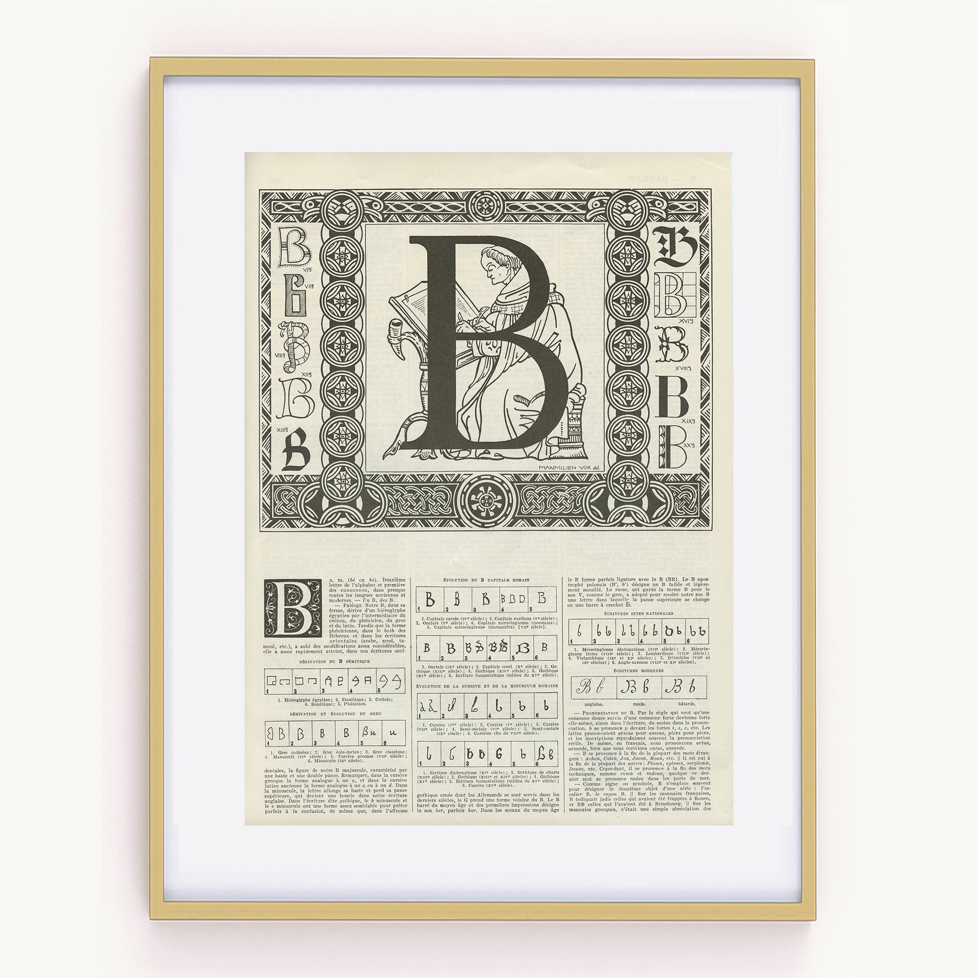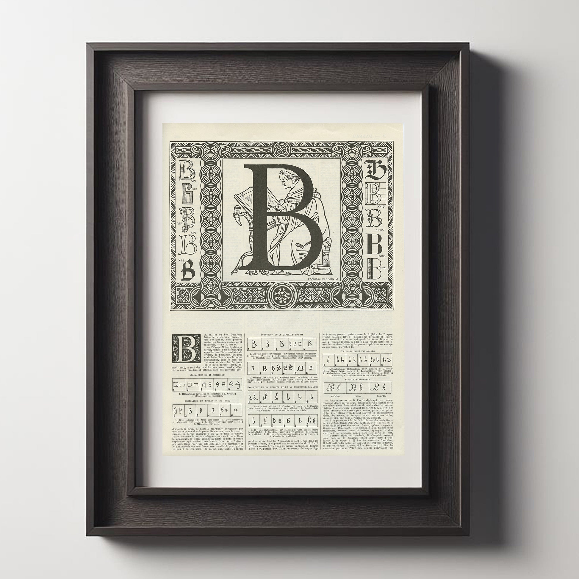 Vintage print for the letter B, from a 1936 French Dictionary. The main calligraphy depicts a man carving an alphabet letter into a block of stone. It is framed with smaller calligraphies and in the bottom half of the page, there is an interesting historical explanation of where the letter B comes from, with many drawings of the letter B.