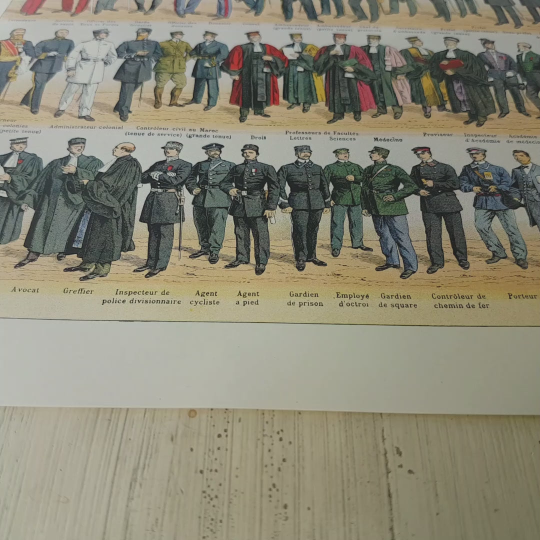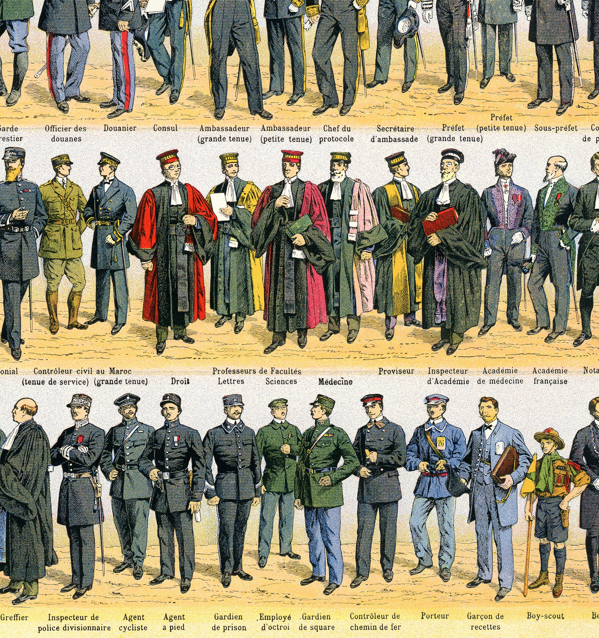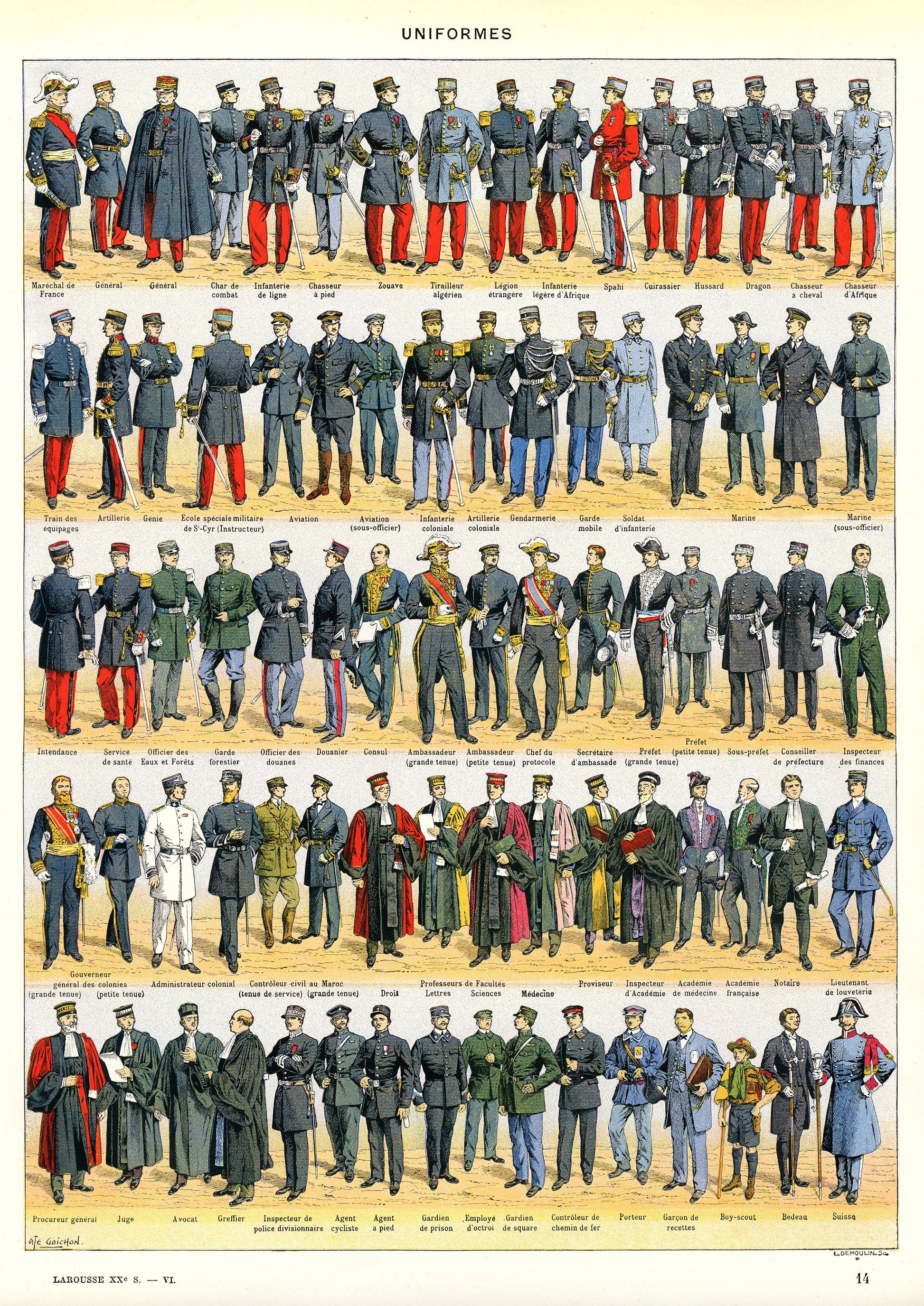 It shows all kinds of uniforms used in France in the first quarter of the 20th century, from the army to the navy to the civilian civil servants, including for example professors, lawyers, doctors, notaries, train drivers, ambassadors, customs officers or even boy scouts.