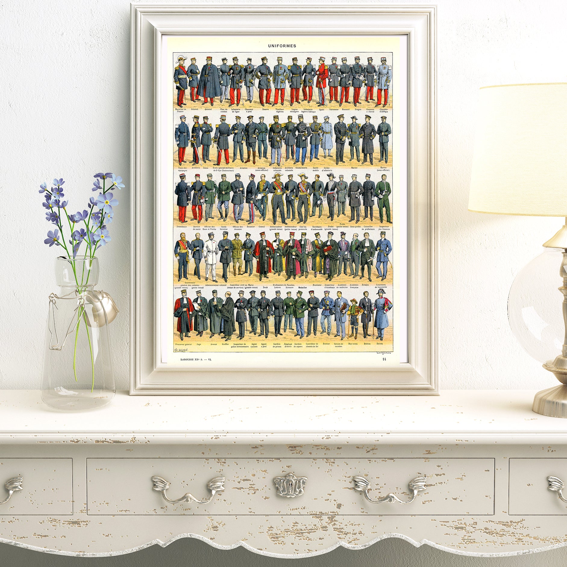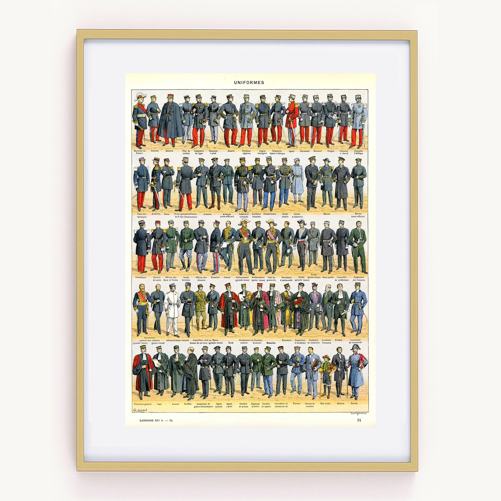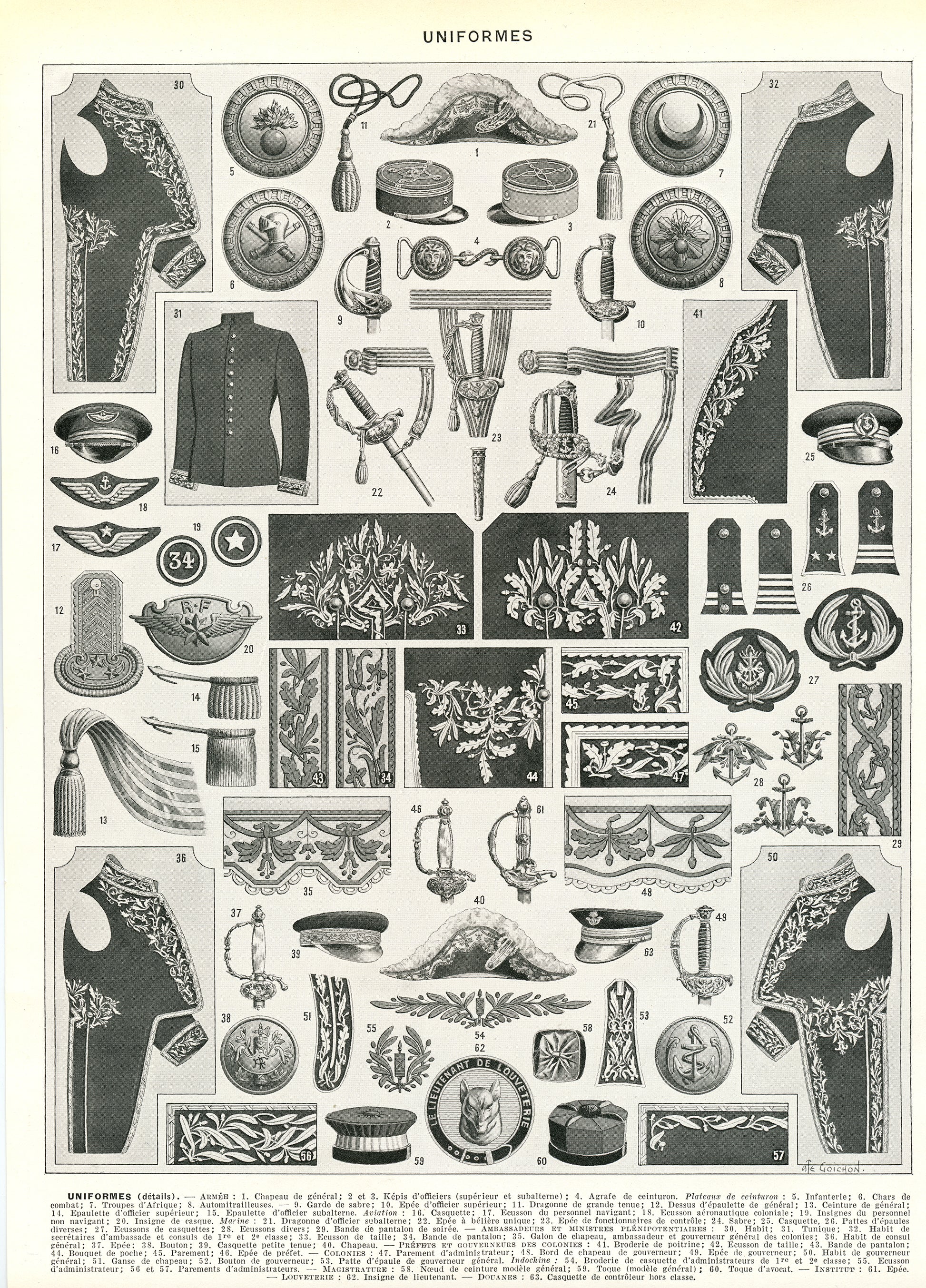 Delightful book page Β from 1936, which illustrated the Uniforms article of a French Larousse dictionary (uniformes in French). Β