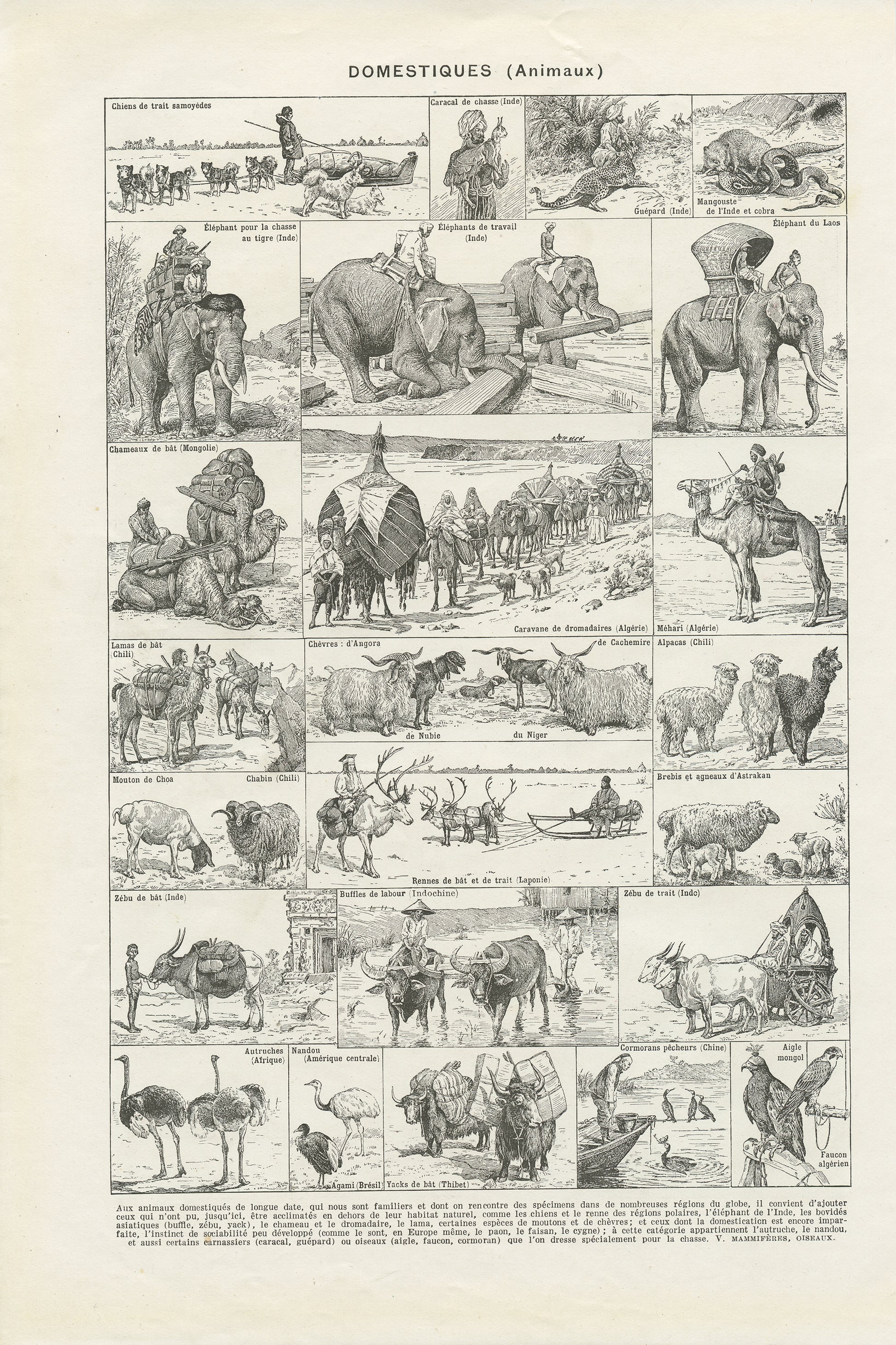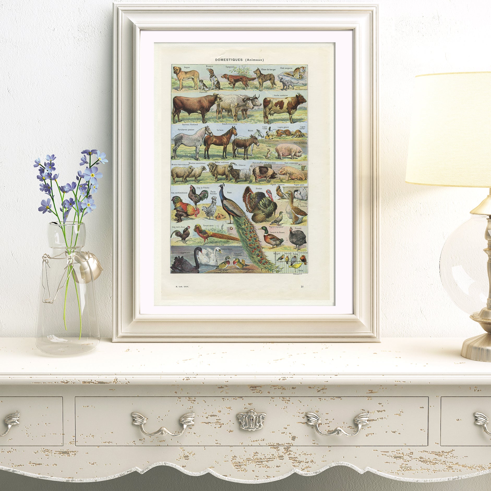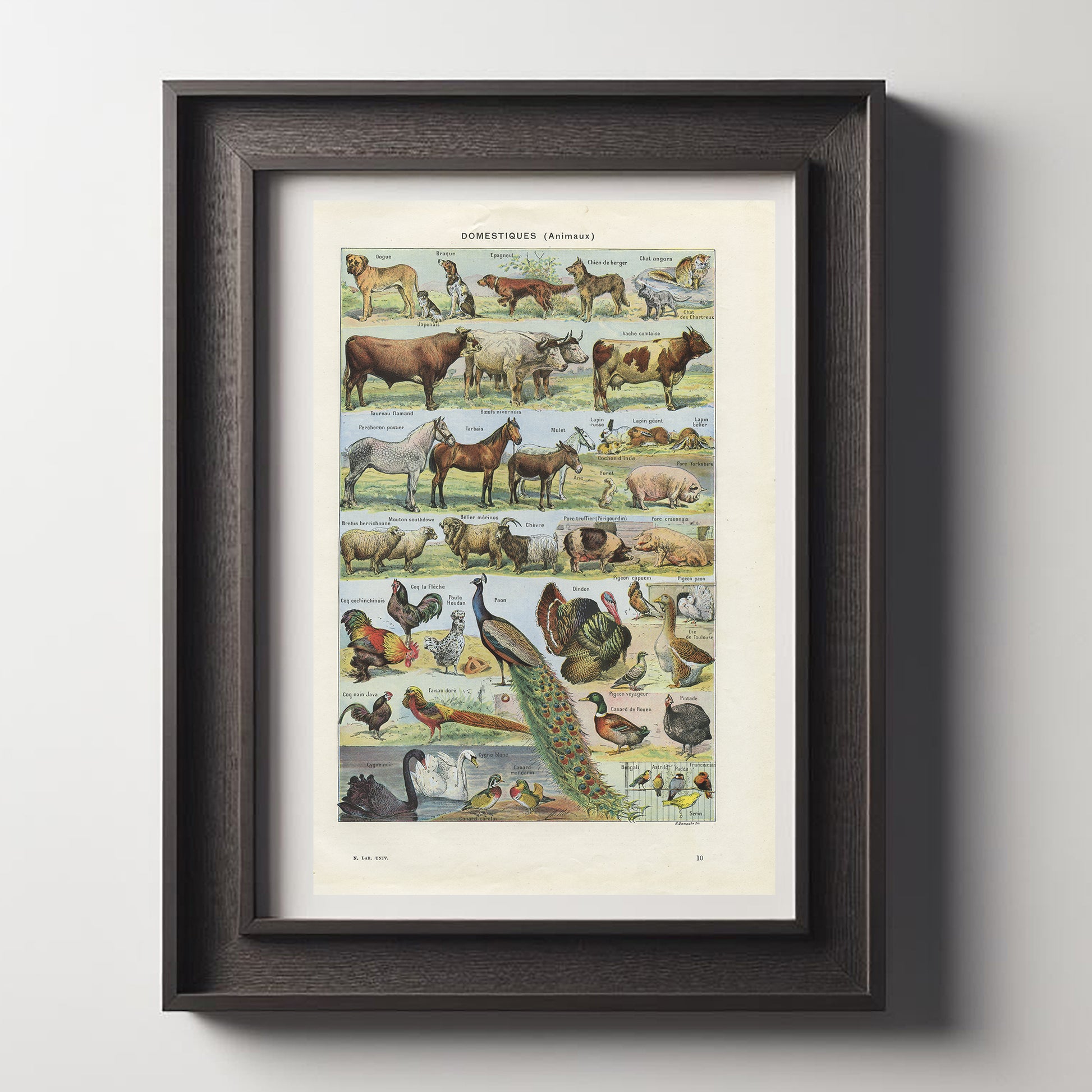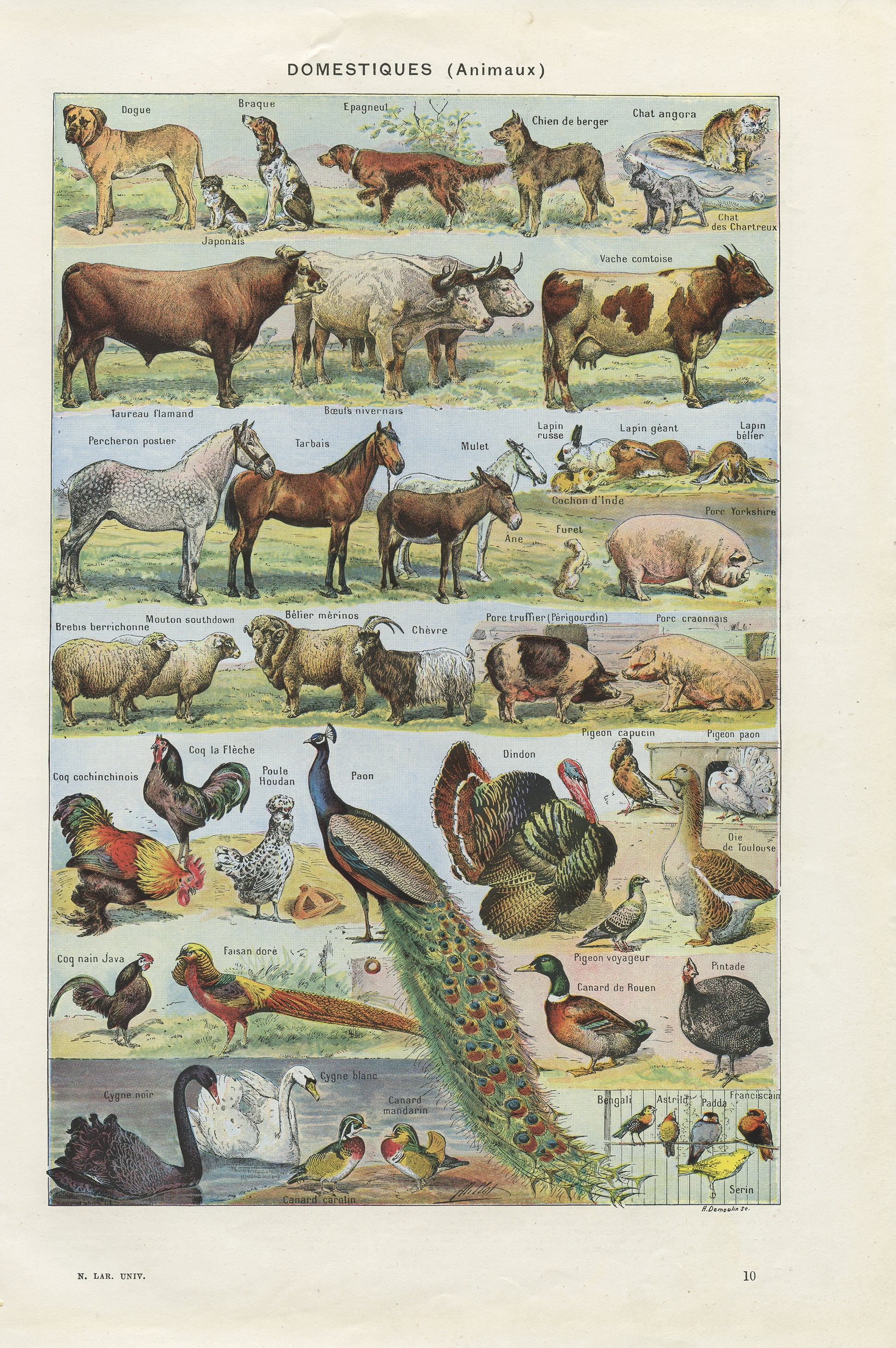 French antique animals print, which illustrated the "Animaux domestiques" (domesticated animals in French) article of a 1948 French Larousse dictionary. This vintage animals poster shows in lovely colors a multitude of farm animals and pets, including dogs, horses, chicken and many others. Did you know that peacocks or pigeons were considered domestic animals?