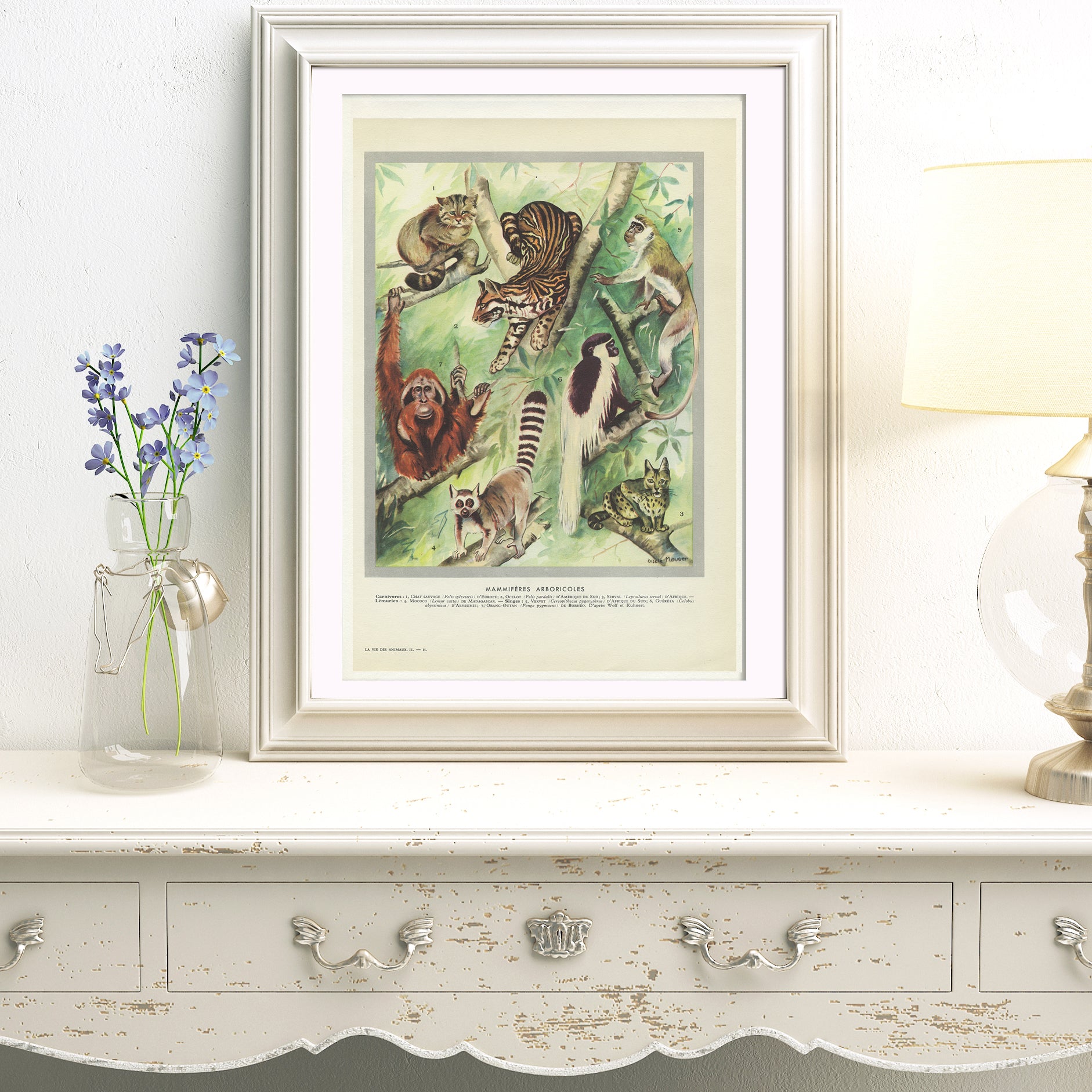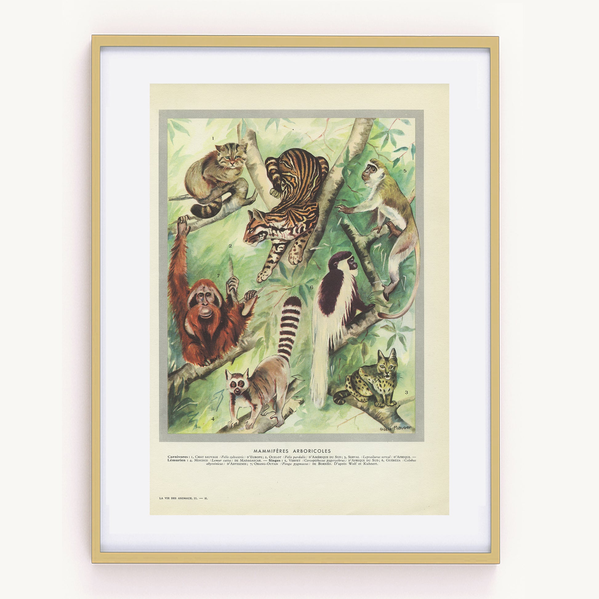 Vintage animal print showing arboreal mammals. Tree-living wild animals include wildcats, ocelot, serval, ring-tailed lemur, a couple of examples of monkeys and the Orang-utan