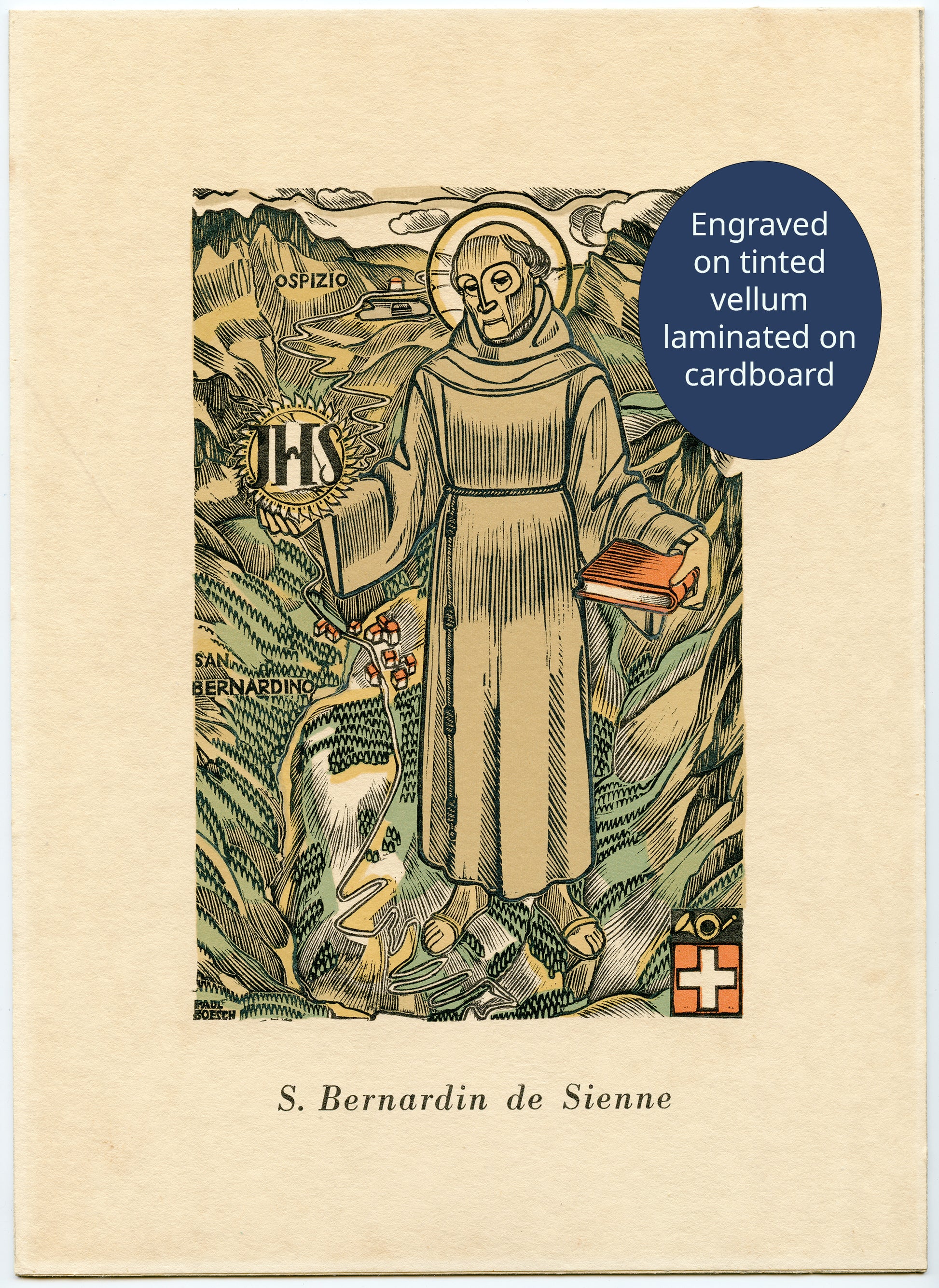 Here is a little gem, a vintage religious engraving of Saint Bernardino of Sienna by Swiss heraldic painter Paul Boesch. This antique illustration comes from a 1950s series of high quality Swiss saints engravings.
