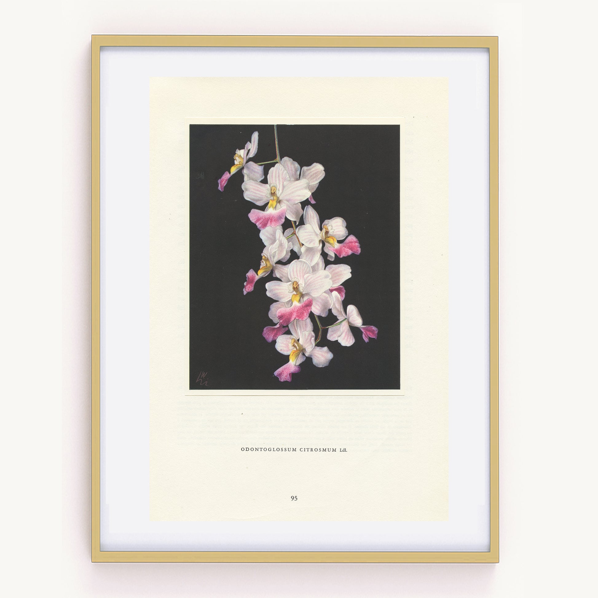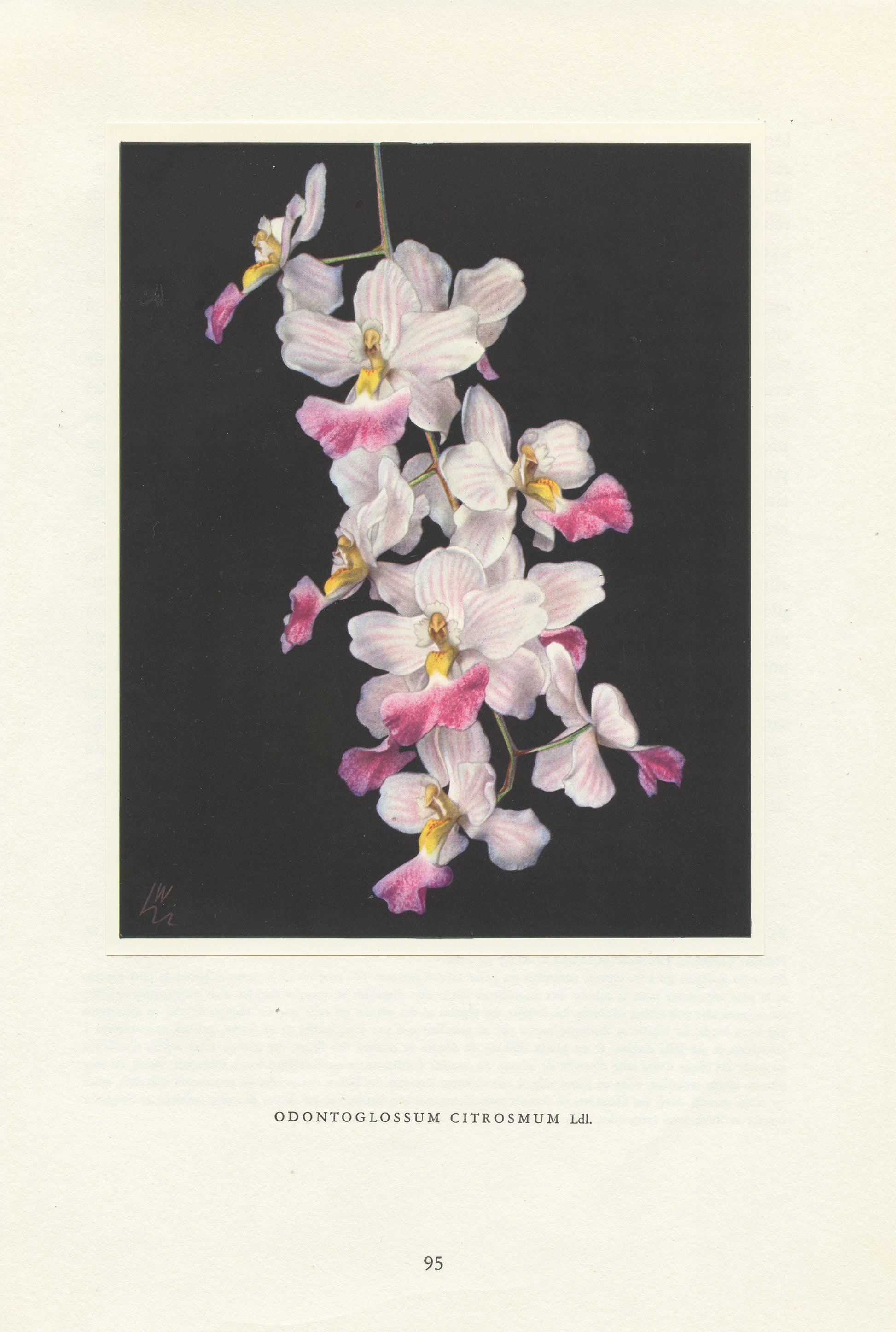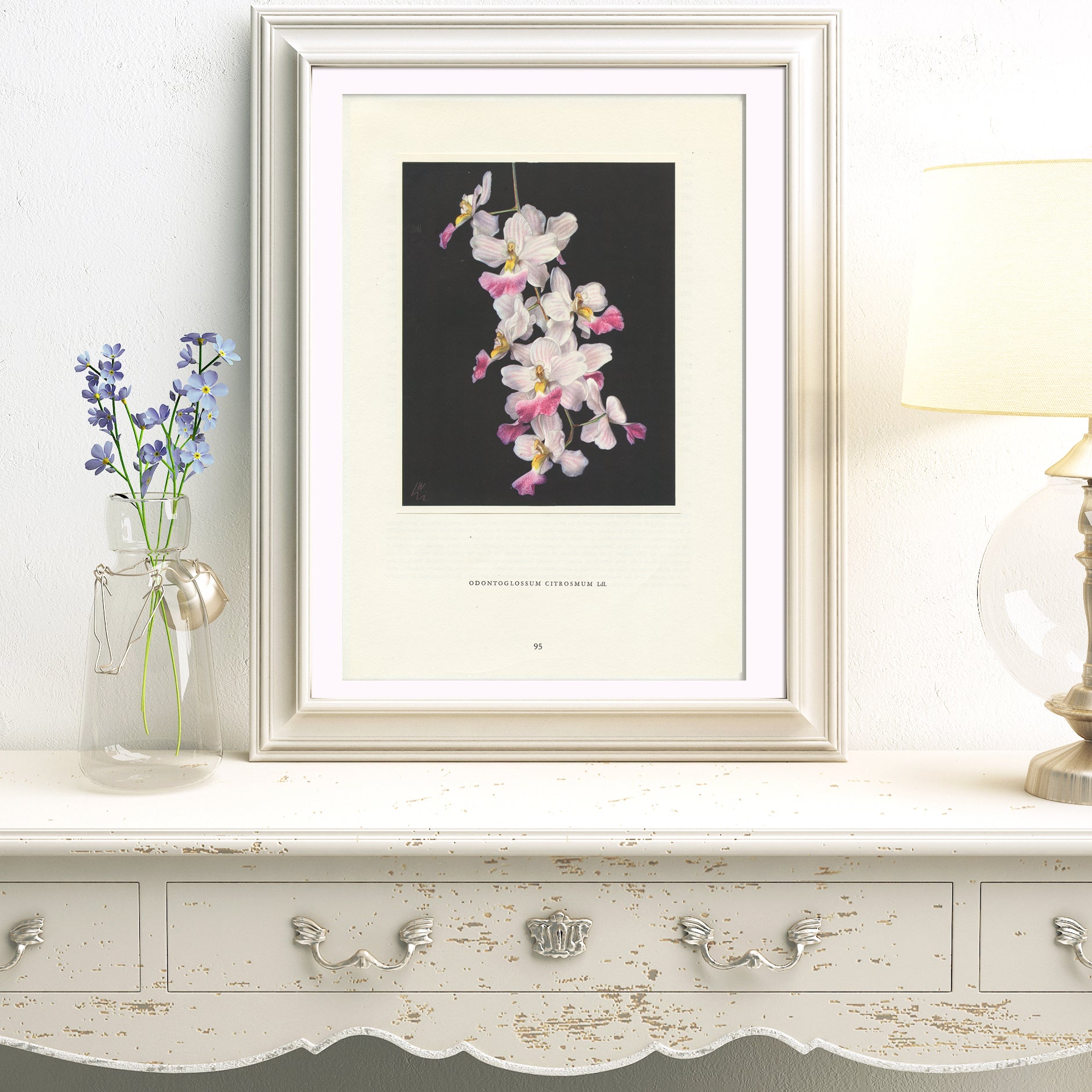 This lovely botanical illustration shows the spectacular pale pink Odontoglossum Citrosmum orchid on a black background, also known as Cuitlauzinia pendula. These prints are so realistic that it almost looks like a photograph. This orchid antique print is from a 1953 out-of-print French book entitled "Orchidées", illustrated with maestria by Walter Linsenmaier.