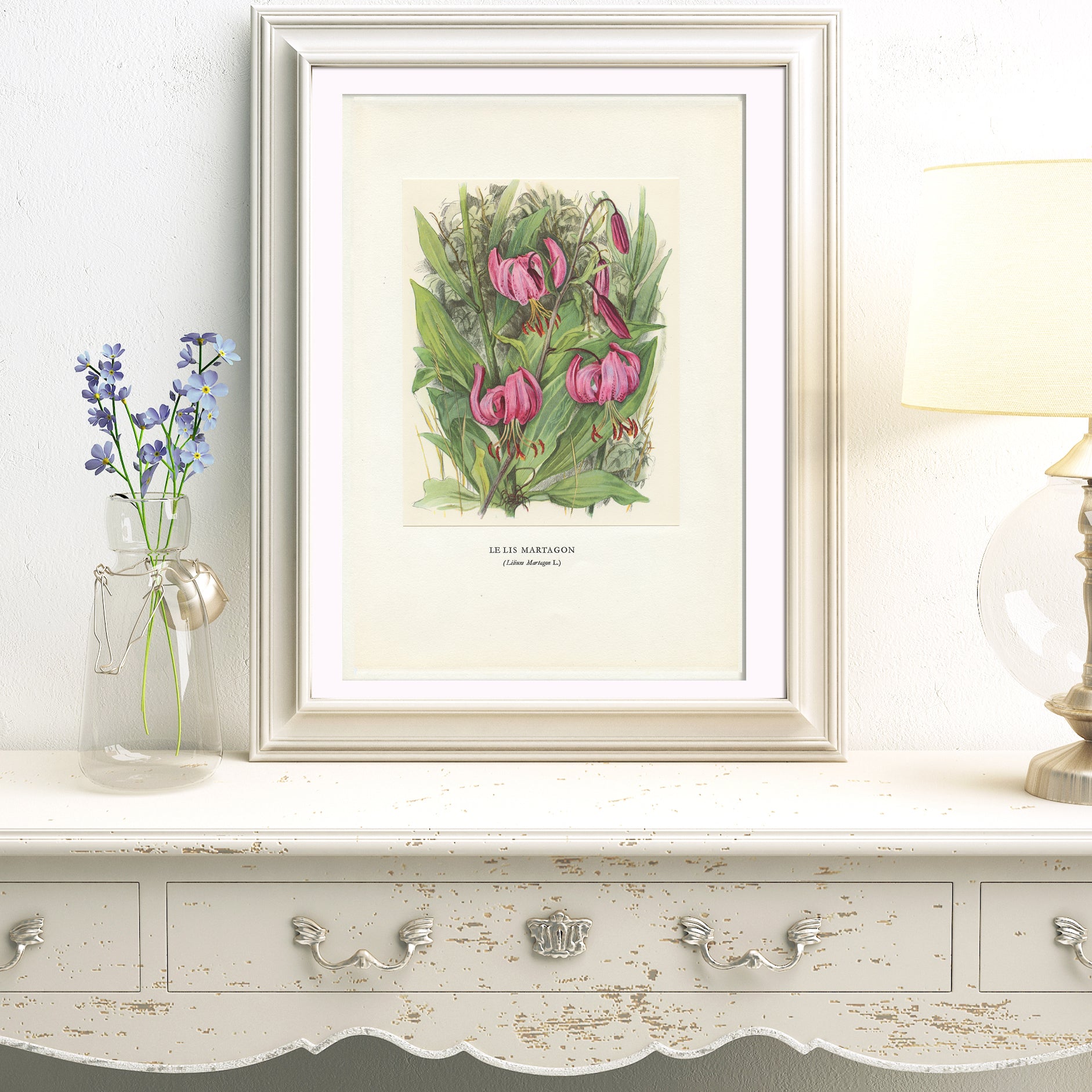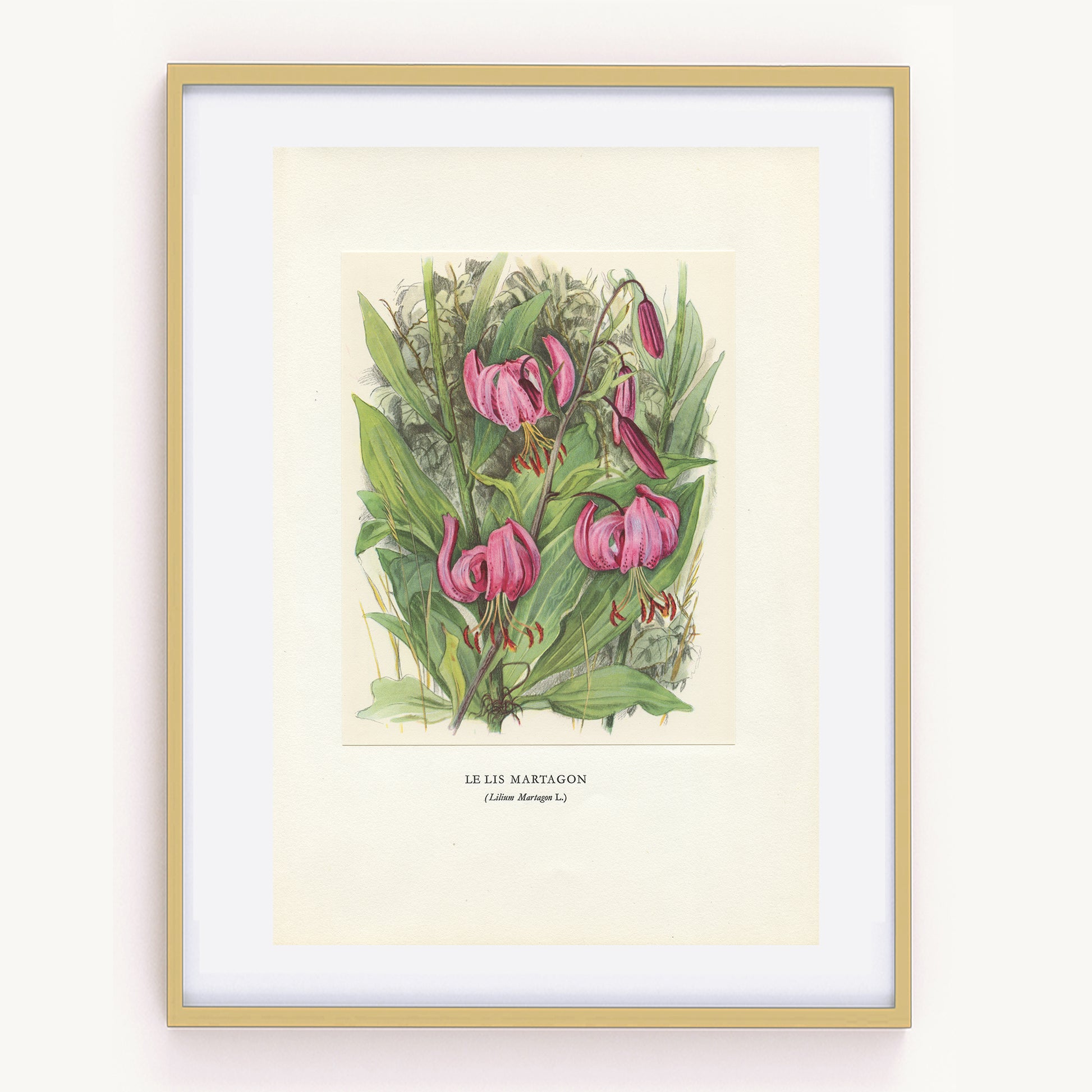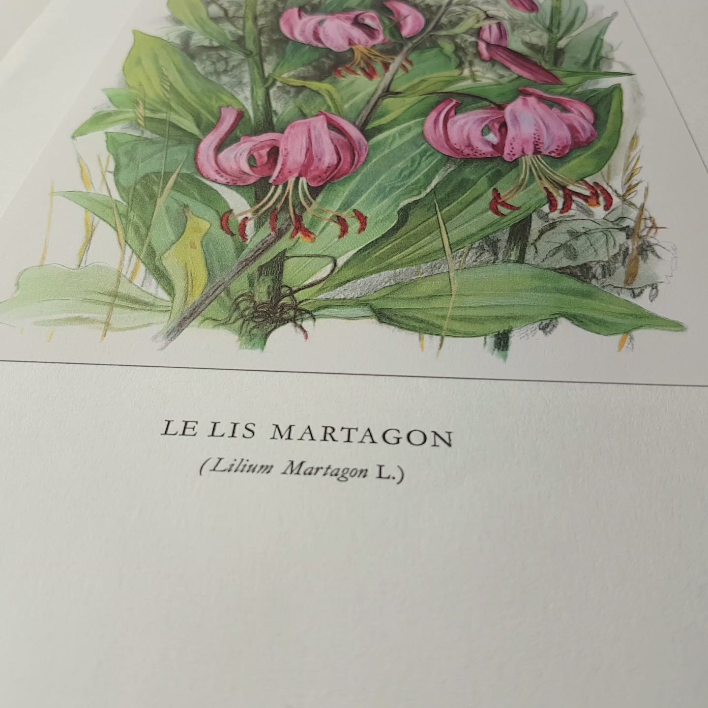 This lovely lily flower botanical poster comes from an out-of-print Swiss book from 1959 in French called "Les fleurs de nos montagnes", which translates to "Flowers from our mountains", illustrated by O. and M. Baumberger.