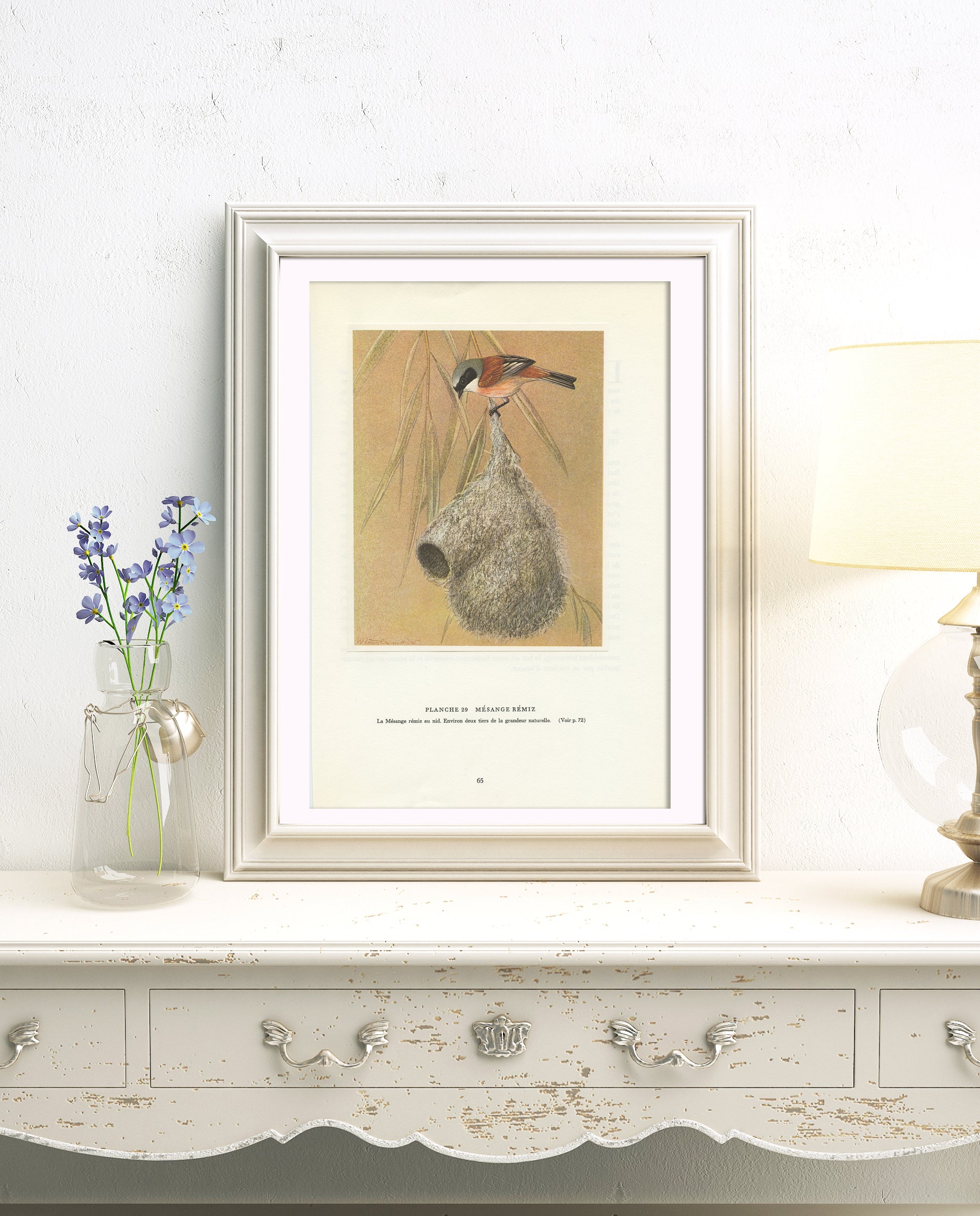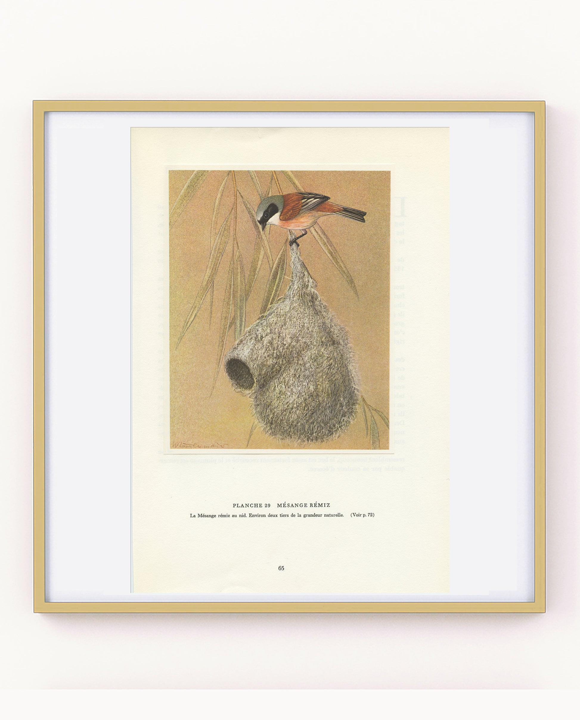 Lovely French vintage bird poster, showing the Eurasian penduline tit on her very specific hanging nest at about 2/3 of their real life size. This bird is also known as the Remiz tit, which is the Polish word for that species. Isn't that nest architecture amazing for such a small bird?