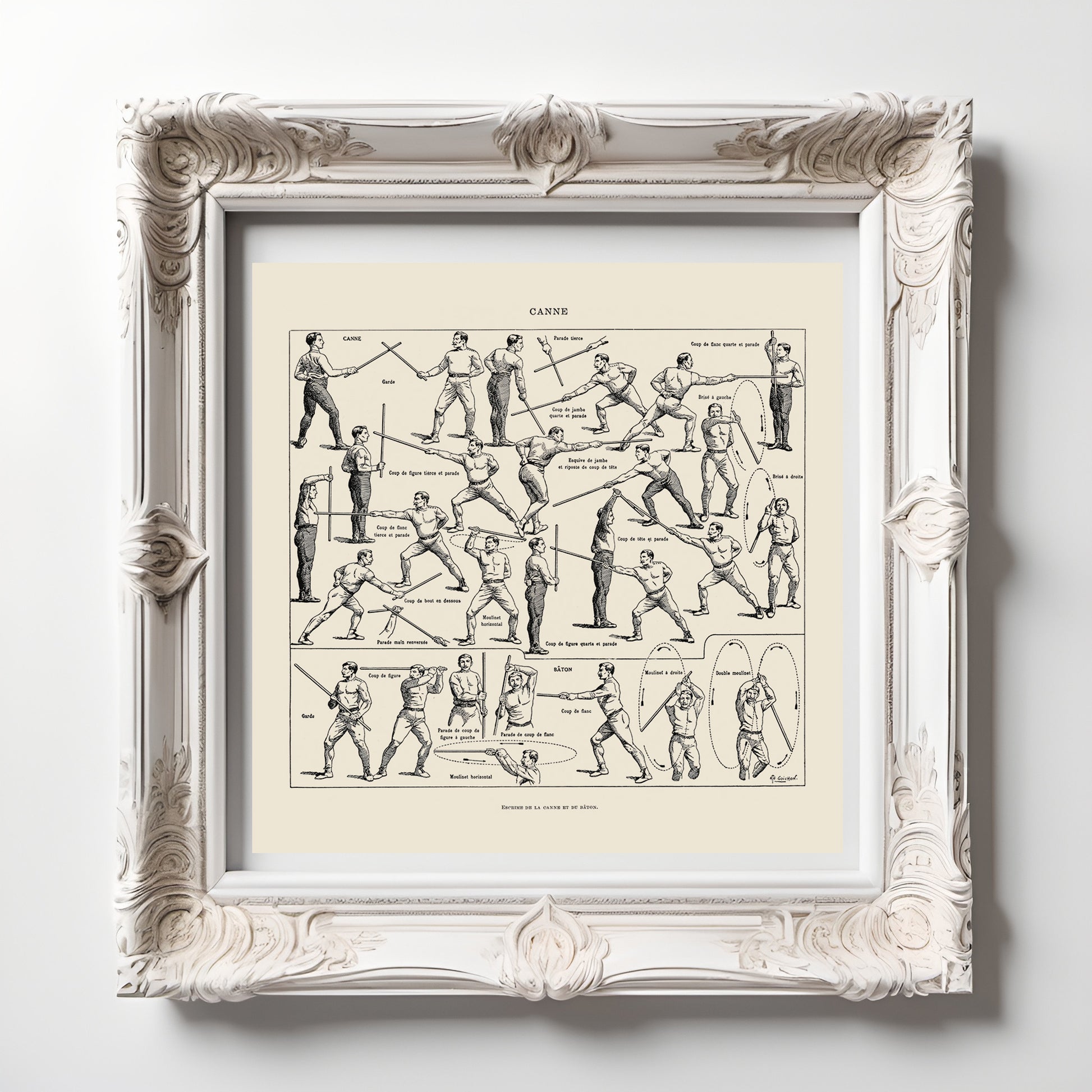 This is a high-quality contemporary reproduction of an antique dictionary plate, which illustrated the "Canne / Bâton" article (cane / stick in French). Each picture shows a different position or technique and is identified by their French name right next to the drawing. Stick fighting used to be very popular in Europe up to the 20th century and our own version of Asian martial arts.